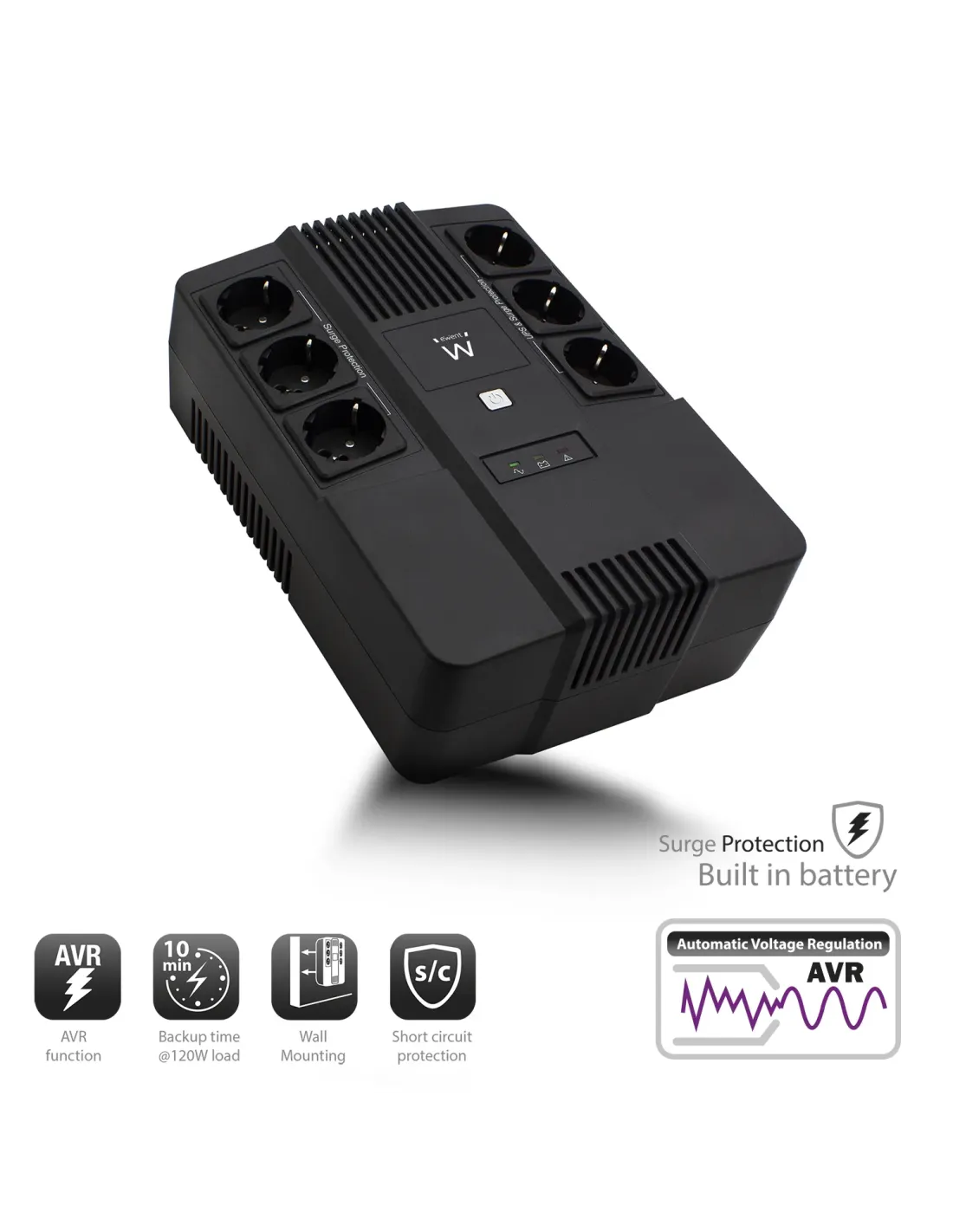 Proteja su PC y archivos valiosos contra fallas de alimentación y sobretensiones con el SAI Línea Interactiva de 600 VA EW3945 con AVR y protección contra sobretensiones. El SAI está equipado con 6 tomas de salida. El SAI le notifica con una alarma sonora y una notificación de LED durante un corte de alimentación. Le proporciona aproximadamente 10 minutos adicionales de carga de 120 W para guardar sus archivos y apagar su PC de manera segura. El EW3945 le protege frente a sobretensiones, cortocircuitos, descargas, excesos de carga y sobrecargas. El SAI se puede montar en la pared.Potencia de respaldo de aprox. 10 minutos a 120 W de cargaEl SAI Línea Interactiva de 600 VA EW3945 tiene 6 tomas de corriente conectadas a tierra para proteger su PC y archivos valiosos contra fallas y sobrecargas de alimentación. Tiene tres tomas de salida están equipadas con una batería de respaldo y protección contra sobretensiones. Las otras tres tomas de salida tienen protección contra sobretensiones. La batería incorporada del SAI Línea Interactiva le permite guardar sus archivos en aproximadamente 10 minutos a una carga de 120 W. La tensión de salida se mantendrá estable gracias a la función AVR.Notificaciones sonoras y LED durante fallo de alimentación.El SAI le notifica con una alarma sonora y una notificación de LED durante un corte de alimentación. El SAI también le notifica cuando la batería incorporada se está quedando sin carga. Los LED incorporados de estado le muestran el estado. El EW3945 le protege frente a sobretensiones, cortocircuitos, descargas, excesos de carga y sobrecargas.Fácil de conectarEs muy fácil conectar un PC u otro dispositivo alimentado al EW3945. Simplemente coloque el enchufe de alimentación del PC u otro dispositivo en la toma de corriente del EW3945. El SAI Línea Interactiva se puede montar en la pared y tiene un cable desmontable.- El SAI Línea Interactiva de 600 VA , con un tiempo de respaldo de aproximadamente 10 minutos a una carga de 120 W- Alarma sonora y LED de notificación durante un fallo de alimentación, con LEDs de estado- 6x conectores UE de salida con toma de tierra tipo F con protección contra sobretensiones, de los cuales 3x están equipados con una batería de respaldo- Entrada: 1x IEC C14 con cable extraíble- Protección frente a sobretensiones, cortocircuitos, descargas, excesos de carga y sobrecargas- Adecuado para montura de pared- La Función AVR permite estabilizar el voltaje de entrada