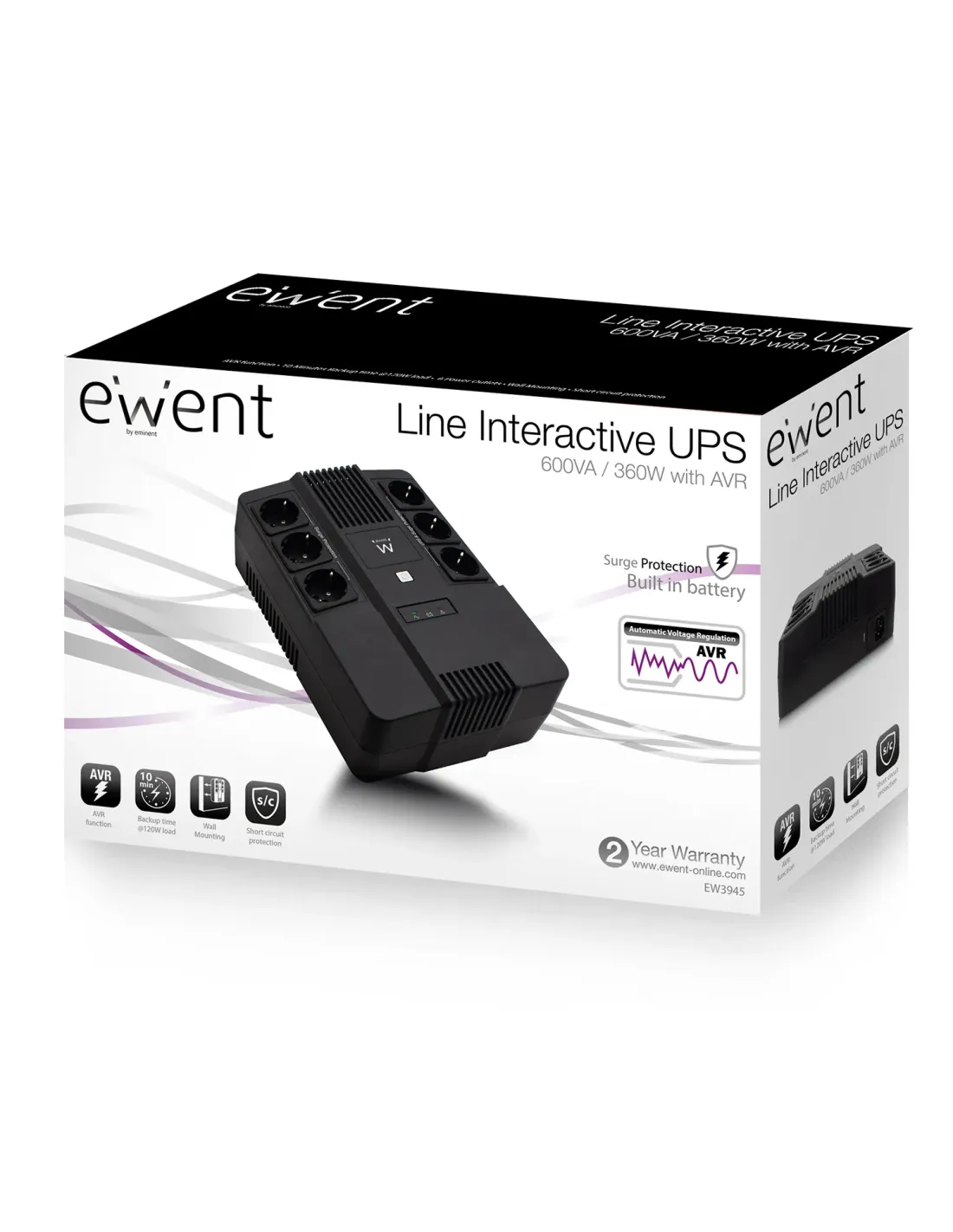 EWENT UPS 600VA LINE INTERACTIVE WITH AVR, 6 X CEE7/3 PORT