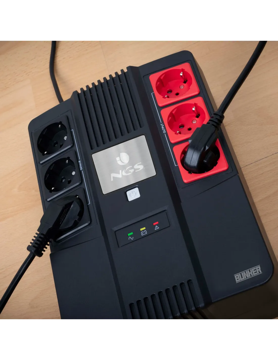 NGS Fortress Bunker, es un SAI (sistema de alimentación ininterrumpida) de 600VA (360W) con batería de 12V/7 incorporada que asegura protección eléctrica completa en entornos ofimáticos neutralizando las nefastas consecuencias de las sobrecargas en la red y variaciones de tensión.