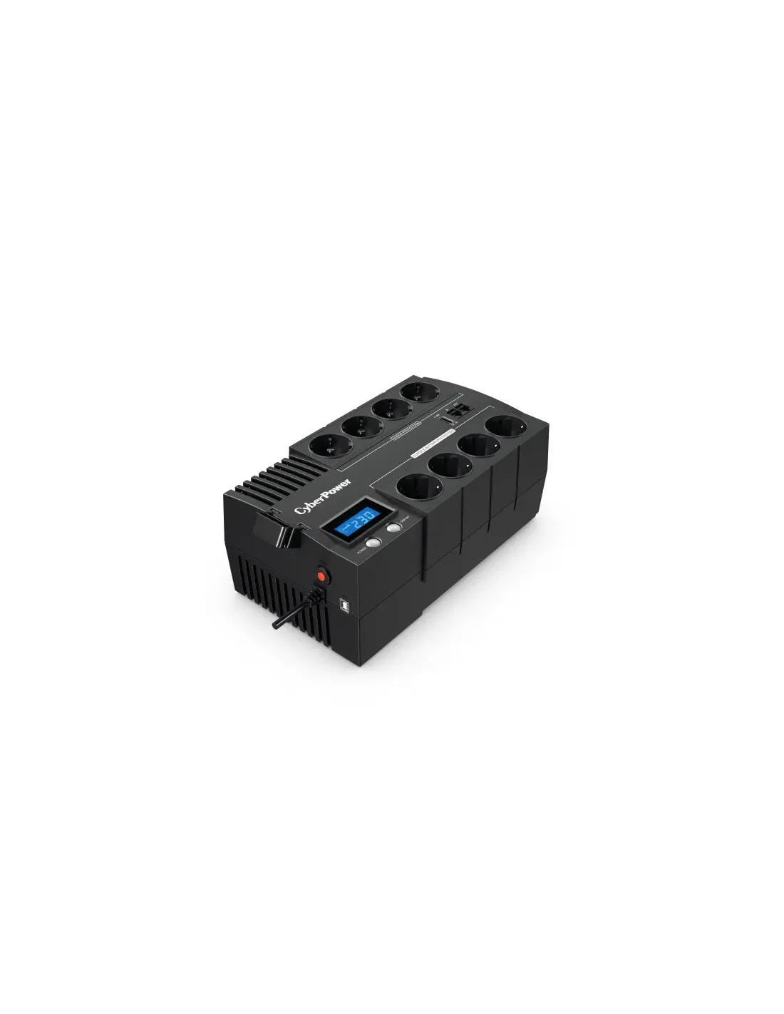 CyberPower BR1200ELCD. Topología UPS: Línea interactiva, Capacidad de potencia de salida (VA): 1,2 kVA, Potencia de salida: 720 W. Tipo de salida AC: Tipo F, Cantidad de salidas AC: 8 salidas AC, Tipo de puerto USB: USB tipo A. Tecnología de batería: Sealed Lead Acid (VRLA), Voltaje de la pila: 230 V, Tiempo típico de respaldo a carga completa: 2 min. Factor de forma: Escritorio, Color del producto: Negro, Material de la carcasa: Plástico. Certificados de conformidad: CE, EAC, RoHS