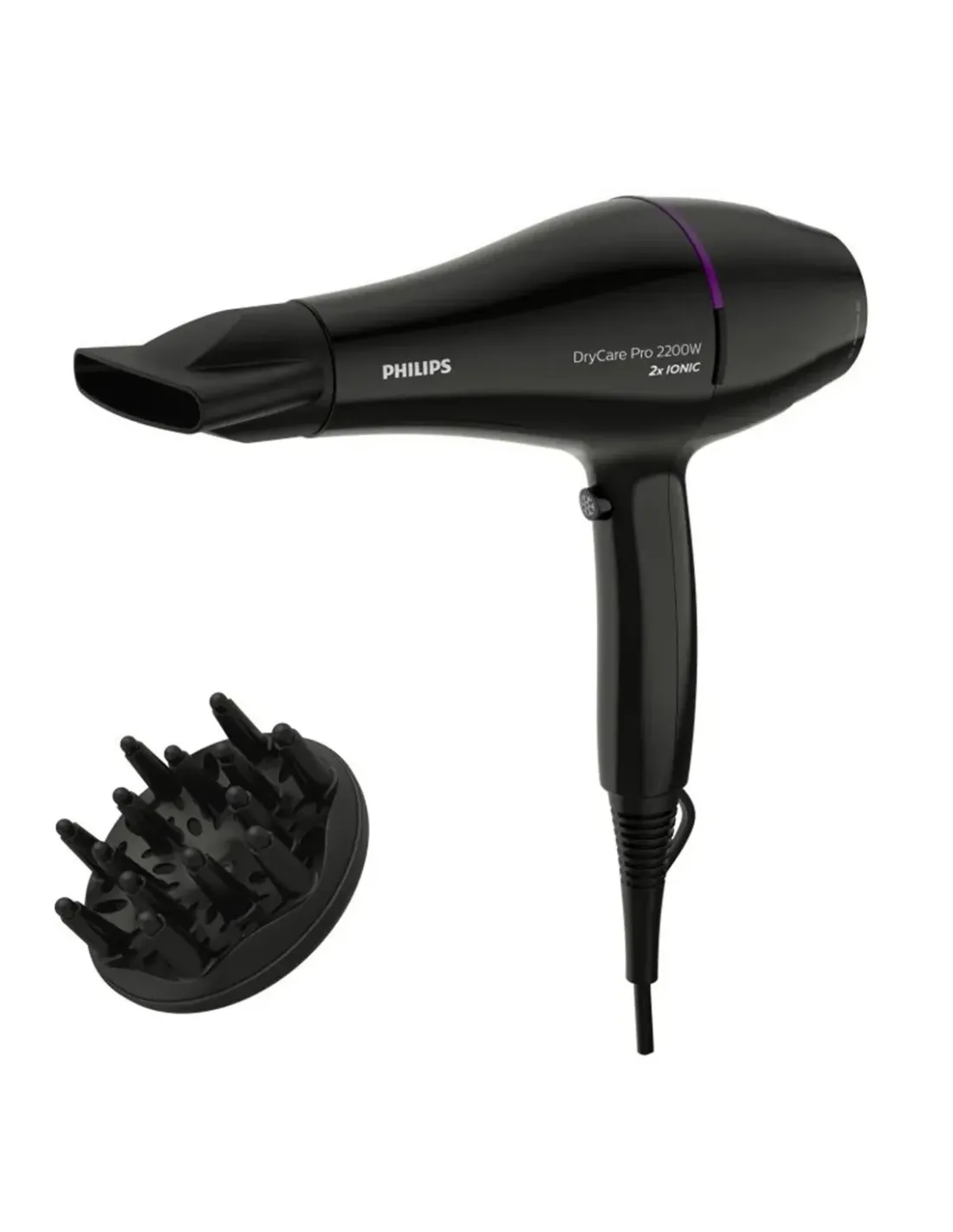 El secador Philips Pro dispone de un motor CA profesional que permite una velocidad del aire de hasta 130 km/h* para obtener resultados rápidos y profesionales. También incluye el ajusteThermoProtect para obtener una temperatura óptima y protegerla del sobrecalentamiento.CaracterísticasSecado rápido, potente Motor AC: El secador Philips Pro cuenta con un motor de AC de alto rendimiento desarrollado para el mercado profesional. Genera hasta 130 km/h de velocidad del aire paraofrecer unos resultados rápidos eficaces.2200 W de potencia de secado rápido de alto rendimiento: Este secador Pro de 2200W crea un flujo de aire muy potente. El resultado de la combinación de potencia y velocidad hace que secar y peinarel cabello sea más fácil y rápido.Ajuste de temperatura ThermoProtect: El ajuste de temperatura ThermoProtect proporciona la temperatura de secado óptima y ofrece mayor protección frente al sobrecalentamiento del cabello. Disfrutadel mismo flujo potente de aire y consigue unos resultados óptimos, sin descuidar la salud de tu cabello.Más del doble de iones para un cabello brillante y sin encrespado: Los iones con carga negativa eliminan la electricidad estática, acondicionan el cabello y suavizan las cutículas para intensificar subrillo. El resultado es un cabello suave y sin encrespado con un atractivo brillo. El cuidado iónico se basa en un ionizador avanzado que libera el doble de iones** que un ionizador estándar, lo que permiteque cada mechón de cabello reciba los iones desde todos los ángulos.Aire frío que fija el peinado: Una función profesional imprescindible, el botón de aire frío proporciona un chorro intenso de aire frío. Se utiliza después de peinarse para dar los últimos retoques y fijar elpeinado.Seis ajustes de velocidad y calor para un control óptimo: La velocidad y el calor necesarios pueden ajustarse fácilmente para crear un peinado perfecto. Las seis posiciones diferentes garantizan uncontrol óptimo para conseguir un peinado preciso y con personalidad.Concentrador de 9 mm para disfrutar de un flujo de aire dirigido para un peinado increíble: La abertura de 9 mm de la boquilla concentradora dirige el flujo de aire para dar forma con precisión en zonasespecíficas. Es el accesorio ideal para el cepillado durante el secado y el moldeado.El difusor aumenta el volumen para crear rizos y estilos con movimiento: El difusor de volumen distribuye el flujo de aire por el pelo, potenciando el volumen y reduciendo el encrespado durante elsecado. Para obtener los mejores resultados, mantén el difusor cerca de la zona de la coronilla y de la raíz. Las patillas con textura fina del difusor aportarán volumen, maximizarán el grosor, lasondulaciones y darán forma a los rizos.EspecificacionesDesempeñoNúmero de velocidades: 6Ajuste de calefacción: 6Tipo de Motor: Corriente alternaVelocidad del aire: 130 m/sFunción de disparo frío: SiFunción iónica: SiDiseñoColor del producto: NegroColoración de superficie: MonótonoDiseñado para viaje: NoTipo de colgador: Con agujero en la empuñadura para colgarMango plegable: NoLongitud del cable: 2 mControl de energíaPotencia: 2200 WVoltaje de entrada AC: 220 VFrecuencia de entrada AC: 50/60 HzPeso y dimensionesPeso: 728 gContenido del embalajeBoquilla concentradora: SiAltura de la boquilla estrecha: 9 mmDifusor de la boquilla: Si