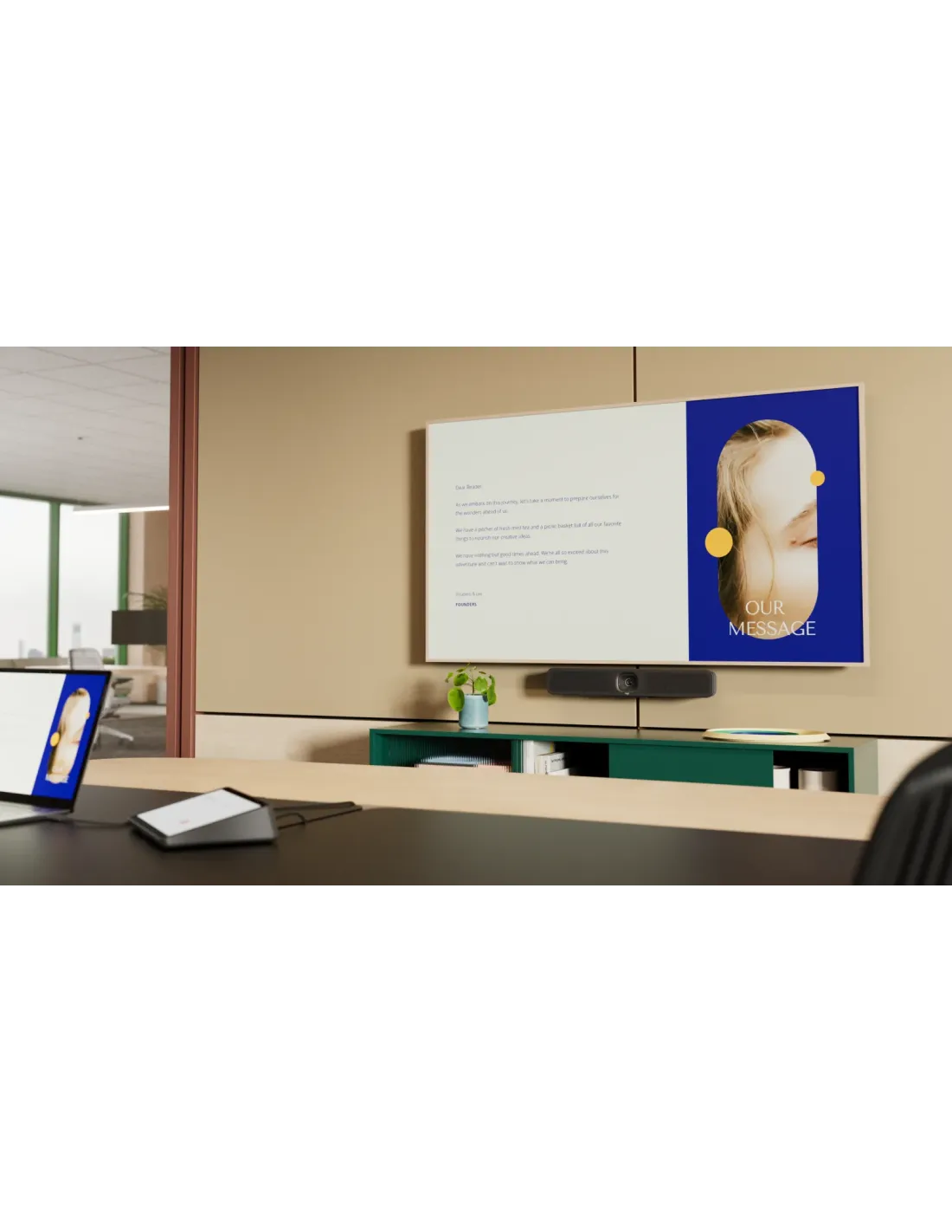 - DIMENSIONES Y PESO Altura: 73,3 mm Anchura: 469,2 mm Profundidad: 73 mm Peso: 1,8 kg - COMPONENTES INTEGRADOS Matriz de 6 micrófonos DMIC Cámara PTZ digital 1 altavoz con puerto de rango completo Sistema de distribución y retención de cables Soporte múltiple Plataforma Logitech CollabOS Logitech RightSight 2 Logitech RightSound 2 - ESPECIFICACIONES GENERALES Carcasa: Todo en uno Gestión de dispositivos: Logitech Sync Pantallas admitidas: - Modo BYOD: 1 - Modo de dispositivo informático dedicado: Depende del dispositivo/aplicación Resolución de pantalla: 1080p Compatibilidad con protocolo de red: IPv4, IPv6 Compatibilidad de proxy: Proxy basado en IP, Proxy basado en FQDN, Proxy usando archivo PAC - CÁMARA Panorámica digital: ±48° con zoom de 4 aumentos Inclinación digital: ±32° con zoom de 4 aumentos Zoom: Digital HD de 4 aumentos Campo visual diagonal: 120° Campo visual horizontal: 113° Campo visual vertical: 80° Resolución: 4K - ALTAVOCES Controlador: 55 mm con carcasa con reflector de graves y diseño de suspensión patentado Sensibilidad: 83 dB SPL a 1 W +/-2 dB a 1 metro Potencia nominal: 8 W THD a 1 W, 1 kHz: <,2 % Frecuencia de muestreo de altavoz: 48 kHz Impedancia: 4 ohmios - MICRÓFONOS Respuesta de frecuencia: 90 Hz - 16 kHz Sensibilidad: >,-36 dBFS +/-1 dB a 1 Pa Velocidad de salida de datos de micrófono: 48 kHz Radio de captación: Hasta 7 m Elementos de formación de haces: 6 micrófonos omnidireccionales digitales MEMS con 5 haces acústicos adaptativos de radiación transversal Procesamiento de audio: AEC (Acoustic Echo Cancellation), VAD (Voice Activity Detector) Supresión de ruido: Algoritmo de cancelación de ruido basado en IA - INTERFACES Salida HDMI: 1 Entrada HDMI: 1 USB: 1 USB 3.1 tipo C Red: Ethernet 10/100/1G WiFi: 802.11a/b/g/n/ac Bluetooth: Bluetooth de bajo consumo - ALIMENTACIÓN Y CABLES Fuente de alimentación: Detección automática Voltaje de servicio: 100-240 V, 19 V, 2,1 A Dimensiones de fuente de alimentación: 114 × 47 × 32,3 mm Cable de CC: 3 m Cable USB-C a USB-C 3.0: 3 m - CONDICIONES AMBIENTALES Temperatura de funcionamiento: 0 °C a 40 °C Temperatura de almacenamiento: -25 °C a 70 °C Humedad: 10 % a 90 % - SEGURIDAD Cifrado basado en archivos: Puerto USB disponible Cifrado de datos: Claves simétricas, infraestructura de clave pública (PKI) Identidad de dispositivos: Protección mediante atestación de estado de dispositivos Acceso a dispositivos: Autenticación mediante API Protección mediante clave: Arm TrustZone, RPMP Seguridad física: Conector de seguridad Kensington