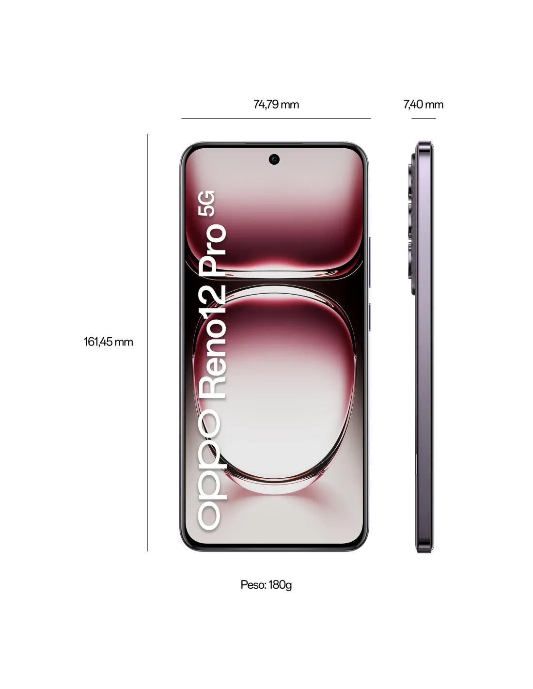 OPPO Reno 12 Pro. Diagonal de la pantalla: 17 cm (6.7"), Resolución de la pantalla: 2412 x 1080 Pixeles. Frecuencia del procesador: 3 GHz, Familia de procesador: MediaTek, Modelo del procesador: 7300. Capacidad de RAM: 12 GB, Capacidad de almacenamiento interno: 512 GB. Resolución de la cámara trasera (numérica): 50 MP, Tipo de cámara trasera: Triple cámara. Capacidad de la tarjeta SIM: SIM doble. Sistema operativo instalado: Android 14. Capacidad de batería: 5000 mAh. Color del producto: Negro. Peso: 180 g