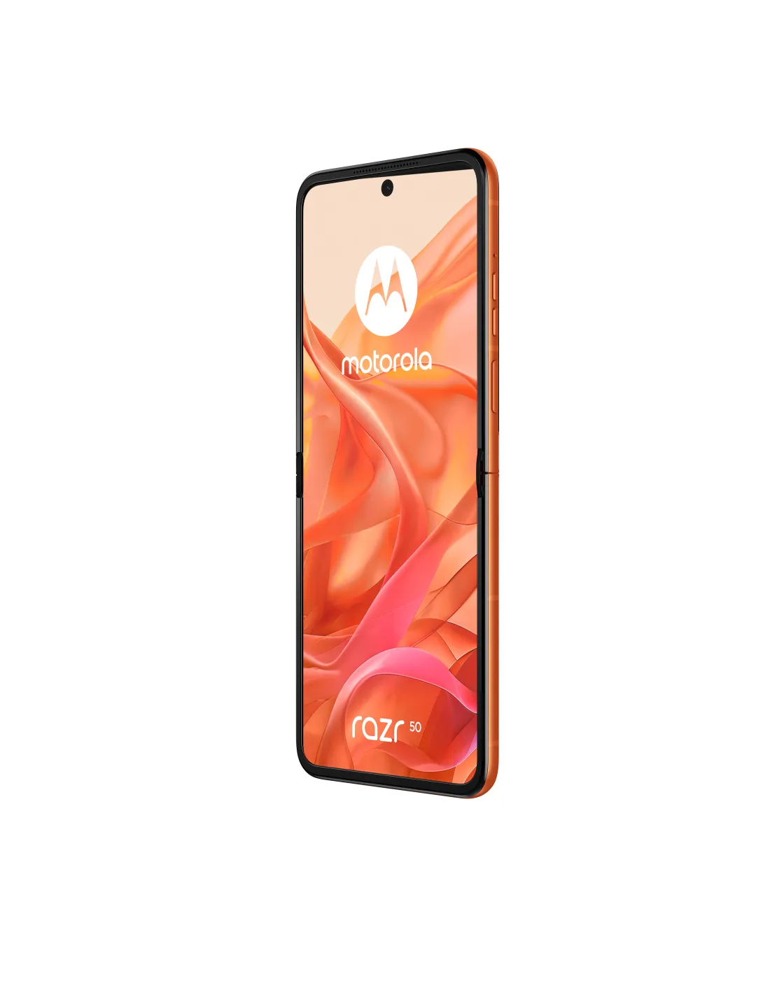 Motorola razr 50. Diagonal de la pantalla: 17,5 cm (6.9"), Resolución de la pantalla: 2640 x 1080 Pixeles. Familia de procesador: MediaTek, Modelo del procesador: 7300X. Capacidad de RAM: 8 GB, Tipo de RAM: LPDDR4X, Capacidad de almacenamiento interno: 256 GB. Resolución de la cámara trasera (numérica): 50 MP, Tipo de cámara trasera: Cámara doble. Capacidad de la tarjeta SIM: SIM doble. Sistema operativo instalado: Android 14. Capacidad de batería: 4200 mAh. Color del producto: Naranja. Peso: 188 g