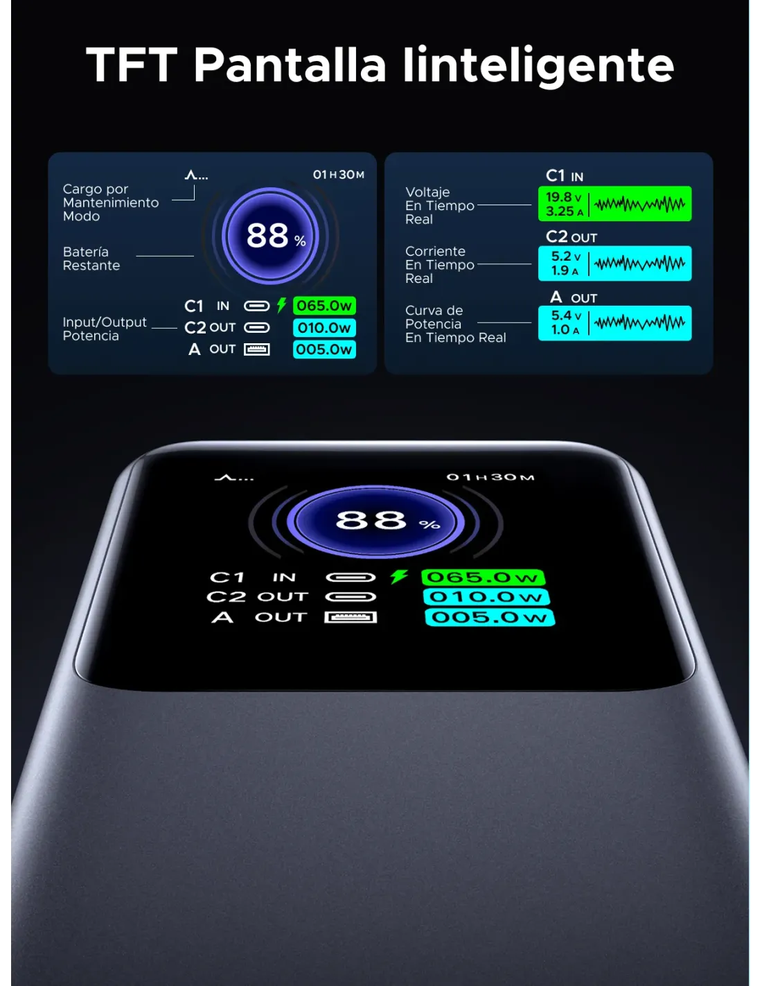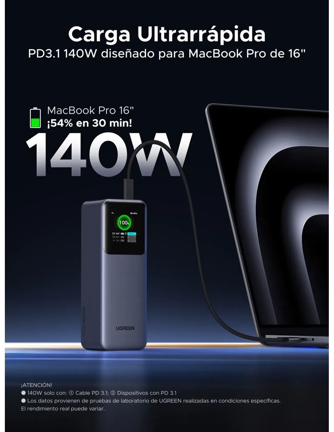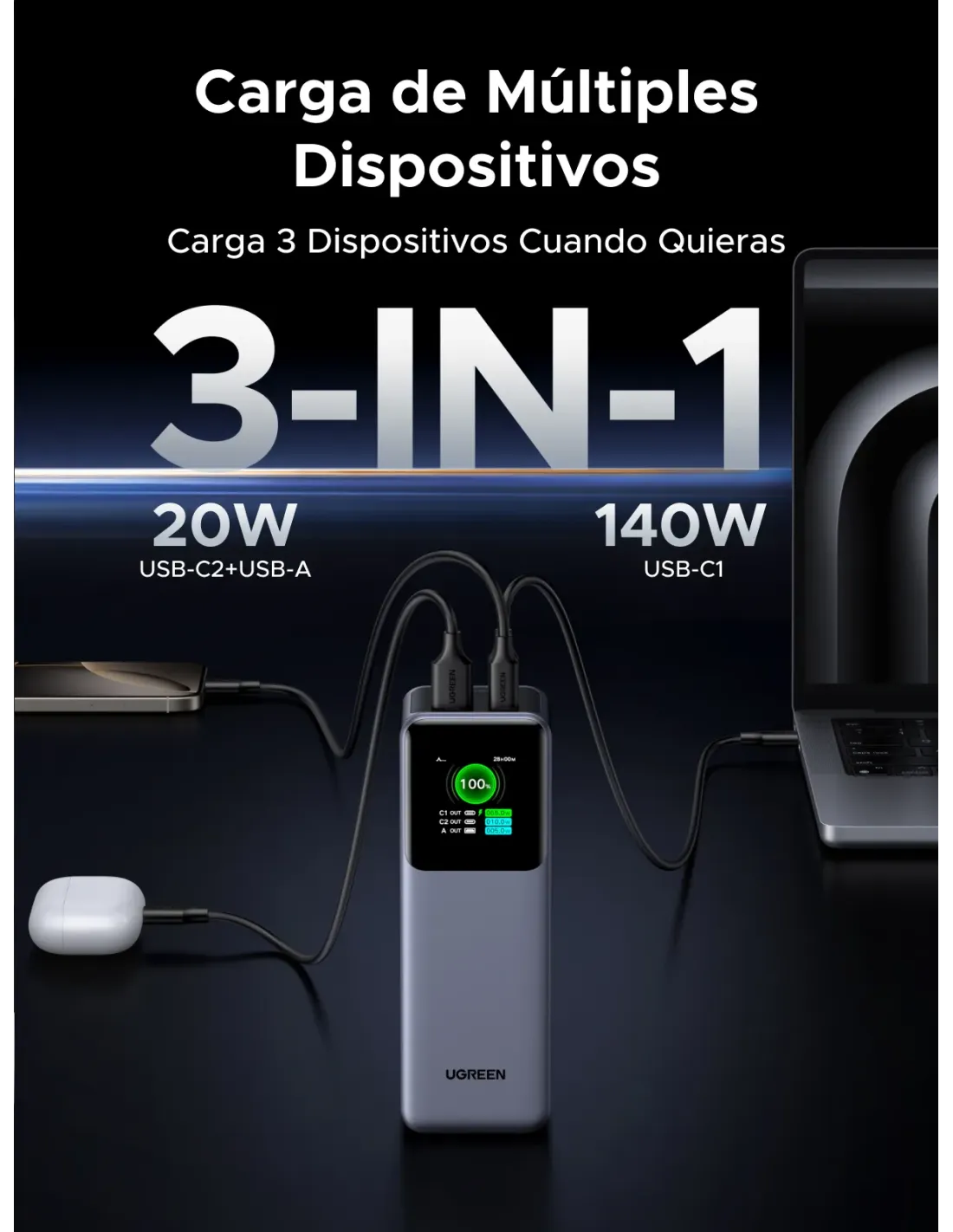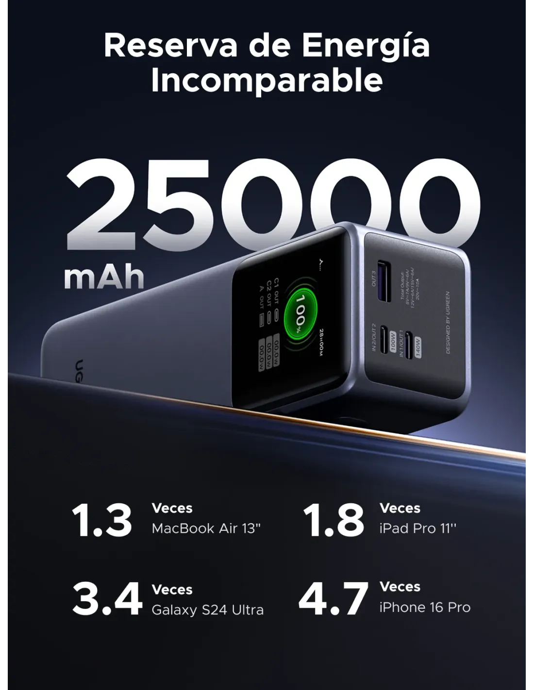 [Potência total de 200 W] o UGREEN power bank suporta uma potência total de até 200 W enquanto carrega vários dispositivos ao mesmo tempo. A porta USB C1 oferece uma potência máxima de 140 W e o C2 oferece uma potência de até 100 W.[Capacidade de 25000 mAh] Com a bateria externa UGREEN de 25000 mAh, pode carregar totalmente o MacBook Pro de 14" até 0,94 vezes, iPhone 16 até 5,2 vezes, Galaxy S24 Ultra até 3,6 vezes. Com um carregador de PD65W, demora 2 horas para carregar completamente.[Durável e seguro] Com várias proteções, a capacidade permanece acima de 80% após 800 ciclos de carga e descarga, tornando-o duradouro. O sistema integrado Ugreen Thermal Guard monitora as mudanças de temperatura em tempo real, distribuindo inteligentemente a corrente adequada aos dispositivos para carregamento total e maior longevidade da bateria.[Ecrã inteligente TFT] Exibição em tempo real do nível da bateria, tempo restante, potência de entrada/saída, tensão, corrente e outras informações, mostrando o charme da tecnologia. Em comparação com um ecrã LCD, o conteúdo do ecrã é mais delicado e as cores são mais ricas.[Ampla compatibilidade] Possui uma porta USB A e 2 portas USB C, que podem carregar 2 dispositivos ao mesmo tempo. É compatível com muitos dispositivos, como MacBook Pro/Air, HP, iPad Pro/Air, iPhone 16/16 Pro/16 Pro Max/15/15 Plus/15 Pro/15 Pro Max/14/13/12, AirPods Pro, Galaxy S24/S24+/S24 Ultra/23 Ultra/ S22/ S21, Pixel 9/9 Pro/9 Pro XL/8/7/6, etc.