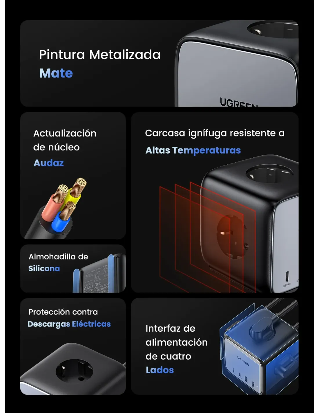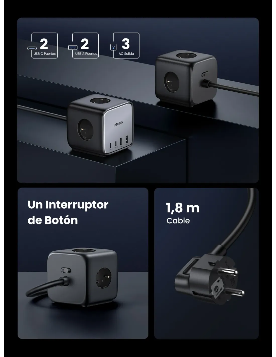 Ugreen DigiNest Pro. Cantidad de salidas AC: 1 salidas AC, Tipo de enchufe: Tipo C, Longitud de cable: 1,8 m. Potencia máx. de entrada: 3680 W, Voltaje de entrada AC: 100 - 240 V, Frecuencia de entrada AC: 50/60 Hz. Tipo de puerto USB: USB Type A/USB Type-C. Ancho: 137 mm, Profundidad: 58 mm, Altura: 85 mm