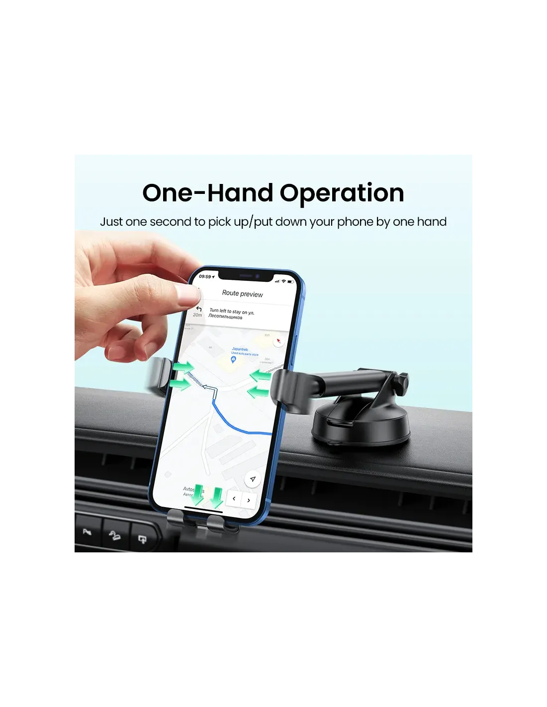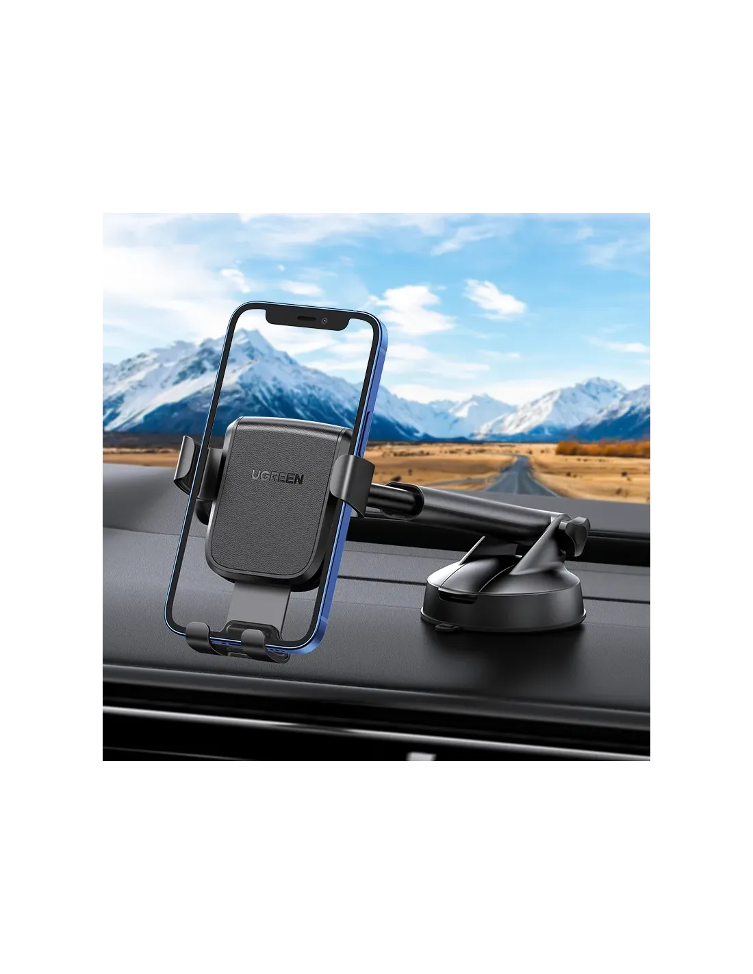 .Soporte de teléfono para salpicadero Ugreen - negroEl soporte para salpicadero de coche es un gran gadget para los amantes de los coches. Es increíblemente fácil de usar, solo tienes que poner el teléfono encima y apretar las mordazas para estabilizarlo en la posición seleccionada. El soporte tiene una amplia gama de ajustes y almohadillas de goma que protegerán tu teléfono de arañazos..Soporte más seguro y estable: el soporte para teléfono para automóvil mejorado de UGREEN está equipado con una ventosa agrandada, una almohadilla de gel adhesiva más fuerte y un botón de bloqueo al vacío. El mecanismo de triple bloqueo le brinda de manera efectiva un agarre más resistente y estable al parabrisas, tablero u otras superficies lisas del automóvil, sin preocuparse por caídas incluso en caminos con baches..Más flexible con brazo telescópico: el brazo largo mejorado se puede extender hasta 3.9 pulgadas como máximo y girar 220 grados libremente, lo que le permite ángulos de visión personalizados mientras conduce en la carretera..Sujete su teléfono firmemente: el soporte para teléfono del tablero está equipado con un clip de resorte extensible, sujetando su teléfono inteligente de manera más segura en caso de giro brusco, camino con baches o conducción rápida. Las almohadillas de silicona gruesas en la base brindan protección integral para evitar que su teléfono se raye y se caiga.Amplia compatibilidad: este soporte para teléfono para ventana de automóvil es compatible con iPhone 15 14 Pro 14 Plus 14 13 12 Mini, iPhone 11 Pro XS Max XS XR 8 7 Plus 6S 6 y más teléfonos de hasta 7.2 pulgadas. Para teléfonos con funda, este soporte para automóvil admite un grosor total máximo de 0.39"Rotación de 360 grados: el soporte para teléfono para tablero de instrumentos gira 360°, lo que le permite ver su teléfono inteligente tanto horizontal como verticalmente