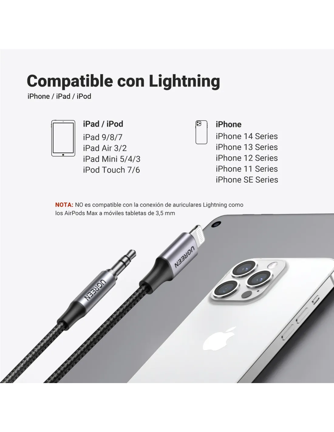 [Certificado por MFi] O cabo lightning a jack 3,5 mm possui um número de identificação oficial (PPID: 219693-0154), o que significa que é 100% compatível com dispositivos iOS e não causará danos. Ideal para conectar o seu iPhone / iPod / iPad ao seu auxiliar de carro, auricular ou altifalante que possui um conector de 3,5 mm. Nota: Não é compatível com o AirPods Max / Beats Studio / Beats Solo.[Ampla compatibilidade] Plug e play, este cabo lightning a jack 3,5 macho funciona bem com todos os dispositivos que possuem um conector Lightning com iOS 10.3.1 e posterior, como iPhone 14/iPhone 14 Plus/ iPhone 14 Pro/ iPhone 14 Pro Max/ iPhone 14 Pro Max/ iPhone 14 Pro Max/iPhone iPhone 14 Phone 14 Pro Max/iPhone iPhone 14 Pro Telefone 13/11 3 Mini/ 12/ SE 2022/ SE 2020/ 11/ XS/ XR/ X/ 8/ 7, iPad Mini/ Air / Pro, iPod Touch 7/6. Nota: Não é compatível com o iPad Pro 2018 11 "/ 12,9" que possui uma interface USB C.[Qualidade de som HiFi] Cabo auxiliar de 3,5 mm com chip incorporado MFi certificado, características com condutor de cobre estanhado e blindagem multicamada no interior. Filtra 98% de ruído para proporcionar um som de alta qualidade. Além disso, também é compatível com áudio sem perda para proporcionar uma experiência sonora clara e sem interrupções. Nota: O carregamento não é suportado.[Fixamente conectado] este cabo auxiliar possui tomada metálica padrão pode suportar ligar e desconectar mais de 15000 vezes e está firmemente instalado no soquete para garantir um contacto estável para uma reprodução de música ininterrupta quando o seu iPhone está em movimento. O comprimento de 1 m permite mover o telemóvel livremente no banco frontal do carro.[Durabilidade excecional] O cabo áudio auxiliar entrançado de nylon tem excelente resistência ao desgaste e protege o condutor interno do risco de quebra do cabo. A capa de alumínio resistente a riscos não só dá ao cabo auxiliar uma boa aparência, mas também faz um bom trabalho ao dissipar o calor.