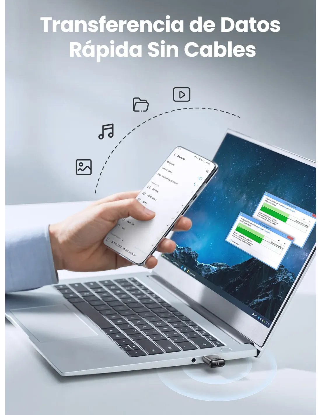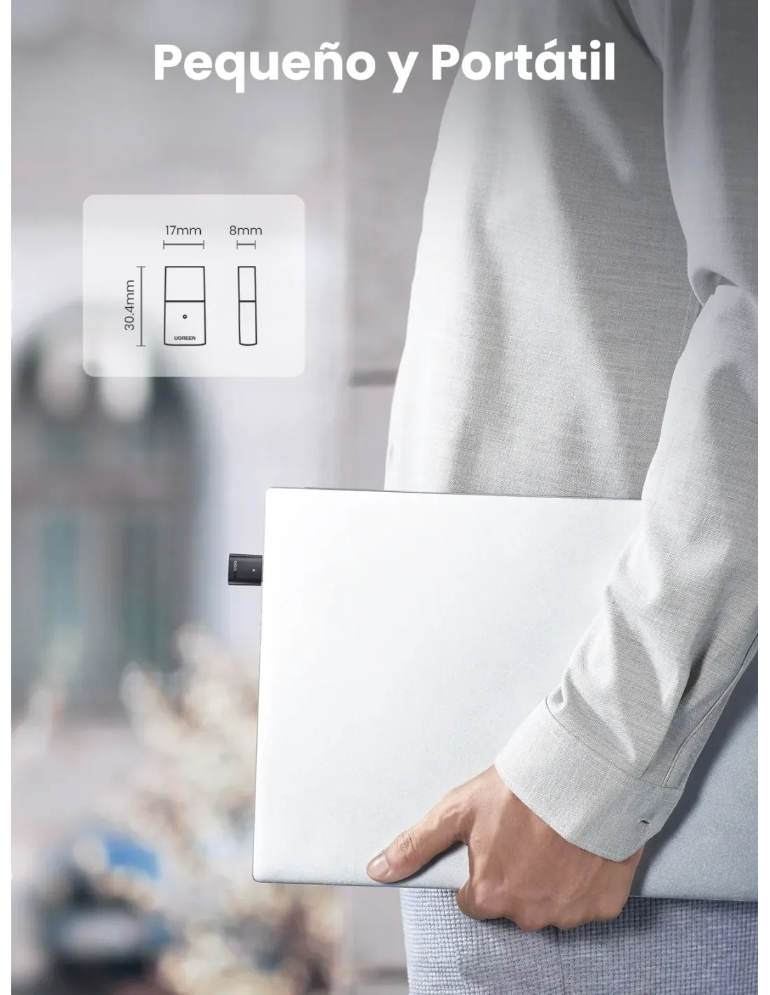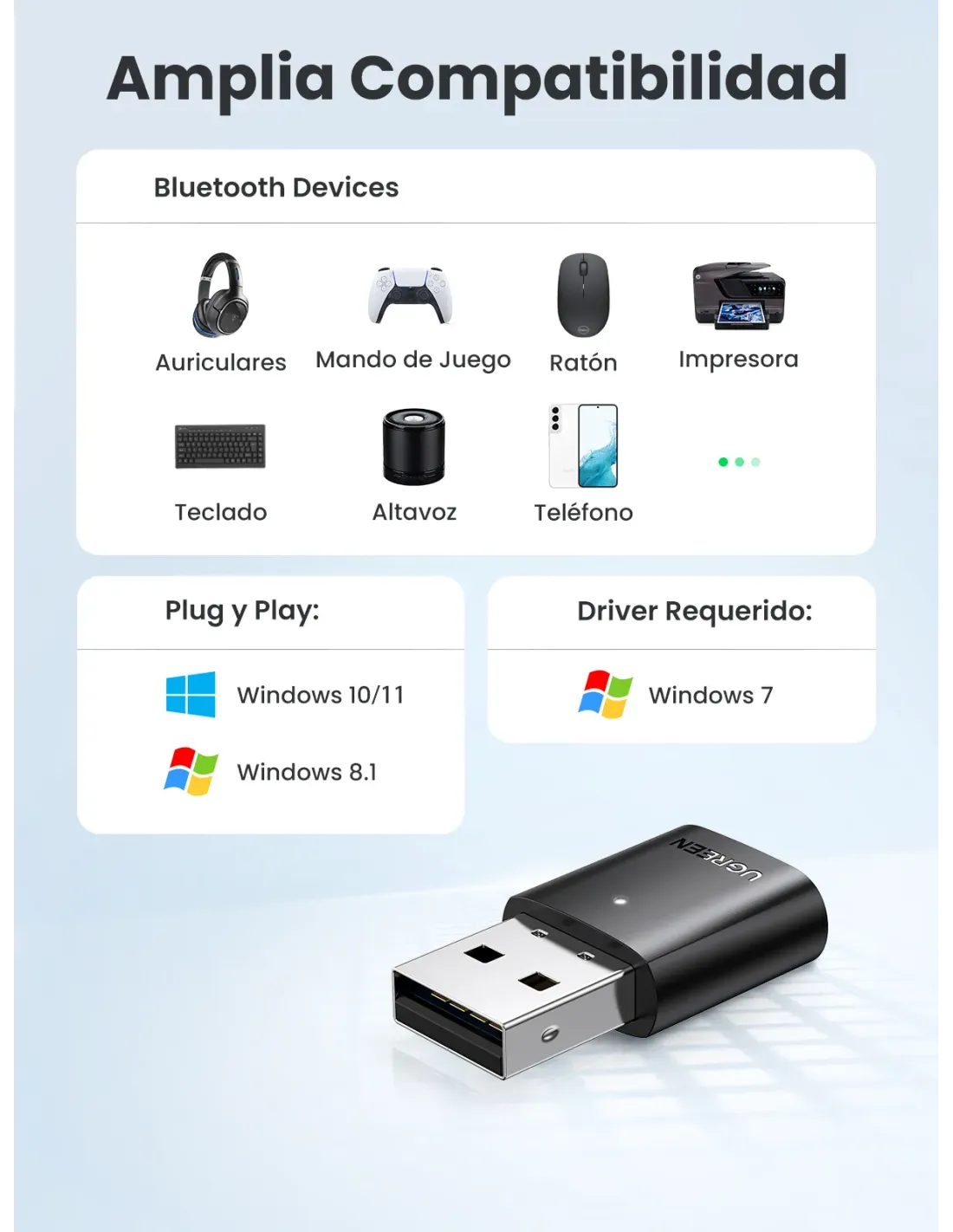 .Adaptador Bluetooth 5.0: aplica el último Bluetooth 5.0 + EDR + Bluetooth de bajo consumo, este adaptador USB Bluetooth para PC ha aumentado en gran medida la capacidad antiinterferencias y ha reducido la pérdida de eficiencia de transmisión causada por interferencias, lo que le permite estar lleno de imaginación con el audio..Función mejorada: con la tecnología más avanzada, este adaptador Bluetooth le otorgará hasta el doble de velocidad y cuatro veces la cobertura en comparación con Bluetooth 4.0, logrando la función de mayor velocidad de la señal de audio y mayor cobertura de la señal Bluetooth..Alcance increíble: con este adaptador Bluetooth, puede experimentar la libertad de la conectividad inalámbrica, lo que le permite disfrutar de audio de alta calidad al menos a 60 pies de distancia. No se preocupe más por la señal reducida y la señal inestable para una conexión prolongada de los dispositivos, el USB Bluetooth proporciona una conexión confiable y de largo alcance para las necesidades de su dispositivo inalámbrico..Amplia compatibilidad: el adaptador USB Bluetooth de UGREEN es compatible con Windows 11, 10, 8.1 y 7, y ofrece la función Bluetooth para auriculares, altavoces, teclados, ratones, mandos, impresoras, teléfonos móviles y mucho más..Tamaño mini: un diseño elegante y ultrapequeño significa que puedes insertar el adaptador USB Bluetooth en cualquier puerto USB sin bloquear los puertos USB circundantes y simplemente mantenerlo allí, sin importar cuando estés de viaje o en casa..Nota: 1. Este adaptador no se puede utilizar directamente en PS3, PS4, PS5, Switch o Xbox Console. 2. Este adaptador es un adaptador Bluetooth para PC y se puede emparejar con dispositivos Bluetooth, pero no funciona con dispositivos inalámbricos.