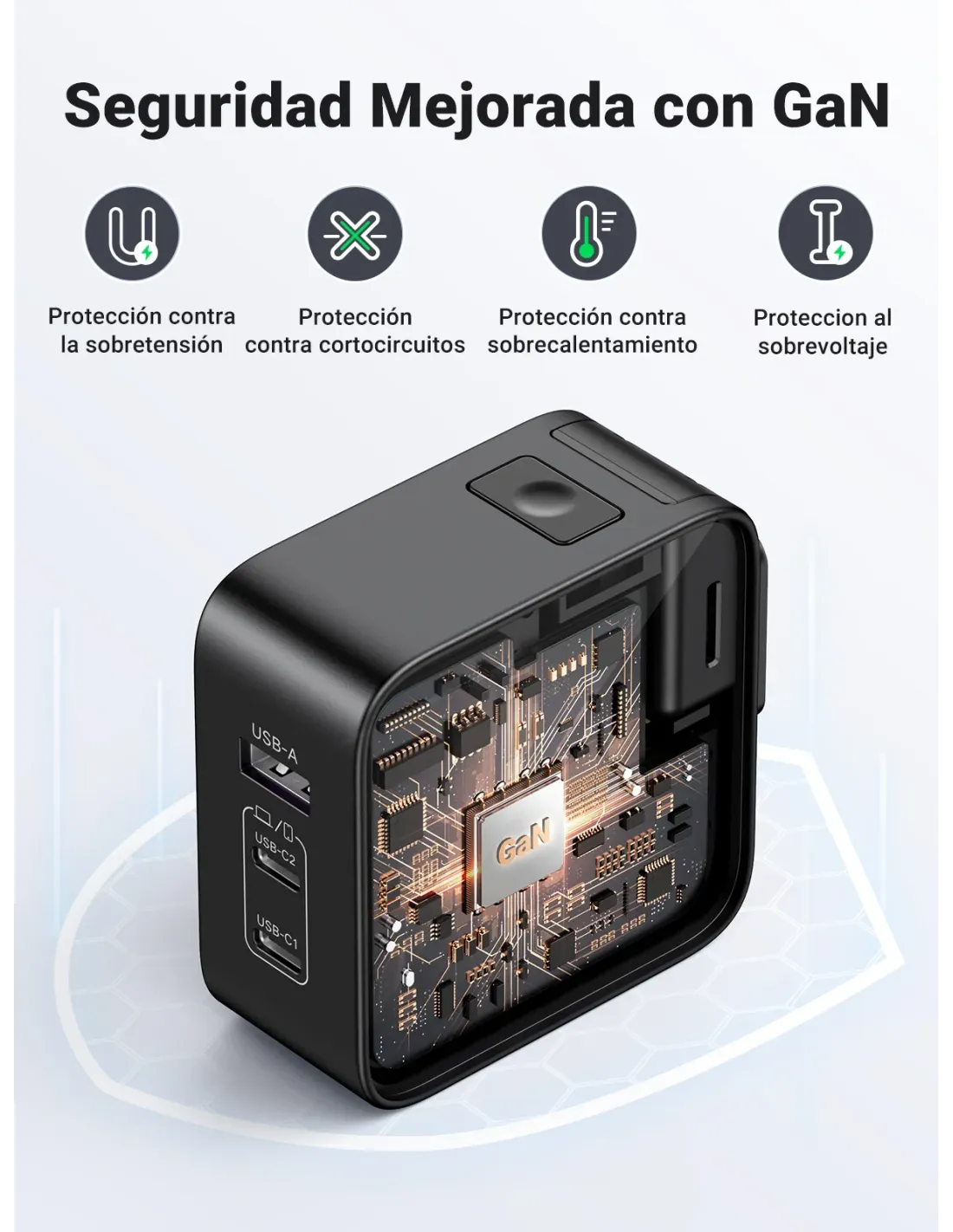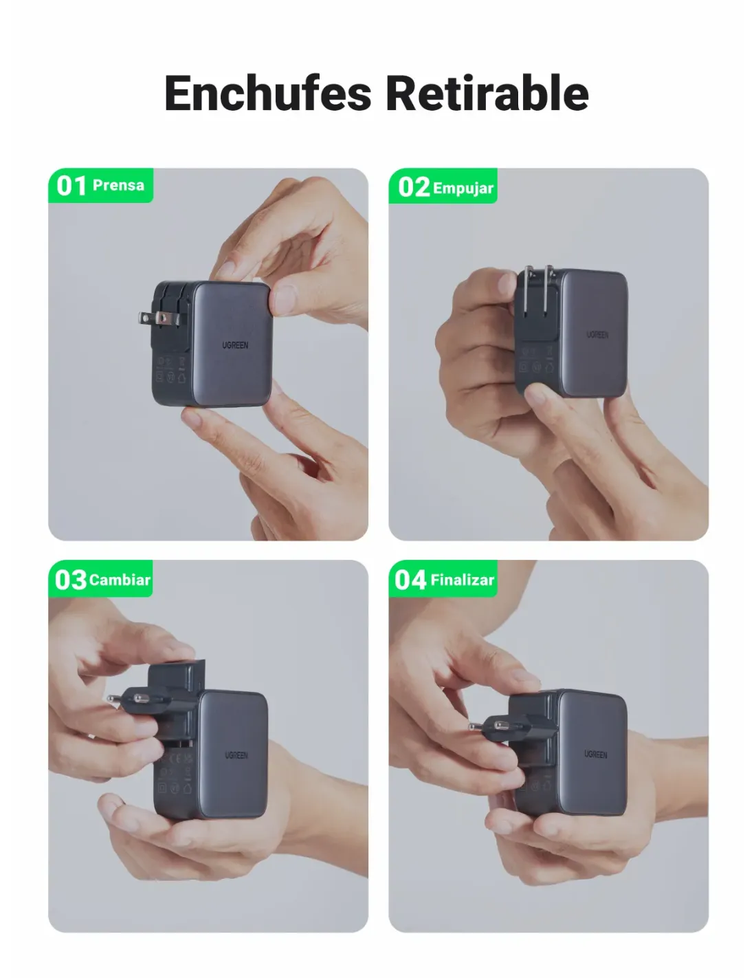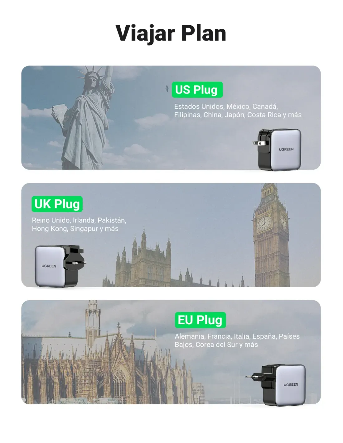 [ Adaptadores universais] UGREEN carregador de viagem tem 3 tomadas internacionais (UE/Reino Unido/EUA) para diferentes países. Prático para carregar qualquer tipo de dispositivo em qualquer país, é um item indispensável para levar consigo durante as férias no exterior.[Carregamento rápido de 65 W] O carregador de 65 W com 2 portas USB C e 1 porta USB A, as portas USB C1 e C2 oferecem uma potência máxima de 65 W quando usado sozinho, e este carregador suporta vários protocolos de carregamento rápido, como PD 3.0, PPS, QC 4/3.0 e SCP.Nota: Para obter um carregamento rápido e estável, ao carregar produtos da série iWatch, recomendamos que desconecte outros dispositivos e carrege-os separadamente, ou carregue o iWatch com uma porta USB C.O carregador UGREEN otimiza a sua experiência de carregamento com a tecnologia GaN II, é menor e mais compacto e oferece ainda mais potência. Tamanho: 6,5 * 6,5 * 3,25 cm.[Confiável e seguro] Equipado com chips inteligentes para proteger os seus dispositivos contra curto-circuitos, sobretensão, sobretemperatura e sobrecorrente, mantém você e o seu dispositivo seguros.