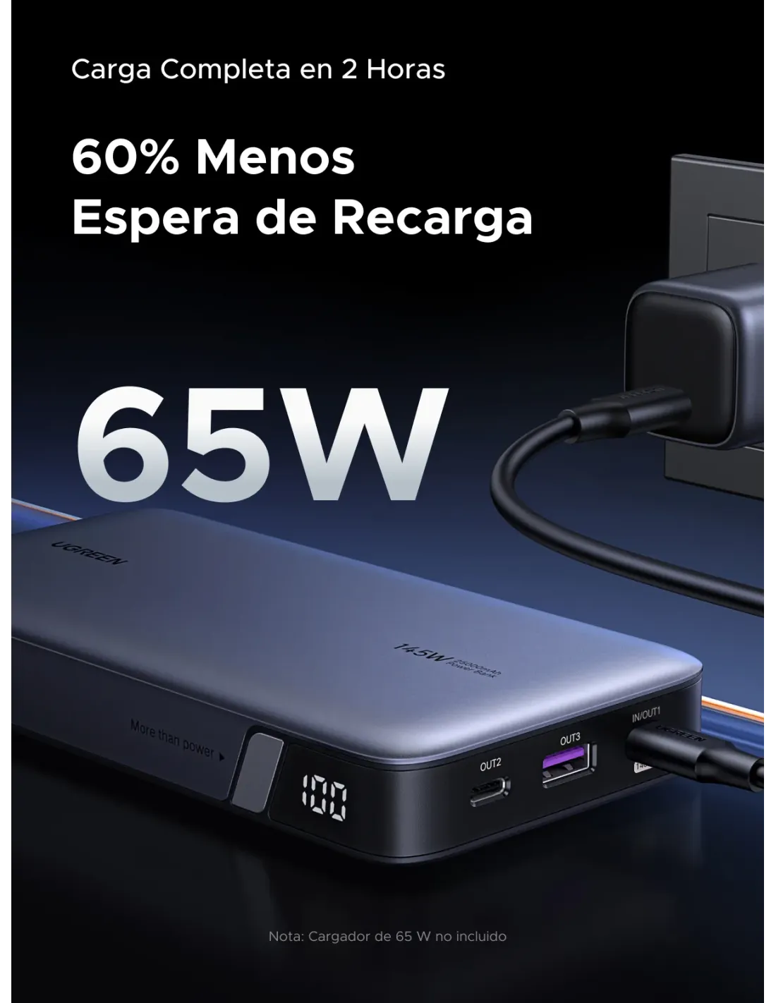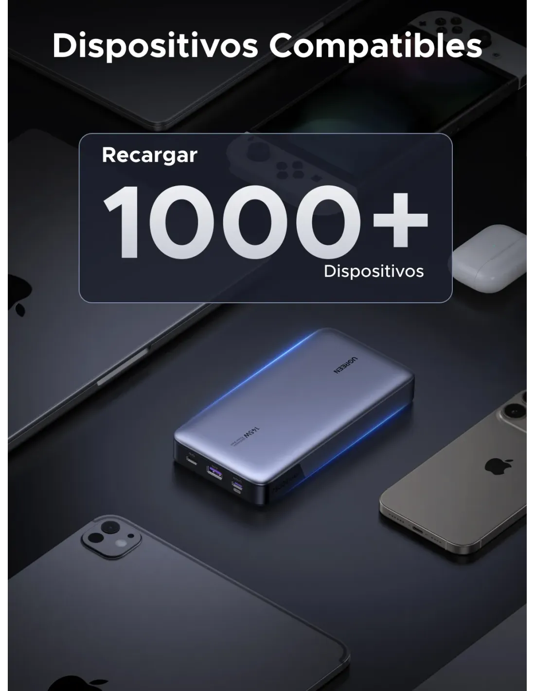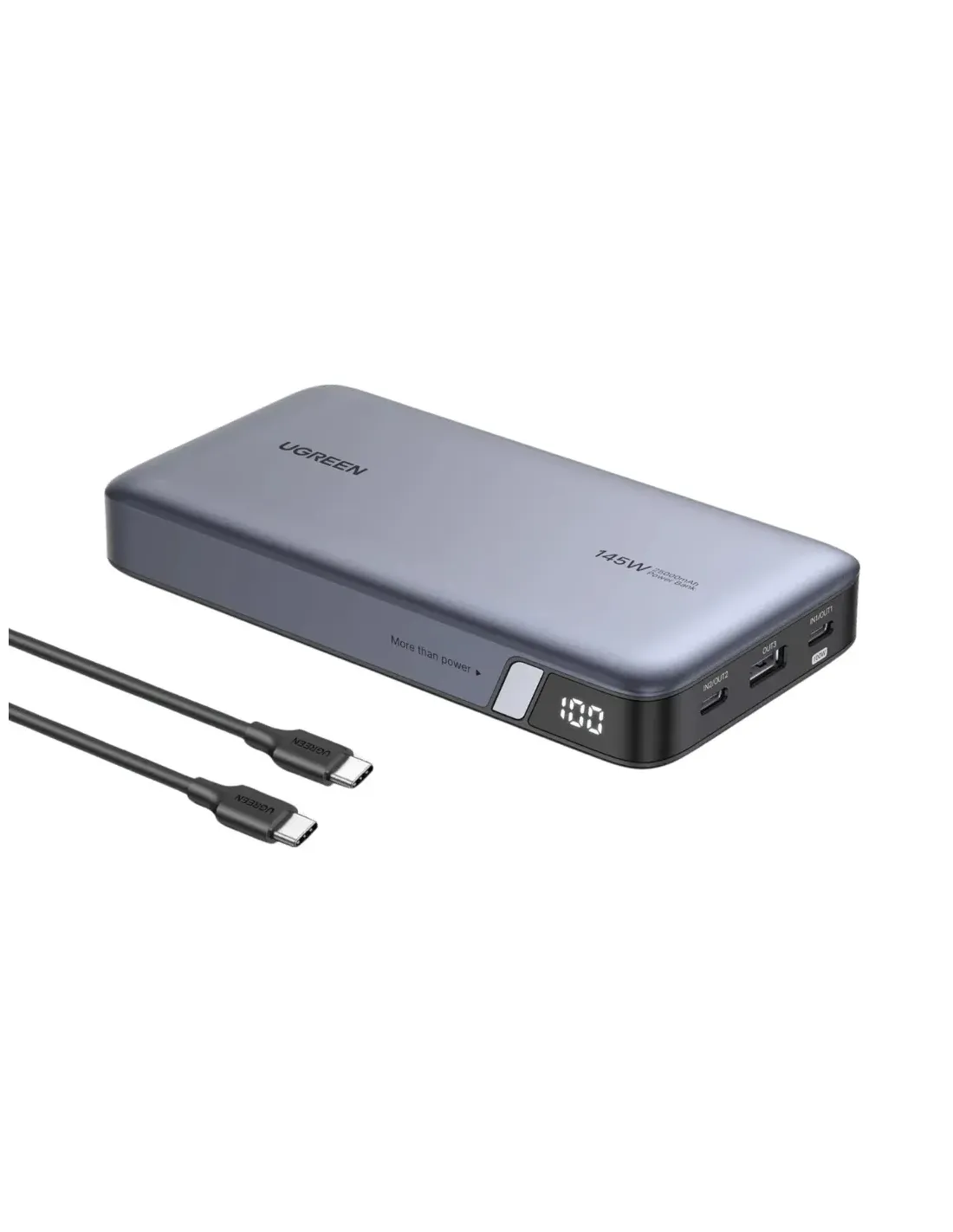 [Carregamento rápido de 145W] Com as mais recentes tecnologias PD3.0 e QC3.0, pode atingir uma velocidade de carregamento super rápida de 140 W de uma só porta, que carrega 56% do MacBook Pro em 30 minutos e 50% do iPhoone 16 em 30 minutos. Use 2 portas USB C simultaneamente, este banco de energia pode oferecer uma potência de até 145 W no total.[Triple flexibilidade de carregamento] O potente banco de energia com 3 portas USB (USB C1/C2, USB A) garante a máxima velocidade de carregamento para 3 dispositivos simultaneamente.[Grande capacidade de 25000 mAh] Com o banco de energia UGREEN de 25000 mAh, pode usar o MacBook Pro de 14" até 1,3 vezes, Galaxy S24 Ultra até 3,0 vezes e iPhone 16 até 5,6 vezes para se manter sempre fluxo.[Um para todos] UGREEN bateria externa para telemóveis é compatível com quase todos os dispositivos, compatível com MacBook Pro/Air, HP Spectre, iPad Pro/Air, iPhone 16/16 Pro/16 Pro Max/15/15 Plus/155 Plus/1555555 Pro/1 5 Pro Max/14/13/12/11, AirPods Pro, Galaxy S24/S24 Ultra/S23/S22/S2, Pixel 9/8/7/6, etc.[Design inteligente e premium] O ecrã LED digital exibe a bateria restante da bateria externa. Material compatível com o volante, aparência elegante, design simples e portátil para as suas viagens ao redor do mundo com eletricidade.