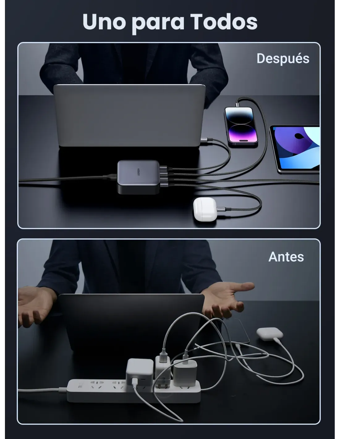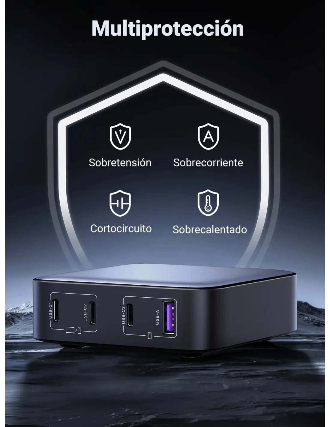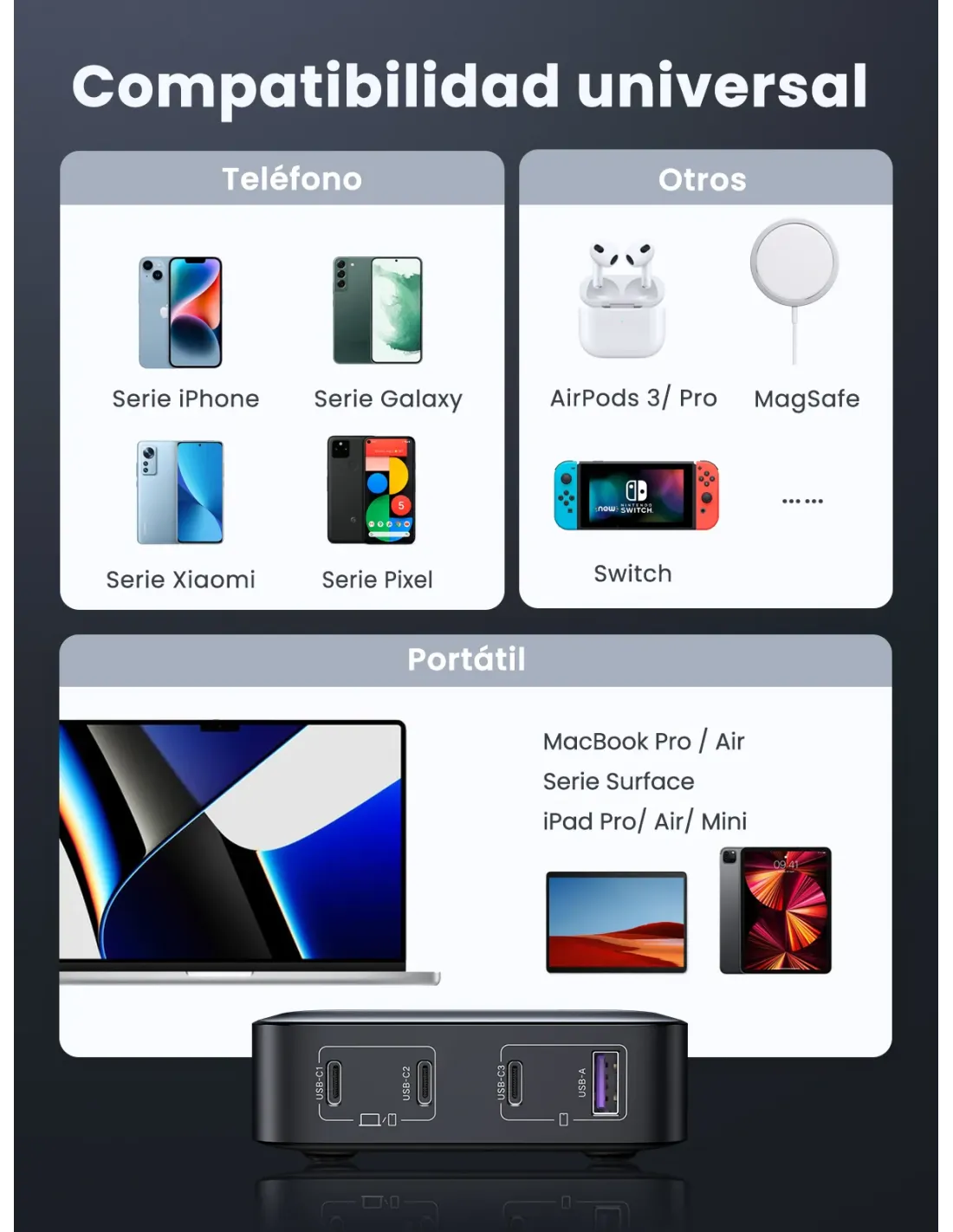Carregamento ultra-rápido de 100 W: Este carregador com 3 portas USB C e 1 porta USB A, tanto as portas USB C1 como C2 suportam potência de até 100 W quando usadas sozinhas, USB C3 e USB A suportam potência de até 22,5 W. Com um cabo AC de 2 m para colocá-lo num local adequado na mesa. , oferece carregamento rápido para 4 dispositivos.Carregamento multiporta simultâneo: As portas USB-C1 e USB-C2 do carregador suportam uma carga máxima de 100 W quando usadas sozinhas, o suficiente para carregar o seu MacBook Pro a velocidade máxima. Este carregador suporta vários protocolos de carregamento rápido, como PD 3.0, PPS, QC 4 / 3.0 e SCP, a energia será distribuída entre as 4 portas para garantir um melhor carregamento.Tecnologia avançada GaN II: Este carregador de 100 W otimiza a sua experiência de carregamento com tecnologia GaN, como economia de energia, dissipação de calor, tamanho compacto, etc. Tamanho: 8,3 * 8,7 * 2,9 cm.Compatibilidade universal: UGREEN adaptador de corrente USB C de 100 W é compatível com MacBook Pro, MacBook Air M1/M2, iPad Pro/Air/mini, iPhone 16 Plus/ 16 Pro Max/ 15 Plus/ 15 Pro Max/ 14 Plus Rro Max/100 3/12, Galaxy S24/S24+ / S24. Ultra/ S23 Ultra/ S23 / S22/ S22+/ S22 Ultra/ S21/ S20 FE/ S20, Galaxy Tab S7/ S7+/ S6/ S5e, Steam Deck, Pixel 7/ 7 Pro/ 6 Pro/ 6a, etc.Confiável e seguro: Equipado com chips inteligentes para proteger os seus dispositivos contra curto-circuitos, sobretensão, sobretemperatura e sobrecorrente, mantém você e o seu dispositivo seguros.