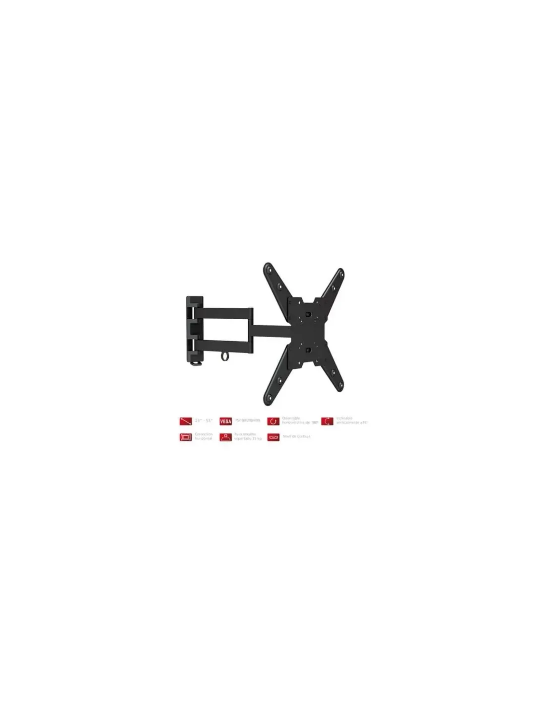Soporte TV orientableBENEFICIOSSoporte orientable de pared para TV de 23" a 55" (58 a 140 cm) queproporciona una sujeción firme y segura. Optimiza el espacio y aporta unanueva estética a tu vivienda o negocio. Es orientable horizontalmente 180º,inclinable verticalmente 15º. Está especialmente diseñado para orientarTVs de gran tamaño libremente, permitiendo colocar el TV perpendicular ala pared. Incorpora todos los accesorios para una instalación rápida ysencilla.APLICACIONESPara uso doméstico (TV principal de salón o cine en casa) y profesional(instalaciones audiovisuales en colegios, oficinas, tiendas, etc.).DATOS TÉCNICOSPeso máximo 35 kg Distancia a la pared en posición vertical: 56 a 51 cmPlaca TV: 22'2 x 23'6 cm Placa pared: 6'5 x 26 cmCARACTERÍSTICASSoporte TV orientablePANTALLA23" a 55" (58 a 140 cm)VESA75 x 75, 100 x 100, 200 x 100, 200 x 200, 400 x 200, 300 x 300, 400 x 400PESO MÁXIMO SOPORTADO35 kgAJUSTESOrientable horizontalmente 180ºInclinable verticalmente 15ºCorrección de inclinación horizontal de la pantallaCOLORNegroMEDIDASDistancia a la pared en posición vertical: 5'6 a 51 cmPlaca TV: 22'2 x 23'6 cmPlaca pared: 6'5 x 26 cmPESO3'5 kgACCESORIOSNivel de burbujaSujetacablesPlantilla de instalación, tacos, tornillos y accesorios de montaje