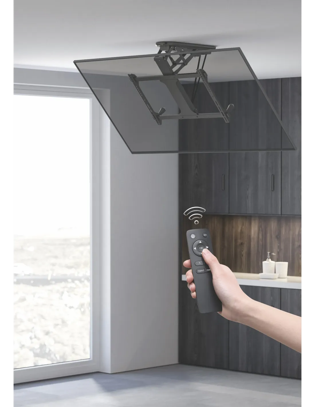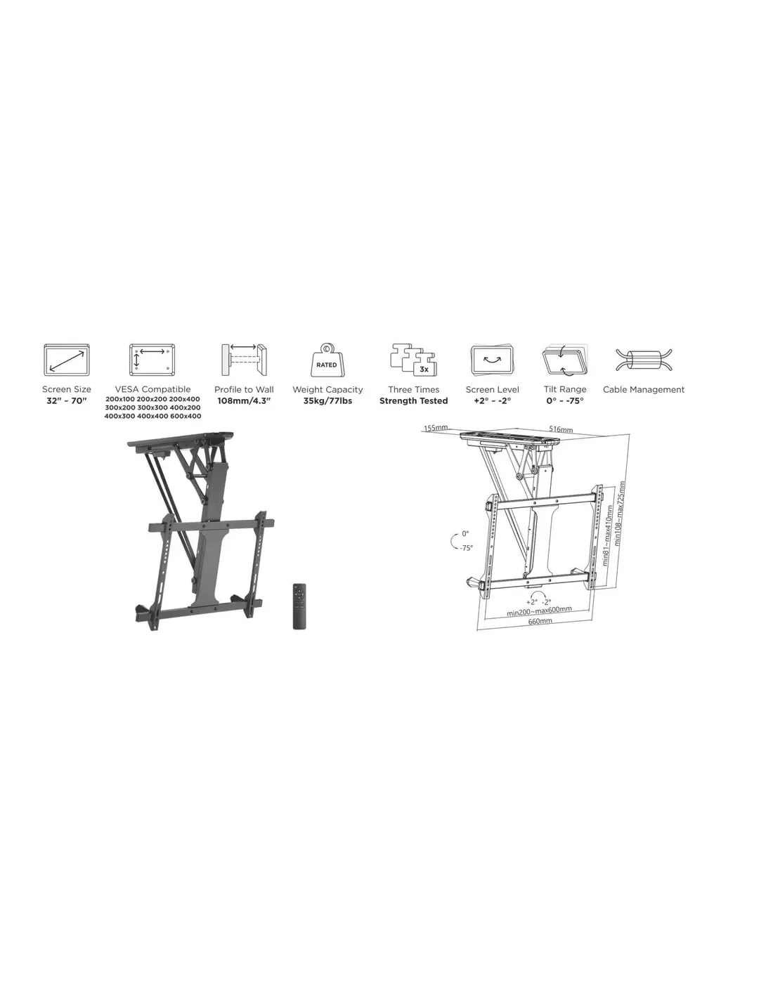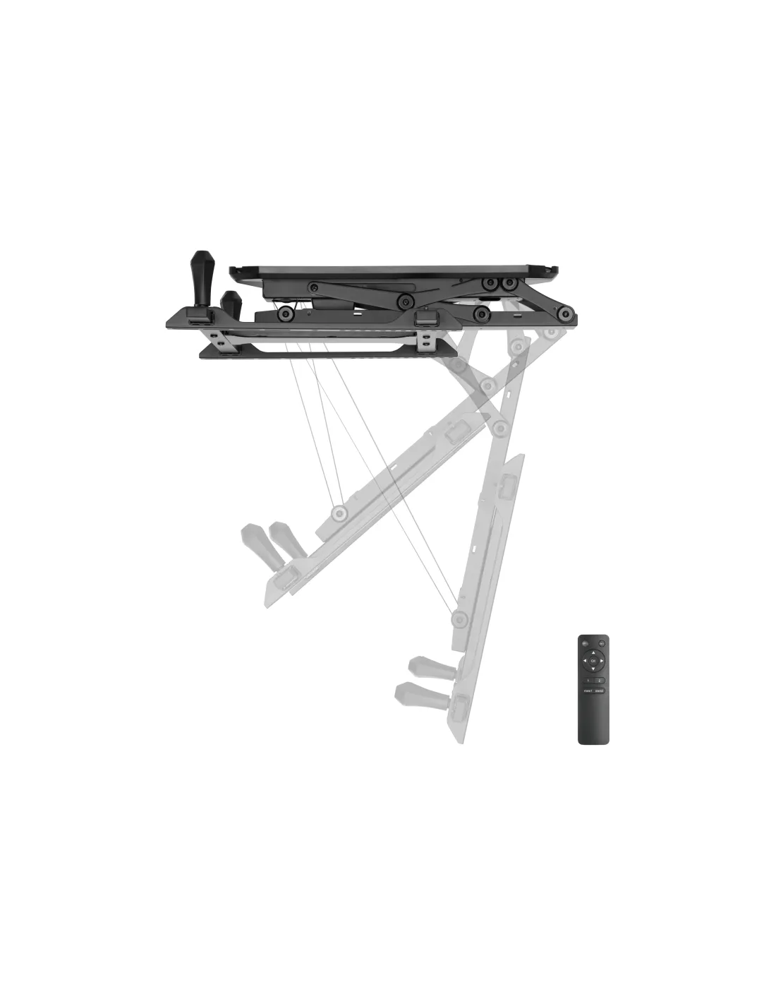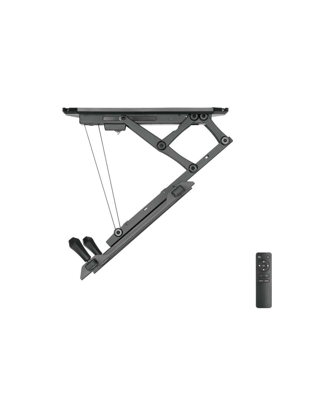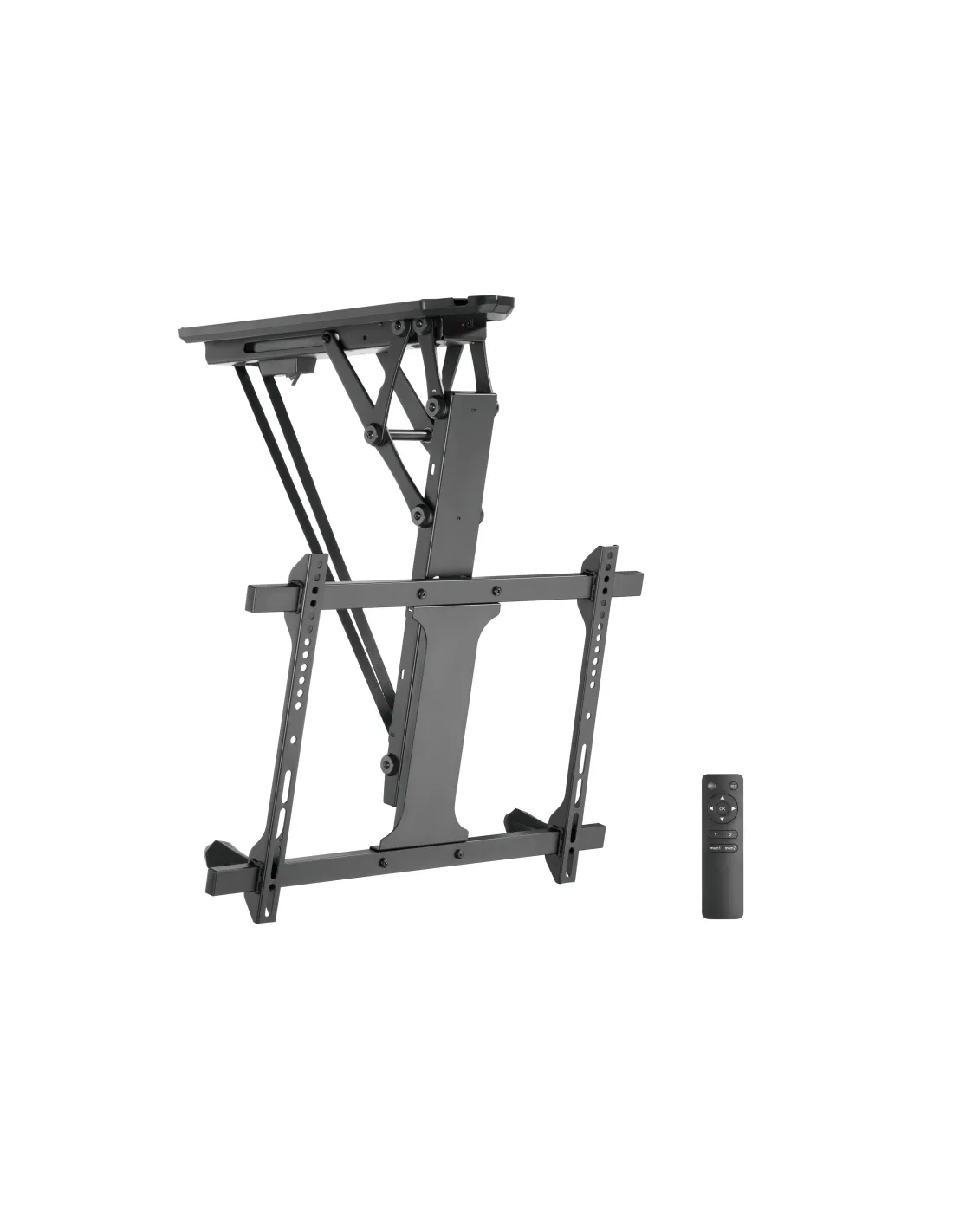 Mando a distancia incluido: para facilitar el movimientoMax. Capacidad de carga: 35KgVESA Max.: 600x400Diseño abatible: permite un fácil almacenamiento, ahorra espacioEl ajuste de nivel asegura un posicionamiento perfectoGestión de cables integradaEl soporte motorizado para montaje en techo de TV Equip®, es el artículo perfecto para ahorrar espacio en la habitación con techo bajo (plano e inclinado), se retrae y se mantiene al ras de la parte superior.Combinado con el mecanismo balanceado para evitar que la TV tiemble en el techo.El motor de alta calidad proporciona una función de elevación automática con solo presionar un botón. El conveniente control remoto RF permite la operación a través de paredes y a distancia del televisor.Pantallas 32" Hasta 70"Mando a distancia incluido: para facilitar el movimientoMax. Capacidad de carga: 35KgCompatibilidad VESA: 200x100,200x200,300x200,200x400,400x200,300x300,400x300,400x400,600x400Inclinacion: 0º-75ºDiseño abatible: permite un fácil almacenamiento, ahorra espacioEl ajuste de nivel asegura un posicionamiento perfectoGestión de cables integrada