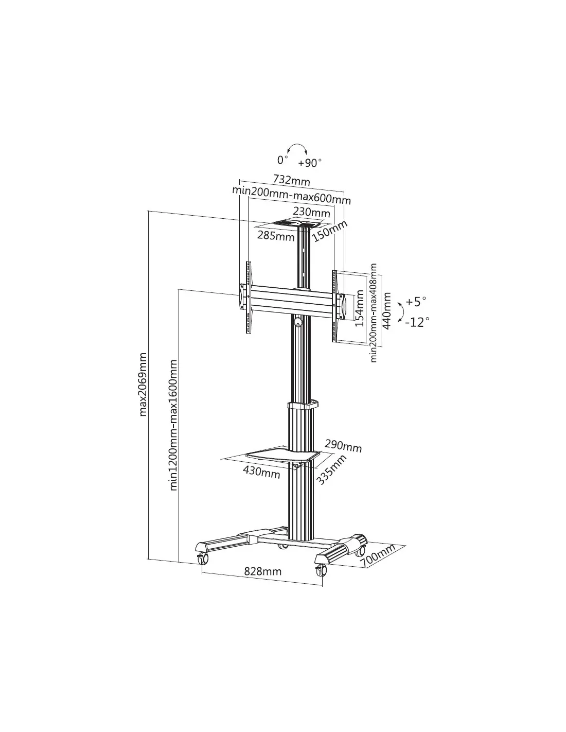 Equip Carro LFD de 37-70» con giro de 90° y pantalla única, 50 kg, 94 cm (37"), 177,8 cm (70"), 200 x 200 mm, 600 x 400 mm, -12 - 5°
