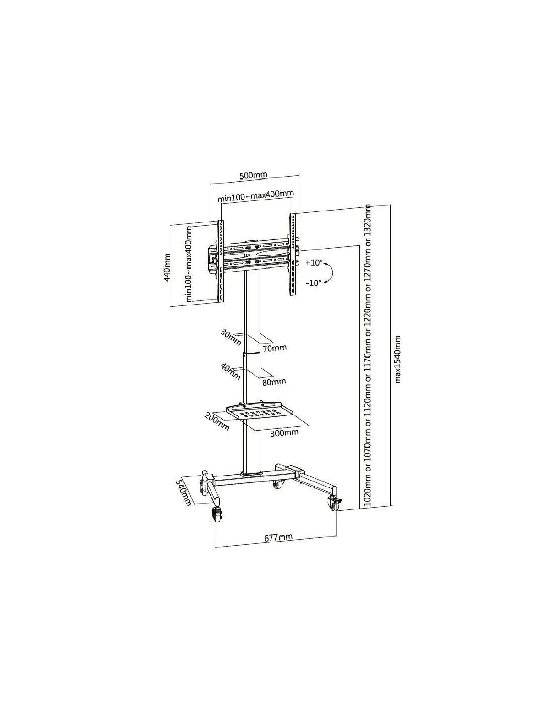 ```- DESCRIPCIÓN Soporte para TV de pantalla única con diseño elegante, técnico y funcional, ideal para conferencias, exhibiciones públicas y presentaciones profesionales. Permite ajuste de altura, inclinación y cuenta con sistema de gestión de cables para una apariencia ordenada. - CARACTERÍSTICAS Max. VESA: 400x400 Max. Capacidad de carga: 35 kg Cumple con los estándares VESA Ruedas para movilidad, bloqueables para seguridad Ajuste de altura telescópico para visibilidad óptima Diseño de inclinación libre (-10° a 10°) para reducir deslumbramiento Sistema de gestión de cables integrado - ESPECIFICACIONES Características: Color del producto: Negro Material: Plástico, Acero Uso recomendado: Panel plano Tipo: Carro multimedia Capacidad máxima de peso: 35 kg Tamaño mínimo de pantalla: 81,3 cm (32") Tamaño máximo de pantalla: 139,7 cm (55") Montaje VESA: Sí Interfaz de panel de montaje: 100 x 100, 200 x 100, 200 x 200, 300 x 200, 300 x 300, 400 x 200, 400 x 400, 400 x 300 Ángulo de inclinación: -10° a 10° Ajustes de altura: Sí Gestión de cables: Sí País de origen: China Certificación: CE Peso y dimensiones: Altura: 1240 mm Ajuste de altura: 154 cm Ancho: 677 mm Profundidad: 540 mm Peso: 10,4 kg Empaquetado: Ancho del paquete: 293 mm Profundidad del paquete: 113 mm Altura del paquete: 825 mm Peso del paquete: 11,8 kg Contenido del embalaje: Guía de configuración rápida: Sí ```