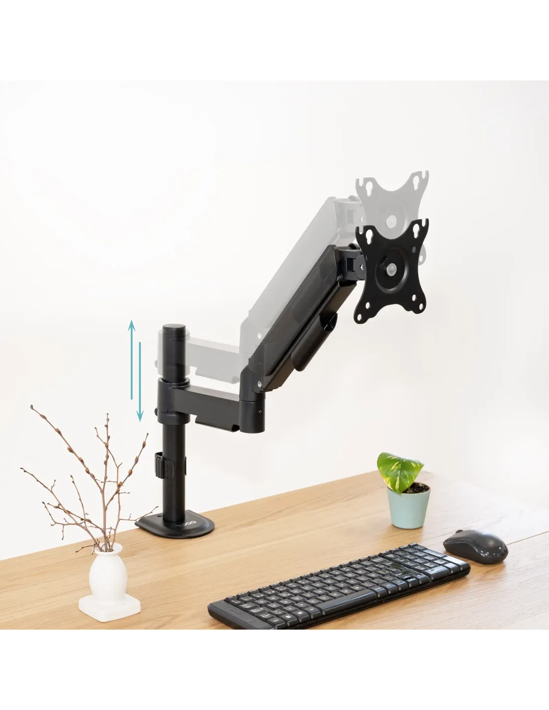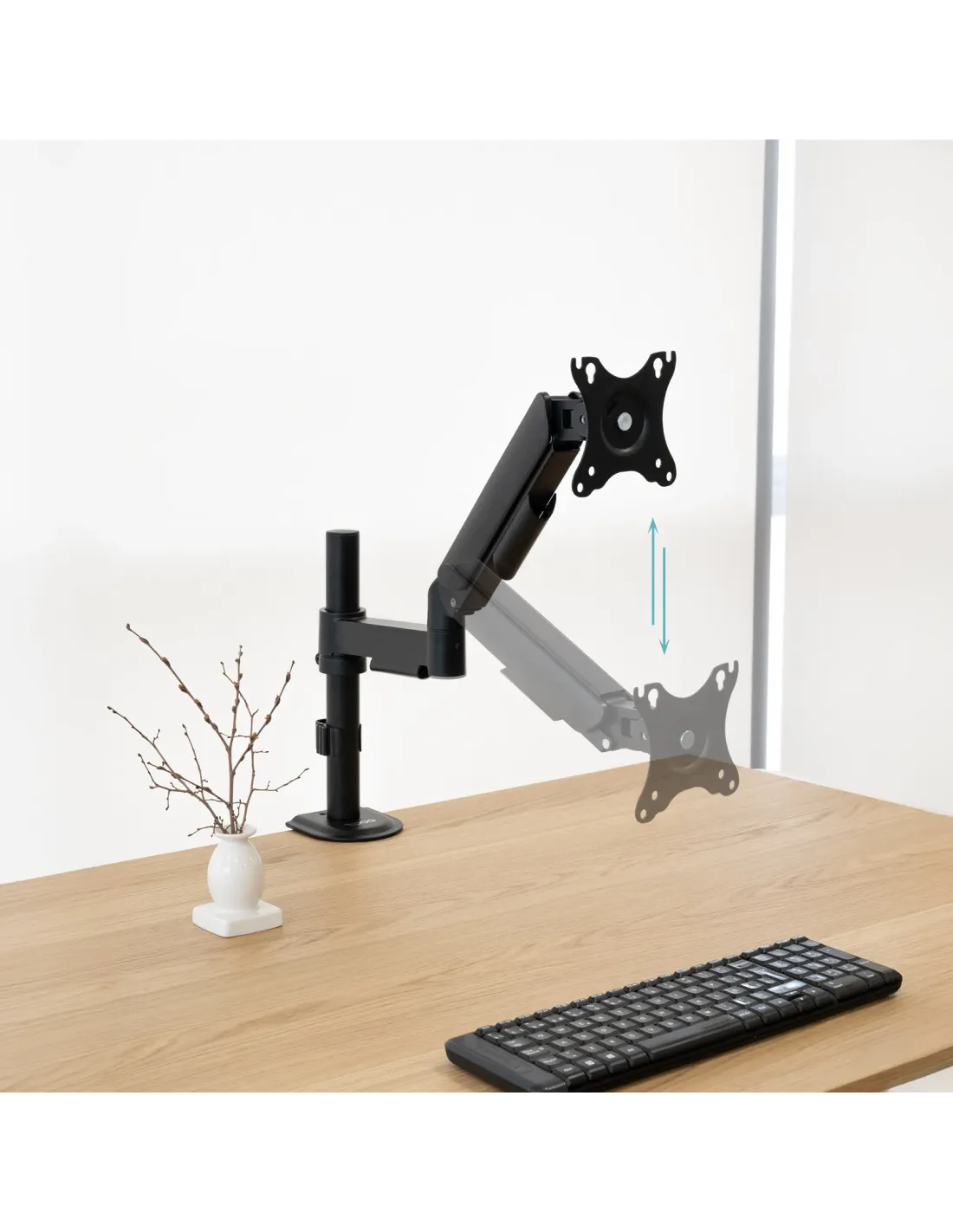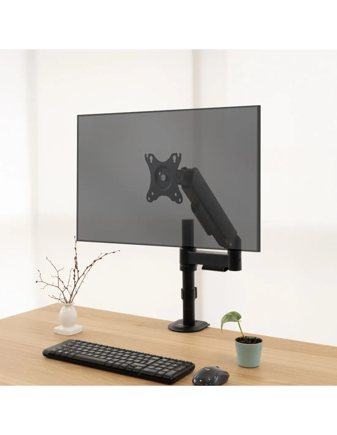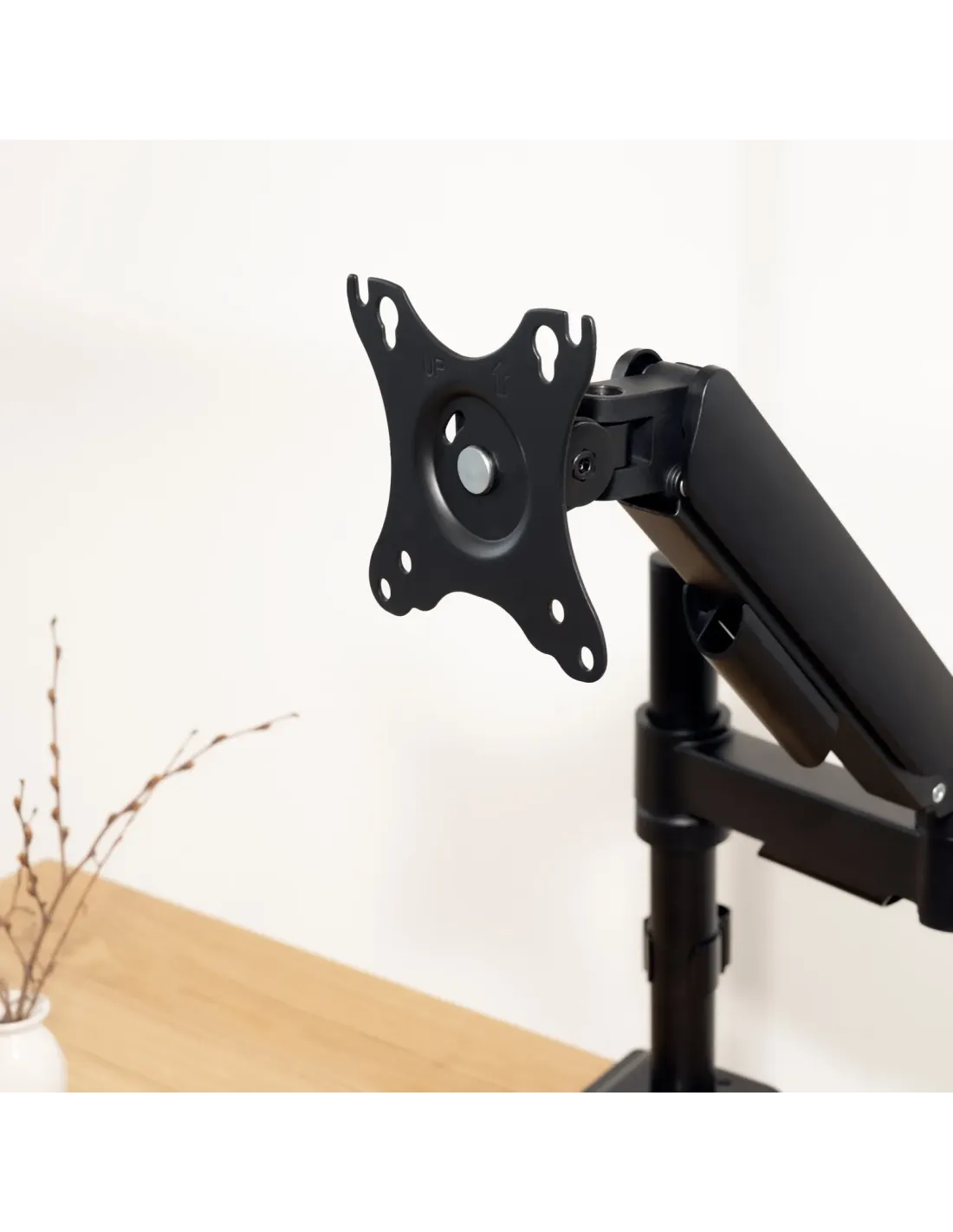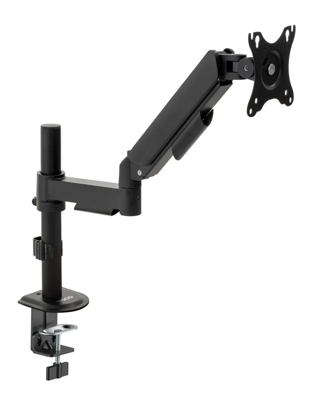 - Pantallas soportadas: 17"-32"- Compatible con VESA: 75x75 y 100x100- Peso soportado de pantalla: Mínimo 2 kg. Máximo 9 kg- Brazo regulable con mecanismo asistido por muelles- Ángulo de inclinación: +90°/-90°- Ángulo de giro: +90°/-90°- Ángulo de rotación: +180°/-180°- Altura ajustable hasta 519 mm- Extensión máxima del brazo: 405 mm- Instalación mediante abrazadera o tornillo pasante- Sistema de organización de cables- Compatible con pantallas curvas- Color: Negro- Material: fabricado en acero de alta calidad - Peso neto: 2,90 kg. Peso bruto: 3,06 kg- Medidas del embalaje: 380x135x83 mm