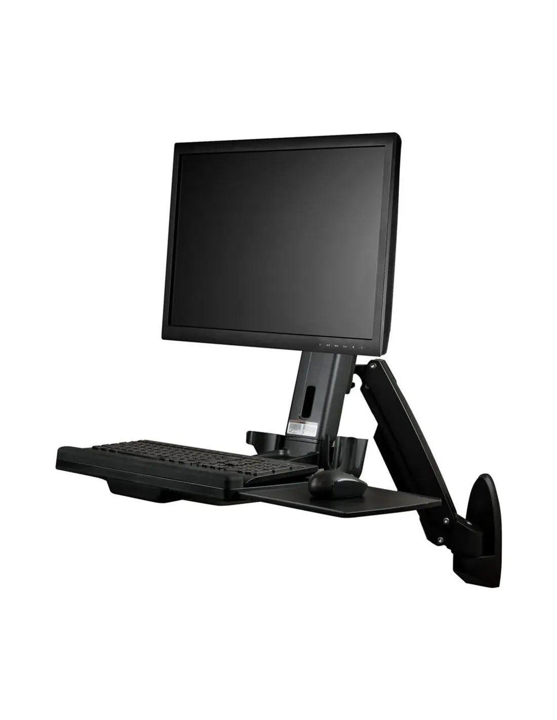 Características de la Estación de Trabajo de Pie y Sentado StarTech.com para Montaje en ParedLa estación de trabajo de montaje en pared de StarTech.com está diseñada para quienes necesitan una solución ergonómica y versátil en espacios reducidos. Ideal para oficinas, centros de salud o entornos industriales, permite alternar entre posiciones de pie y sentado, optimizando la postura y el confort durante la jornada. Su estructura robusta y ajustable facilita una instalación limpia y funcional sin ocupar espacio en el suelo.Diseño ergonómico y ajustable para máximo confortEsta estación permite ajustar la altura tanto del monitor como del teclado, adaptándose a distintos usuarios y tareas. Gracias a su sistema de movimiento, se puede cambiar de posición con fluidez, ayudando a reducir la fatiga y mejorar la productividad.Ajuste de altura para monitor y tecladoRotación del monitor: 360° / Inclinación de -5° a 35°Encuadre lateral de -90° a 90°Montaje en pared robusto y seguroFabricada en aluminio, acero y plástico resistente, esta estación soporta hasta 8 kg de carga, lo que la hace adecuada para monitores de hasta 24 pulgadas. Su sistema de anclaje incluye todo lo necesario para una instalación firme y duradera sobre muros de hormigón o superficies sólidas.Compatible con VESA 75 x 75 mm y 100 x 100 mmPeso máximo soportado: 8 kgIncluye herrajes, herramientas y placa de paredOrganización y eficiencia en cualquier entornoLa estación incorpora una bandeja para teclado con dimensiones adecuadas para trabajar con comodidad, y un organizador de cables integrado que mantiene el espacio limpio y ordenado. Su diseño vertical es ideal para optimizar paredes sin sacrificar funcionalidad.Bandeja de teclado: 44,9 cm de ancho x 20,7 cm de fondoOrganizador de cables incorporadoIdeal para entornos con espacio limitadoOtras especificacionesDimensiones totales: 66,8 cm (ancho) x 95,6 cm (fondo) x 92,6 cm (alto)Peso del producto: 9,3 kgColor: NegroComponentes incluidos: brazo de monitor, columna, placa de pared, bandeja de teclado, tornillería y herramientas