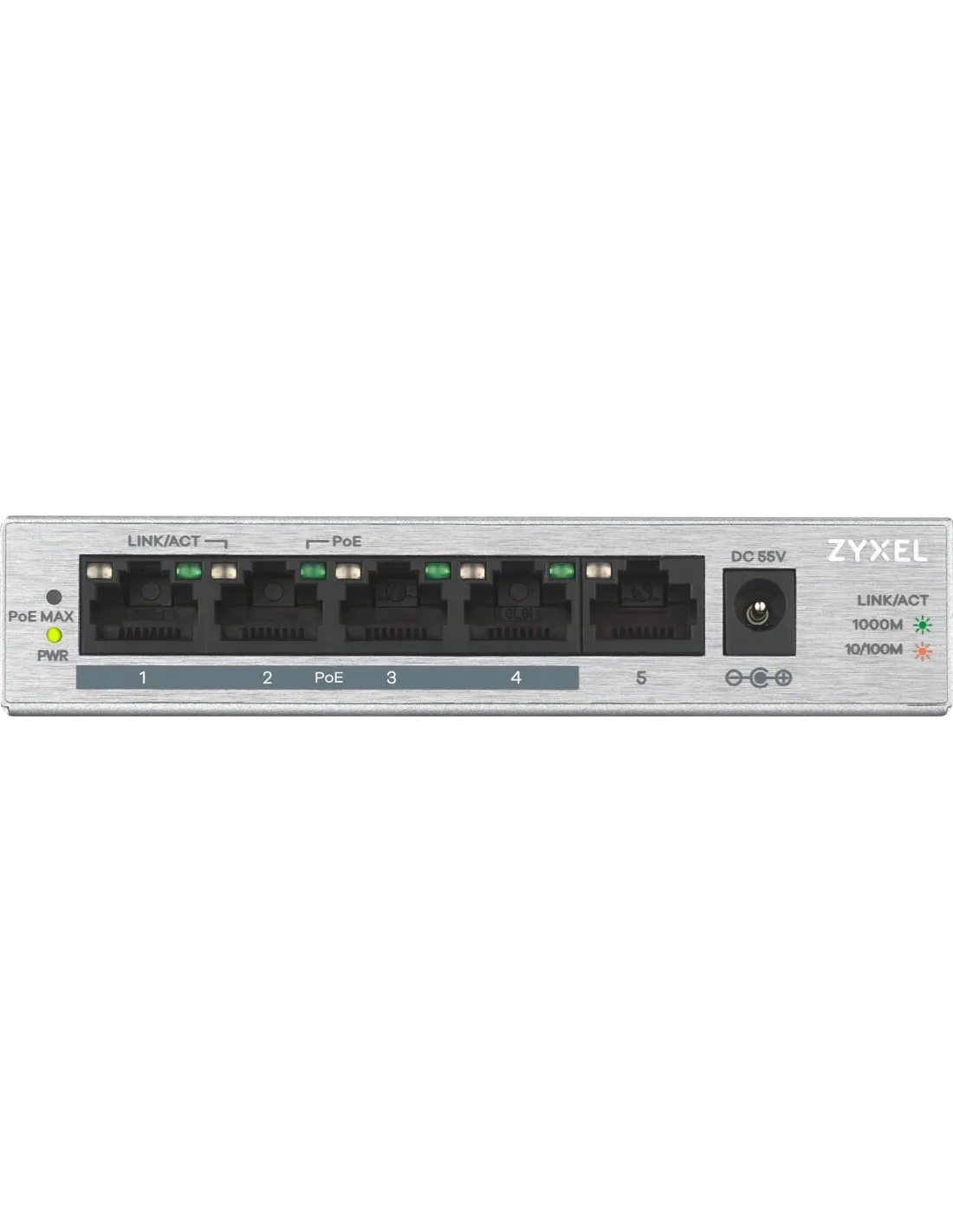 Zyxel GS1005HP. Tipo de interruptor: No administrado. Puertos tipo básico de conmutación RJ-45 Ethernet: Gigabit Ethernet (10/100/1000), Cantidad de puertos básicos de conmutación RJ-45 Ethernet: 5. Bidireccional completo (Full duplex). Tabla de direcciones MAC: 2048 entradas, Capacidad de conmutación: 10 Gbit/s. Estándares de red: IEEE 802.3, IEEE 802.3ab, IEEE 802.3az, IEEE 802.3u, IEEE 802.3x. Energía sobre Ethernet (PoE)