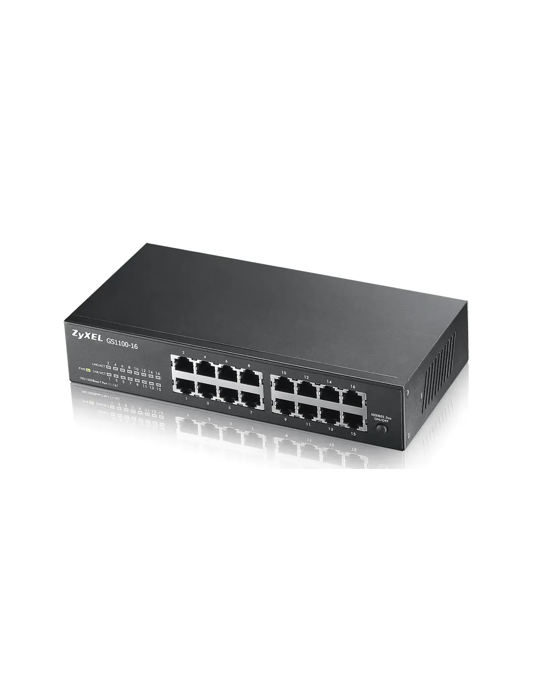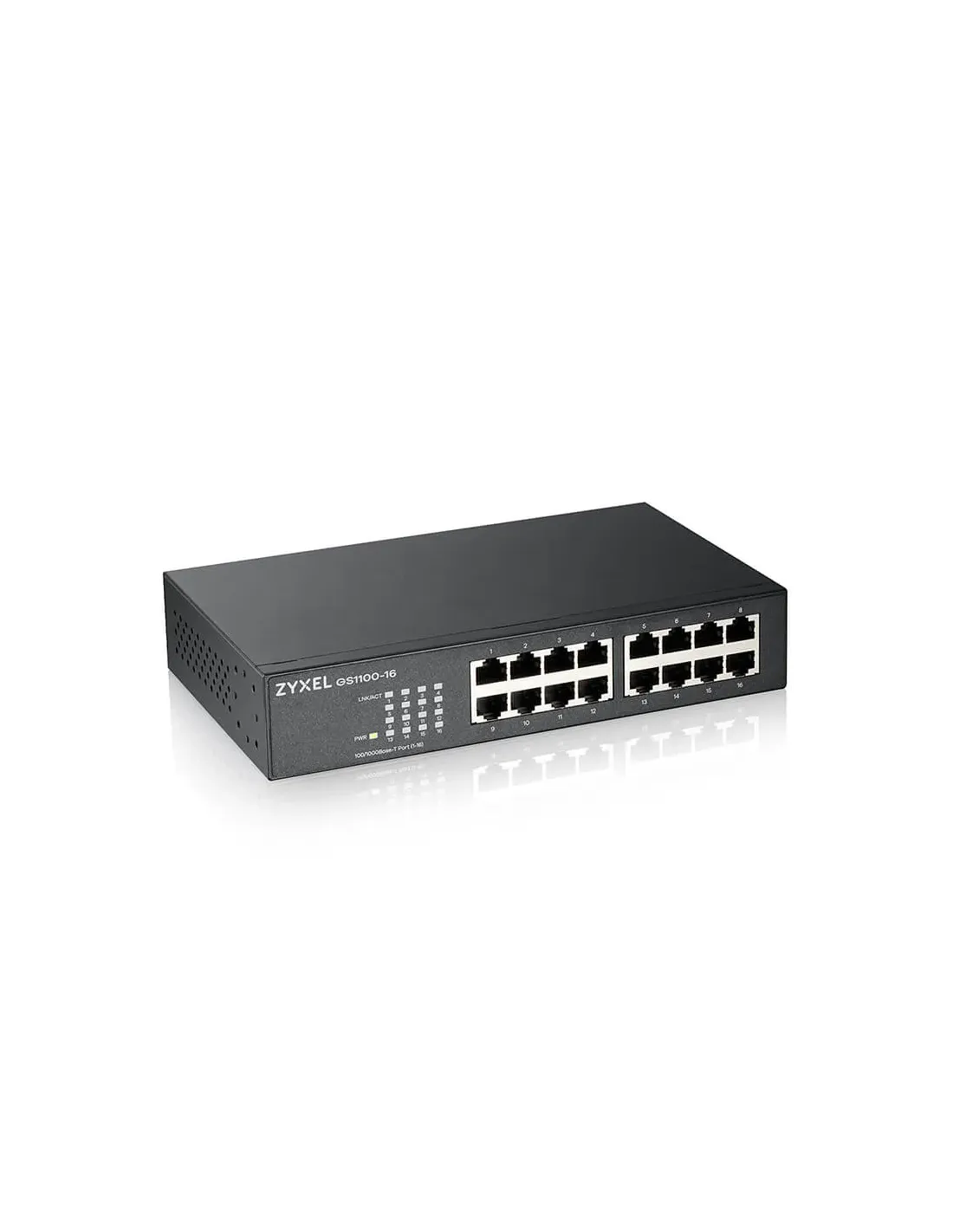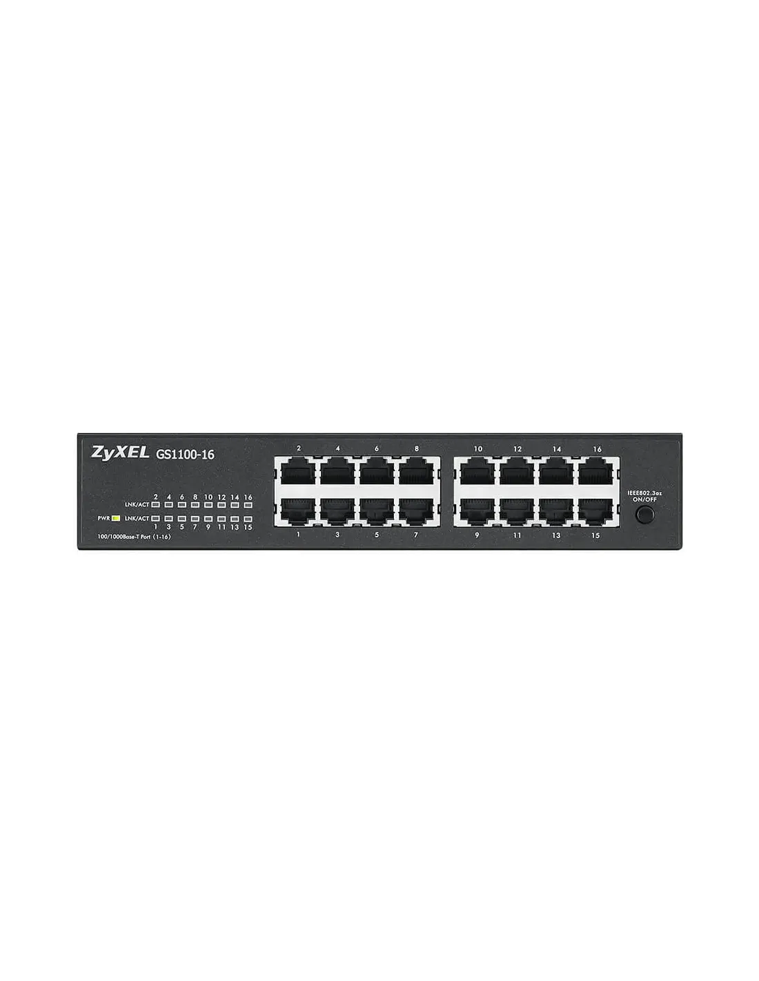 Zyxel GS1100-16. Tipo de interruptor: No administrado. Puertos tipo básico de conmutación RJ-45 Ethernet: Gigabit Ethernet (10/100/1000), Cantidad de puertos básicos de conmutación RJ-45 Ethernet: 16. Tabla de direcciones MAC: 8000 entradas, Capacidad de conmutación: 32 Gbit/s. Estándares de red: IEEE 802.1p, IEEE 802.3, IEEE 802.3ab, IEEE 802.3az, IEEE 802.3u, IEEE 802.3x, IEEE 802.3z. Montaje de pared, Montaje en rack