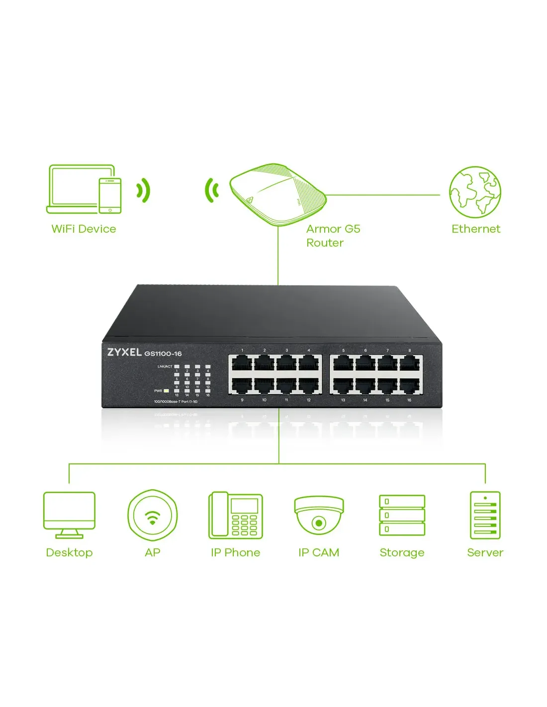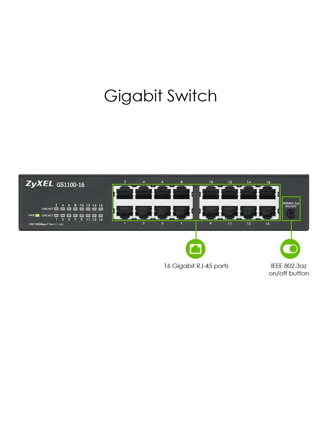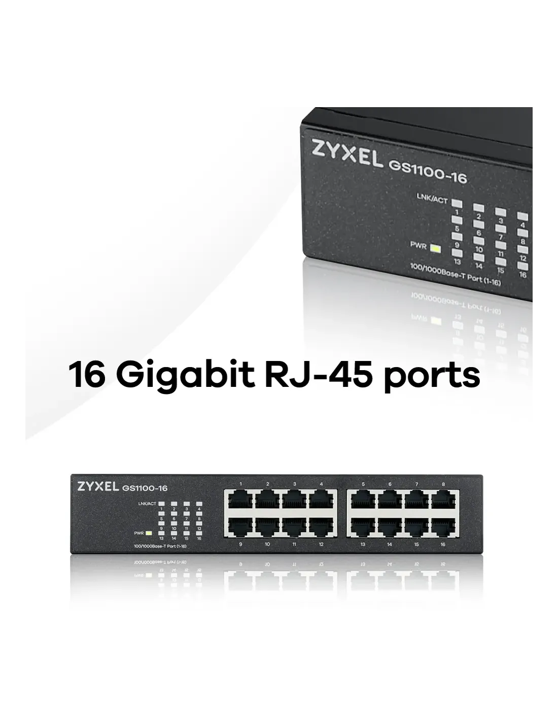 Zyxel GS1100-16. Tipo de interruptor: No administrado. Puertos tipo básico de conmutación RJ-45 Ethernet: Gigabit Ethernet (10/100/1000), Cantidad de puertos básicos de conmutación RJ-45 Ethernet: 16. Tabla de direcciones MAC: 8000 entradas, Capacidad de conmutación: 32 Gbit/s. Estándares de red: IEEE 802.1p, IEEE 802.3, IEEE 802.3ab, IEEE 802.3az, IEEE 802.3u, IEEE 802.3x, IEEE 802.3z. Montaje de pared, Montaje en rack