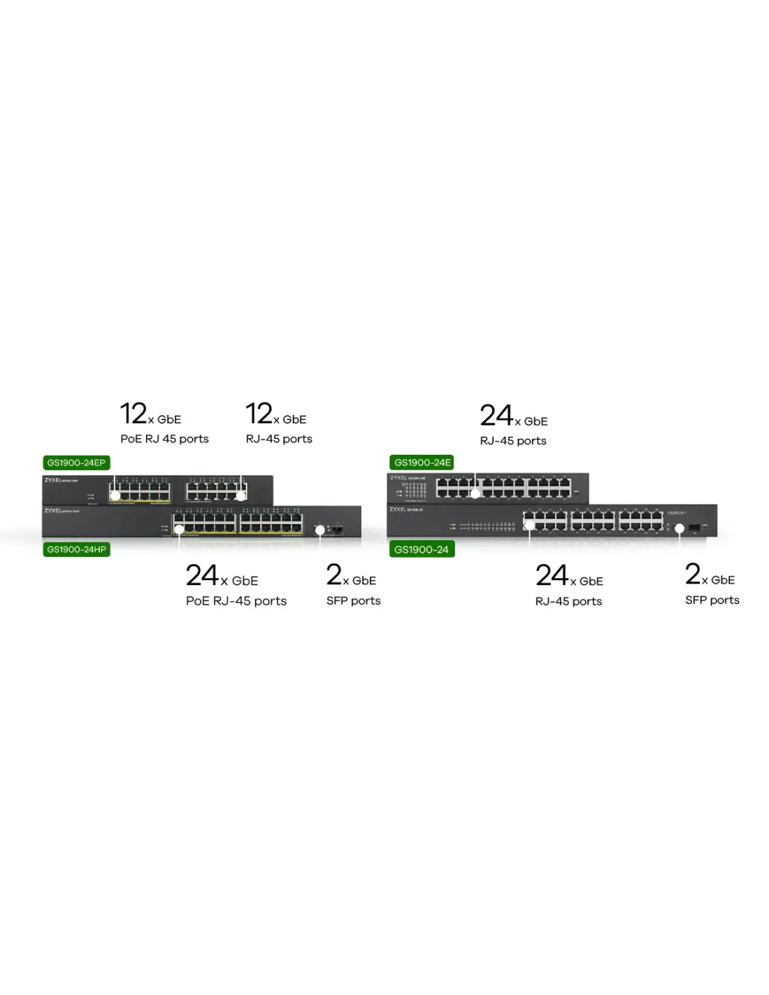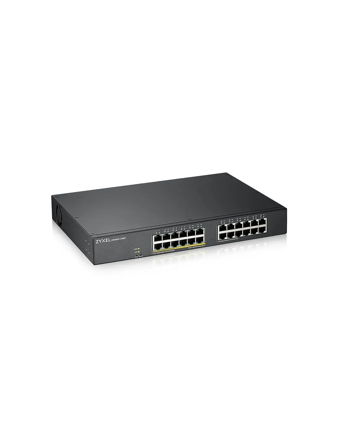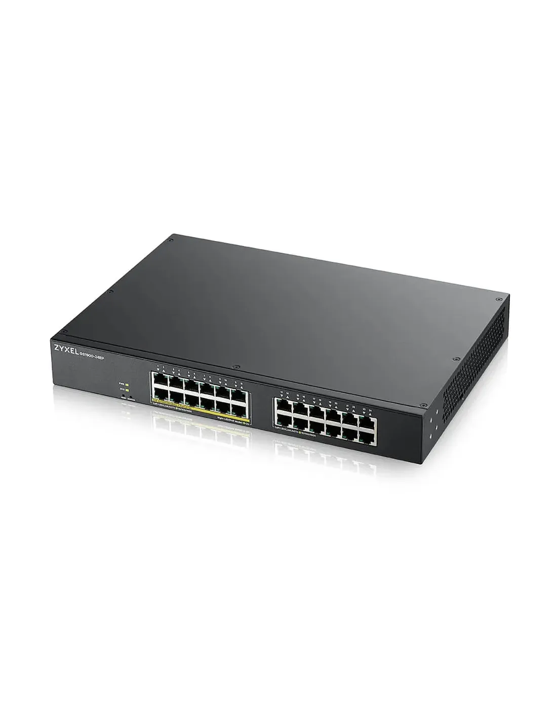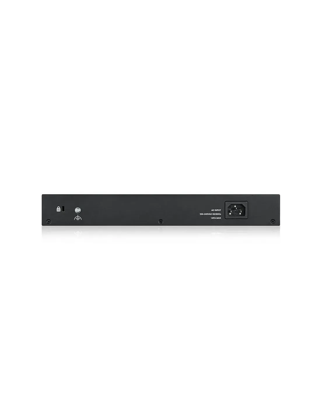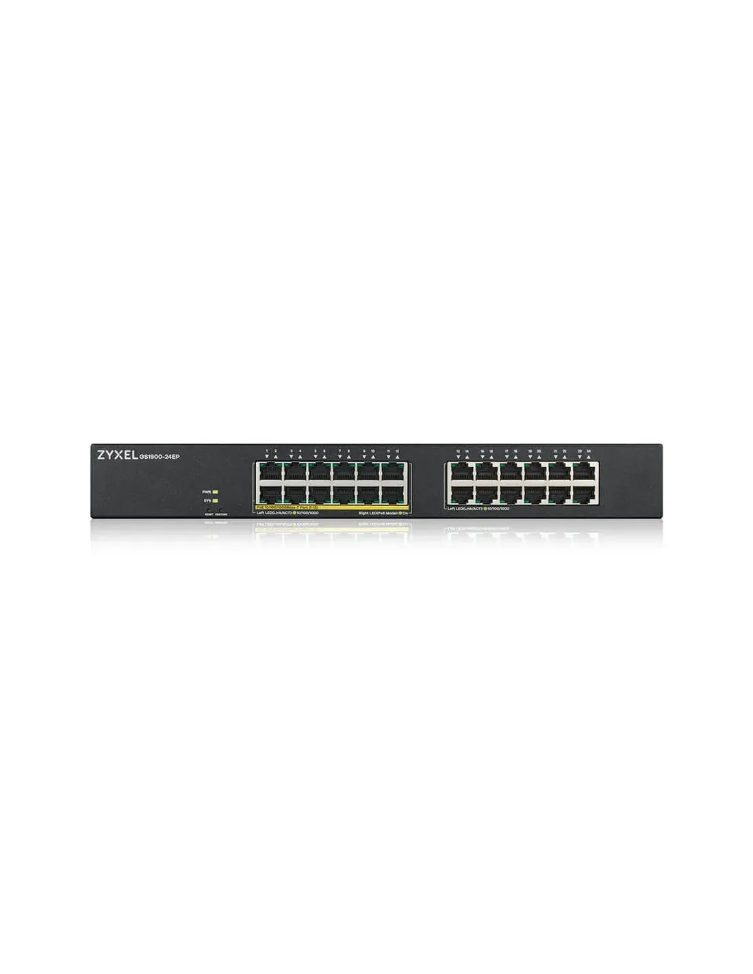 Zyxel GS1900-24EP. Tipo de interruptor: Gestionado, Capa del interruptor: L2. Puertos tipo básico de conmutación RJ-45 Ethernet: Gigabit Ethernet (10/100/1000), Cantidad de puertos básicos de conmutación RJ-45 Ethernet: 24. Bidireccional completo (Full duplex). Tabla de direcciones MAC: 8000 entradas, Capacidad de conmutación: 48 Gbit/s. Estándares de red: IEEE 802.1D, IEEE 802.1ab, IEEE 802.1af, IEEE 802.1s, IEEE 802.1w, IEEE 802.3at, IEEE 802.3az,.... Conector eléctrico: Conector de alimentación AC-in. Energía sobre Ethernet (PoE). Montaje en rack