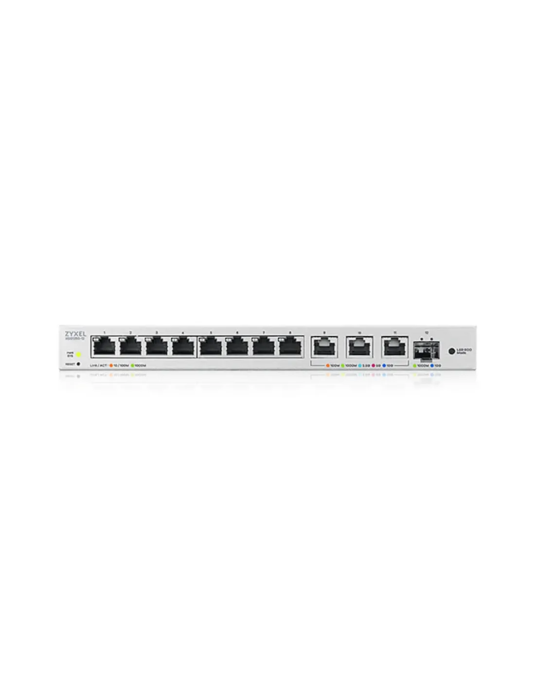Zyxel XGS1250-12. Tipo de interruptor: Gestionado, Capa del interruptor: L2. Puertos tipo básico de conmutación RJ-45 Ethernet: 10G Ethernet (100/1000/10000), Cantidad de puertos básicos de conmutación RJ-45 Ethernet: 11. Bidireccional completo (Full duplex). Tabla de direcciones MAC: 16000 entradas, Capacidad de conmutación: 96 Gbit/s. Estándares de red: IEEE 802.3, IEEE 802.3ab, IEEE 802.3ae, IEEE 802.3an, IEEE 802.3az, IEEE 802.3u, IEEE 802.3x. Conector eléctrico: Toma de entrada de CC. Montaje de pared