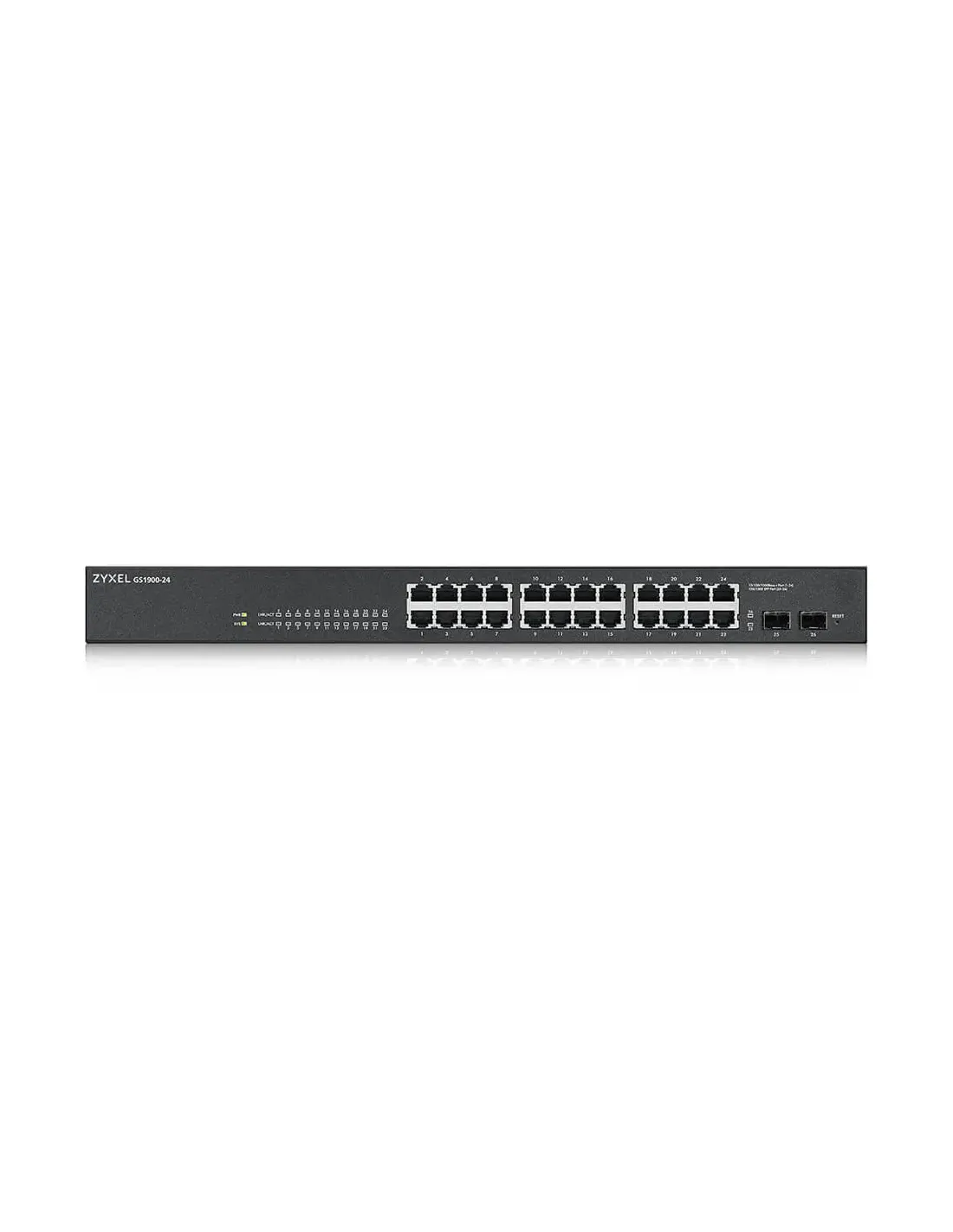 Zyxel GS-1900-24 v2. Tipo de interruptor: Gestionado, Capa del interruptor: L2. Puertos tipo básico de conmutación RJ-45 Ethernet: Gigabit Ethernet (10/100/1000), Cantidad de puertos básicos de conmutación RJ-45 Ethernet: 24. Bidireccional completo (Full duplex). Tabla de direcciones MAC: 8000 entradas, Capacidad de conmutación: 52 Gbit/s. Estándares de red: IEEE 802.1D, IEEE 802.1p, IEEE 802.1s, IEEE 802.1w, IEEE 802.3, IEEE 802.3ab, IEEE 802.3af, IEEE.... Conector eléctrico: Conector de alimentación AC-in. Montaje en rack, Factor de forma: 1U