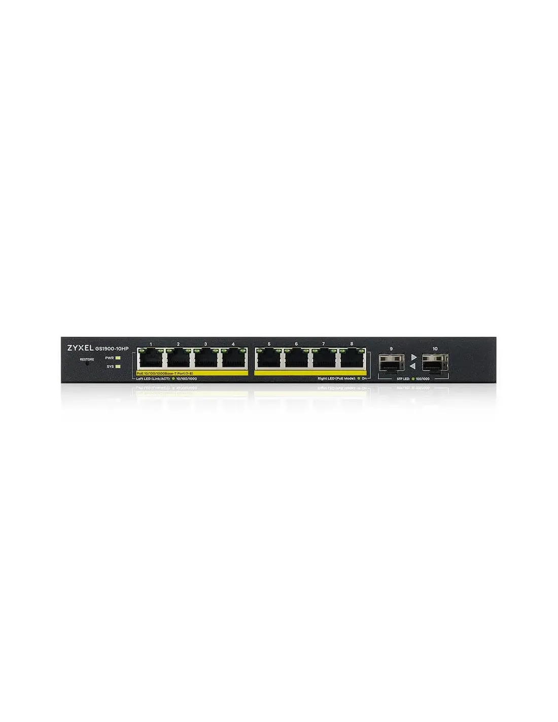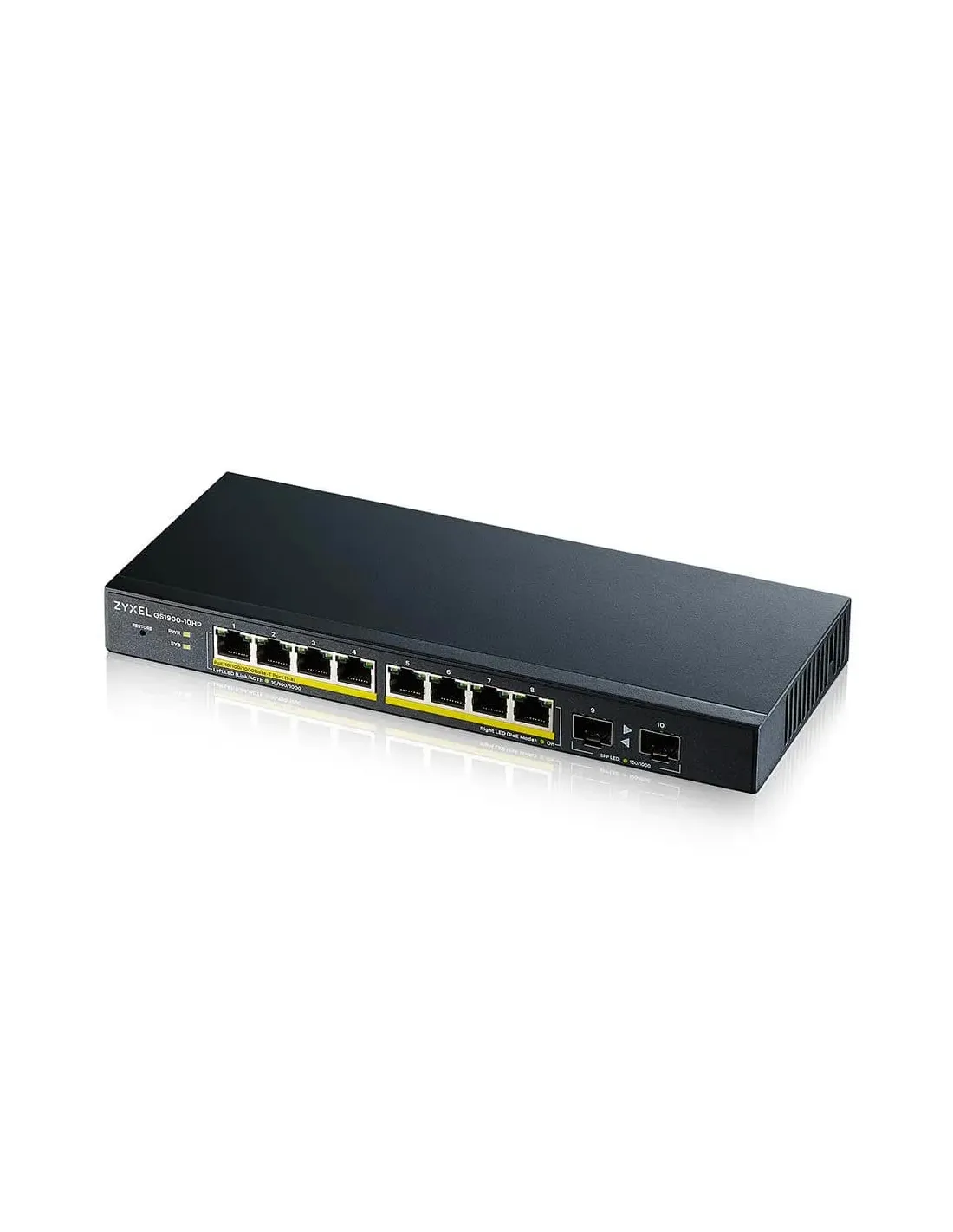 Zyxel GS1900-10HP. Tipo de interruptor: Gestionado, Capa del interruptor: L2. Puertos tipo básico de conmutación RJ-45 Ethernet: Gigabit Ethernet (10/100/1000), Cantidad de puertos básicos de conmutación RJ-45 Ethernet: 8, Puerto de consola: RJ-45. Tabla de direcciones MAC: 8000 entradas, Capacidad de conmutación: 20 Gbit/s. Estándares de red: IEEE 802.1D, IEEE 802.1p, IEEE 802.1s, IEEE 802.1w, IEEE 802.3, IEEE 802.3ab, IEEE 802.3at, IEEE.... Energía sobre Ethernet (PoE). Montaje de pared