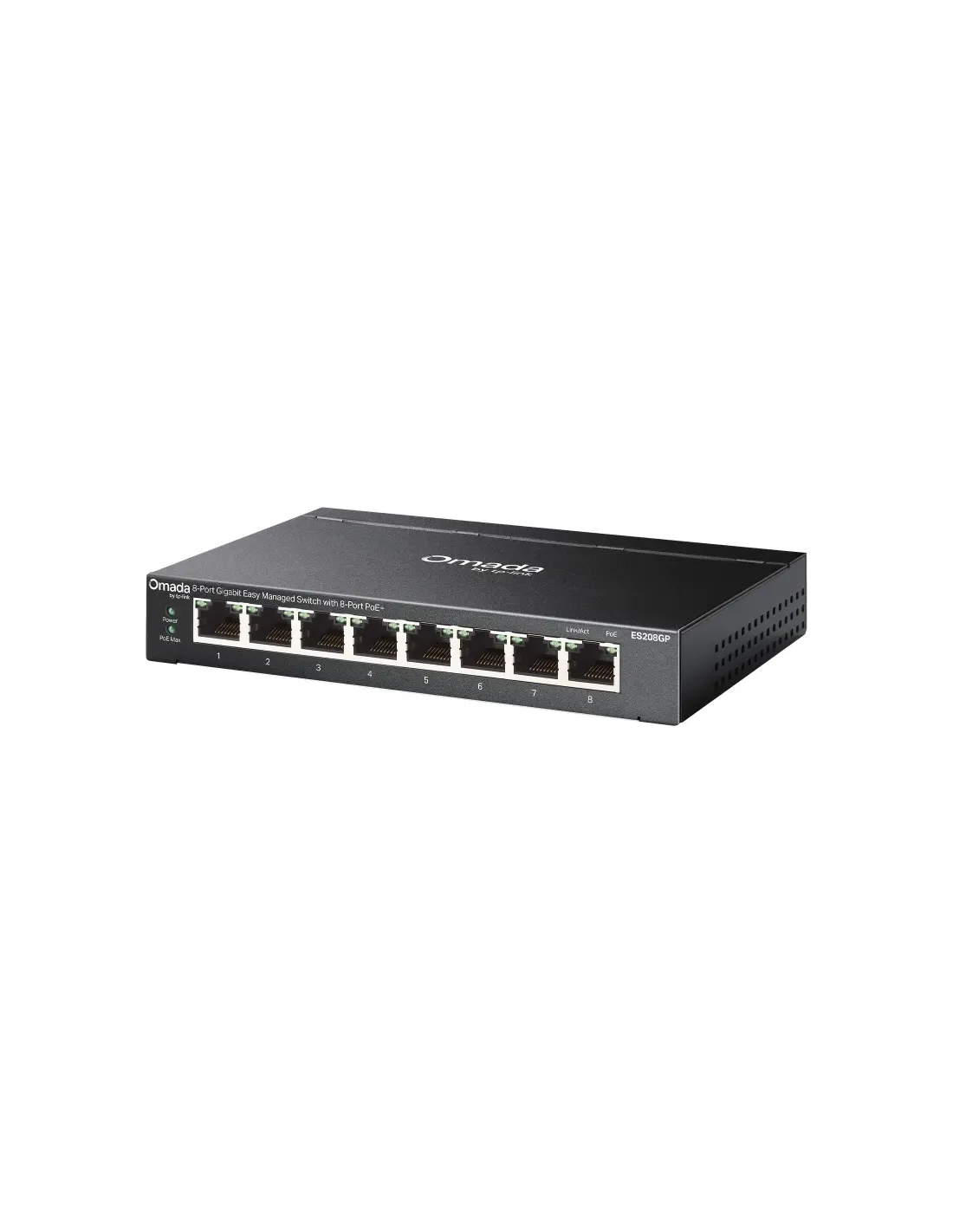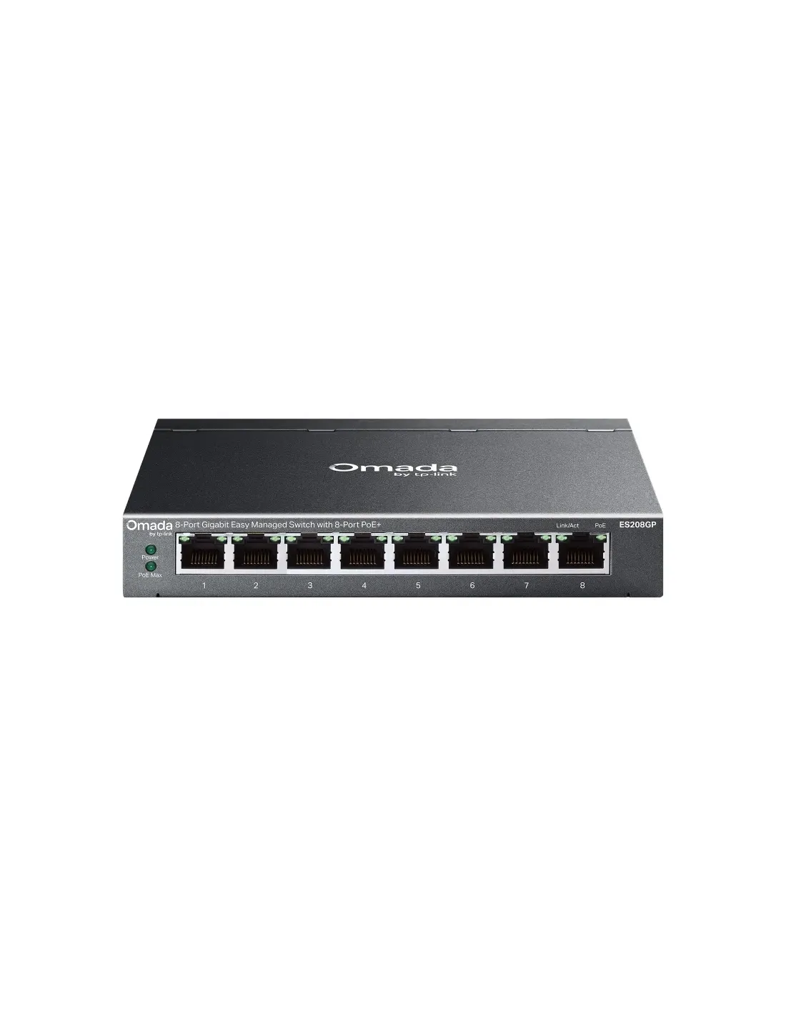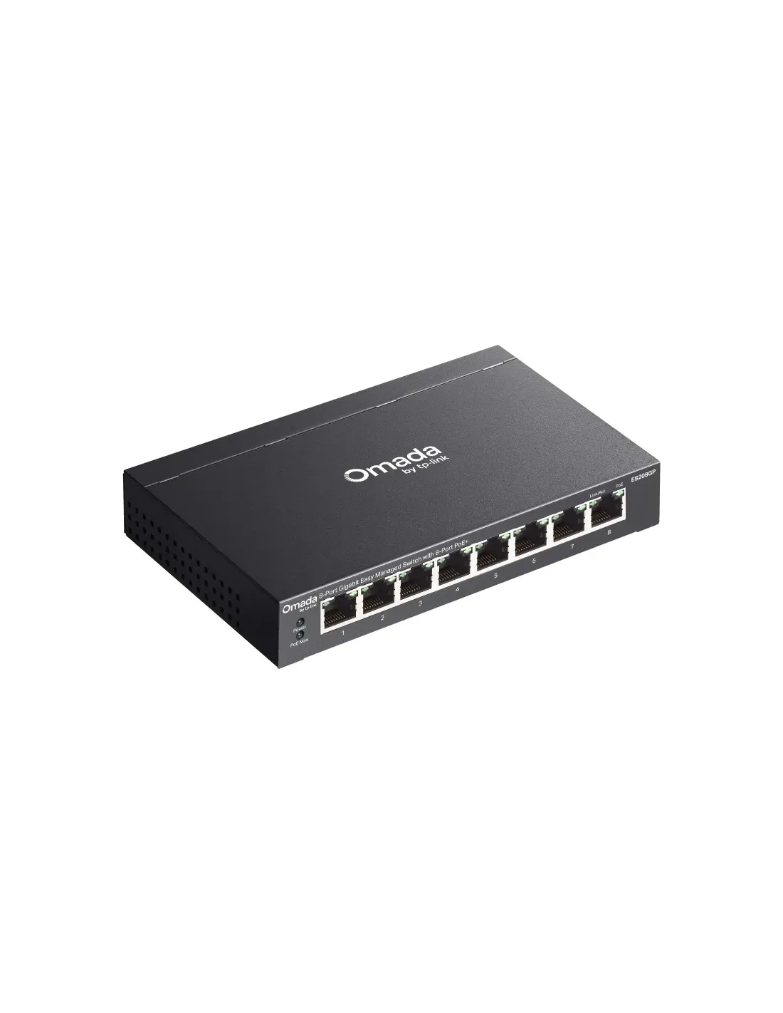 TP-Link Omada ES208GP. Tipo de interruptor: Gestionado, Capa del interruptor: L2. Puertos tipo básico de conmutación RJ-45 Ethernet: Gigabit Ethernet (10/100/1000), Cantidad de puertos básicos de conmutación RJ-45 Ethernet: 8. Tabla de direcciones MAC: 8000 entradas, Capacidad de conmutación: 16 Gbit/s. Estándares de red: IEEE 802.3af, IEEE 802.3at, IEEE 802.3bt. Voltaje de entrada DC: 53 V. Energía sobre Ethernet (PoE). Montaje en rack, Factor de forma: DIN rail