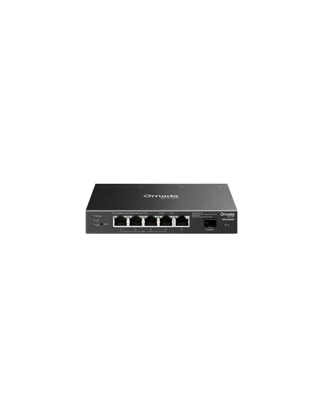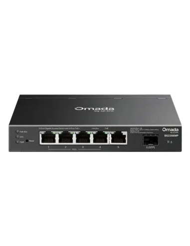 TP-Link SG2206MP. Capa del interruptor: L2. Puertos tipo básico de conmutación RJ-45 Ethernet: Gigabit Ethernet (10/100/1000), Cantidad de puertos básicos de conmutación RJ-45 Ethernet: 5, Número de módulos SFP instalados: 1. Tabla de direcciones MAC: 8000 entradas, Capacidad de conmutación: 12 Gbit/s. Voltaje de entrada DC: 53.5 V. Energía sobre Ethernet (PoE). Montaje en rack