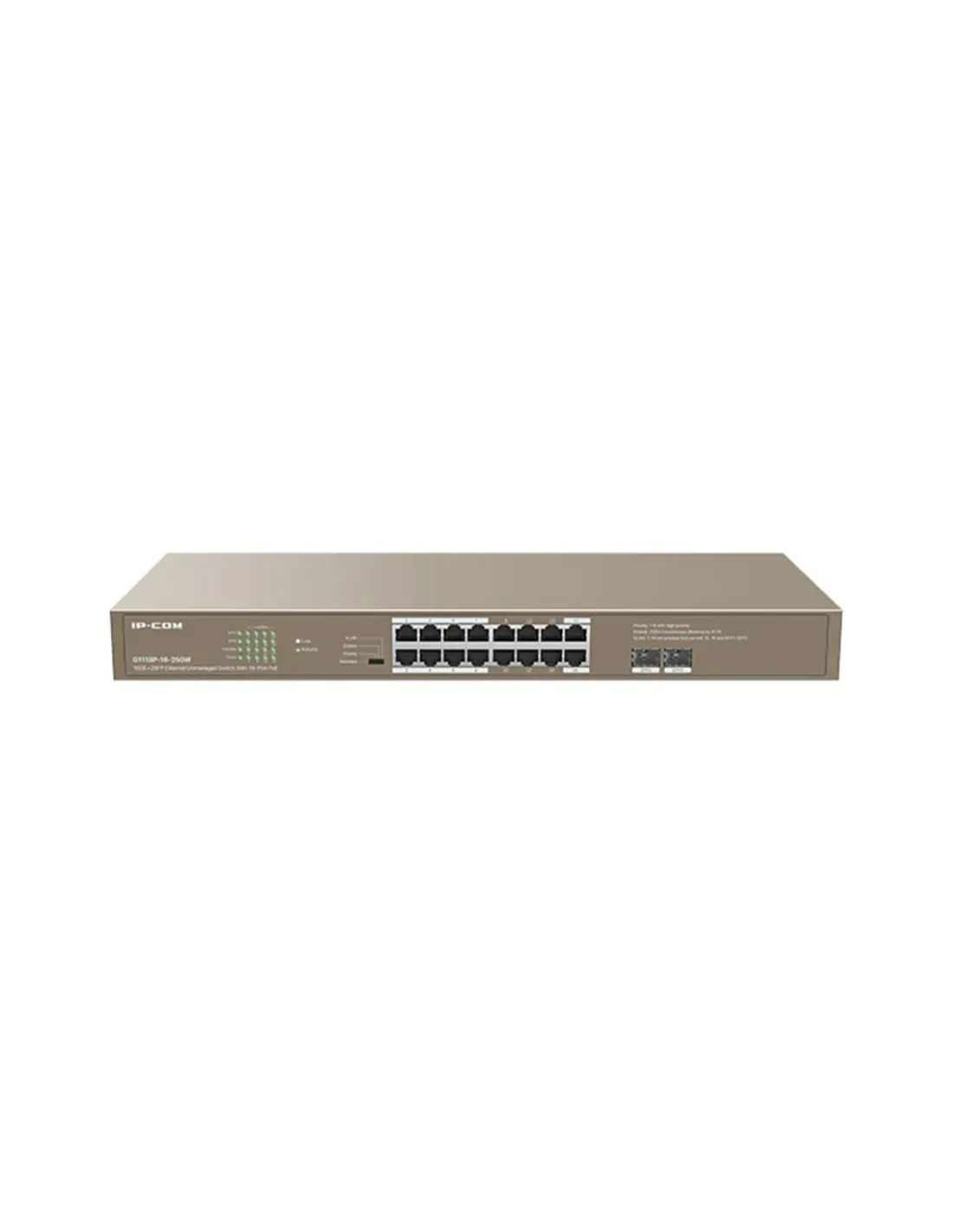 G1118P-16-250WConmutador Ethernet no administrado 16GE+2SFP con PoE de 16 puertosCumple con los estándares IEEE802.3, IEEE802.3u, IEEE802.3ab,IEEE802.3z, IEEE802.3x e IEEE802.3af/at.16 * 100/1000 Mbps Base-T RJ45 puertos para transmisión de datos yfuente de alimentación,2 ranuras SFP Base-X de 1000 Mbps.Tabla de direcciones MAC de 8K y autoaprendizaje de direcciones MAC.Control de flujo de dúplex completo y control de flujo de contrapresiónsemidúplex compatible con IEEE 802.3x.Ancho de banda de placa posterior de 36 Gbps.Consumo máximo de energía de un solo puerto: 30W, Consumo máximode energía del interruptor: 250W.4 modos: estándar, prioritario, extendido y VLAN.Montaje en bastidor.Modelo G1118P-16-250WInterfaces 16 puertos Base-T RJ45 de 100/1000 Mbps (datos/alimentación)2 puertos SFP Base-X de 1000 MbpsProtección contra rayos 6KVModo de reenvío Almacenamiento y reenvíoCapacidad de conmutación 36 GbpsTasa de reenvío de paquetes 26,8 MppsAmortiguador 2MTabla de direcciones MAC 8KLos puertos de suministro PoE 1-16 admiten el estándar IEEE802.3af/a unasalida de 30 W por puerto PoESalida de 230 W de la potencia PoE totalConsumo de energía 250W salida todo el dispositivoVoltaje de entrada CA: 100-240V~50/60HzDimensiones 440*178.8*44mmEstándar de cuatro modos: modo predeterminado del interruptor. En estemodo, funciona como un conmutador no administrado, todos los puertospueden comunicarse entre sí por separado.Prioridad: en este modo, los puertos 15, 16, SFP1 y SFP2 sirven comopuertos de enlace ascendente, los puertos 1 a 8 sirven como puertos dealta prioridad. Todos los puertos pueden comunicarse entre sí porseparado.Extender: en este modo, la velocidad de datos de los puertos 9 - 14 sereduce a 10 Mbps, la distancia máxima de transmisión puede ser de 250metros y todos los puertos pueden comunicarse entre sí.VLAN: en este modo, los puertos 1 - 14 del conmutador puedencomunicarse con el puerto 15, 16, SFP1, SFP2 por separado, pero nopueden comunicarse entre sí.Puede habilitar este modo para reducir la tormenta de transmisión y aislarla transmisión DHCP.Entorno operativo Temperatura de funcionamiento: 0 ~ 45 (32 ~ 113 )Temperatura de almacenamiento: -40 ~ 70 (-40 ~ 158 )Humedad de funcionamiento: 10 %~90 % sin condensaciónHumedad de almacenamiento: 5 %~90 % sin condensaciónCertificados FCC, CE, RoHS