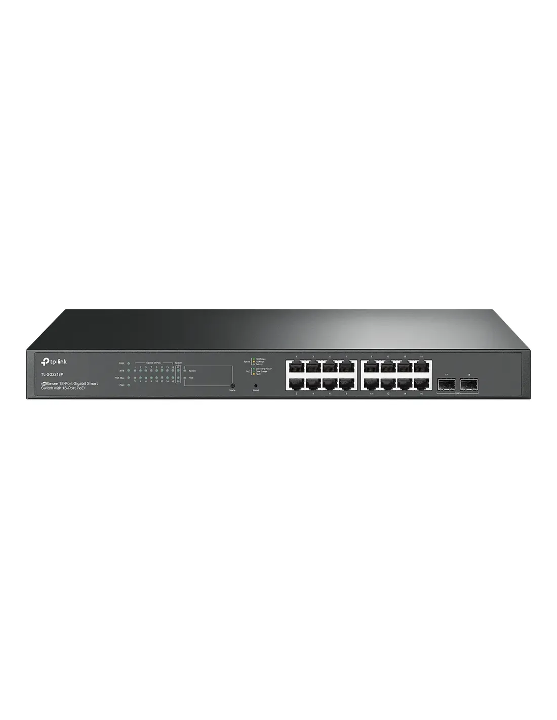 TP-LINK JETSTREAM™ 18-PORT GIGABIT SMART SWITCH WITH 16-PORT POE+ PORT: 16× GIGABIT RJ45 PORTS, 2× GIGABIT SFP SLOTS SPEC: 802.3AT/AF, 150 W POE POWER, 1U 19-INCH RACK-MOUNTABLE STEEL CASE FEATURE: INTEGRATION WITH OMADA SDN CONTROLLER, STATIC ROUTING,