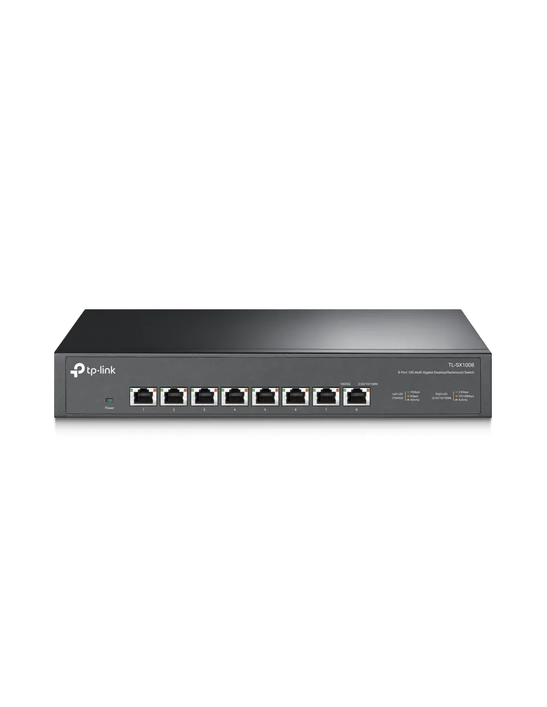 TP-Link TL-SX1008. Tipo de interruptor: No administrado. Puertos tipo básico de conmutación RJ-45 Ethernet: 10G Ethernet (100/1000/10000), Cantidad de puertos básicos de conmutación RJ-45 Ethernet: 8. Tabla de direcciones MAC: 32000 entradas, Capacidad de conmutación: 160 Gbit/s. Estándares de red: IEEE 802.3,IEEE 802.3ab,IEEE 802.3an,IEEE 802.3bz,IEEE 802.3p,IEEE 802.3x