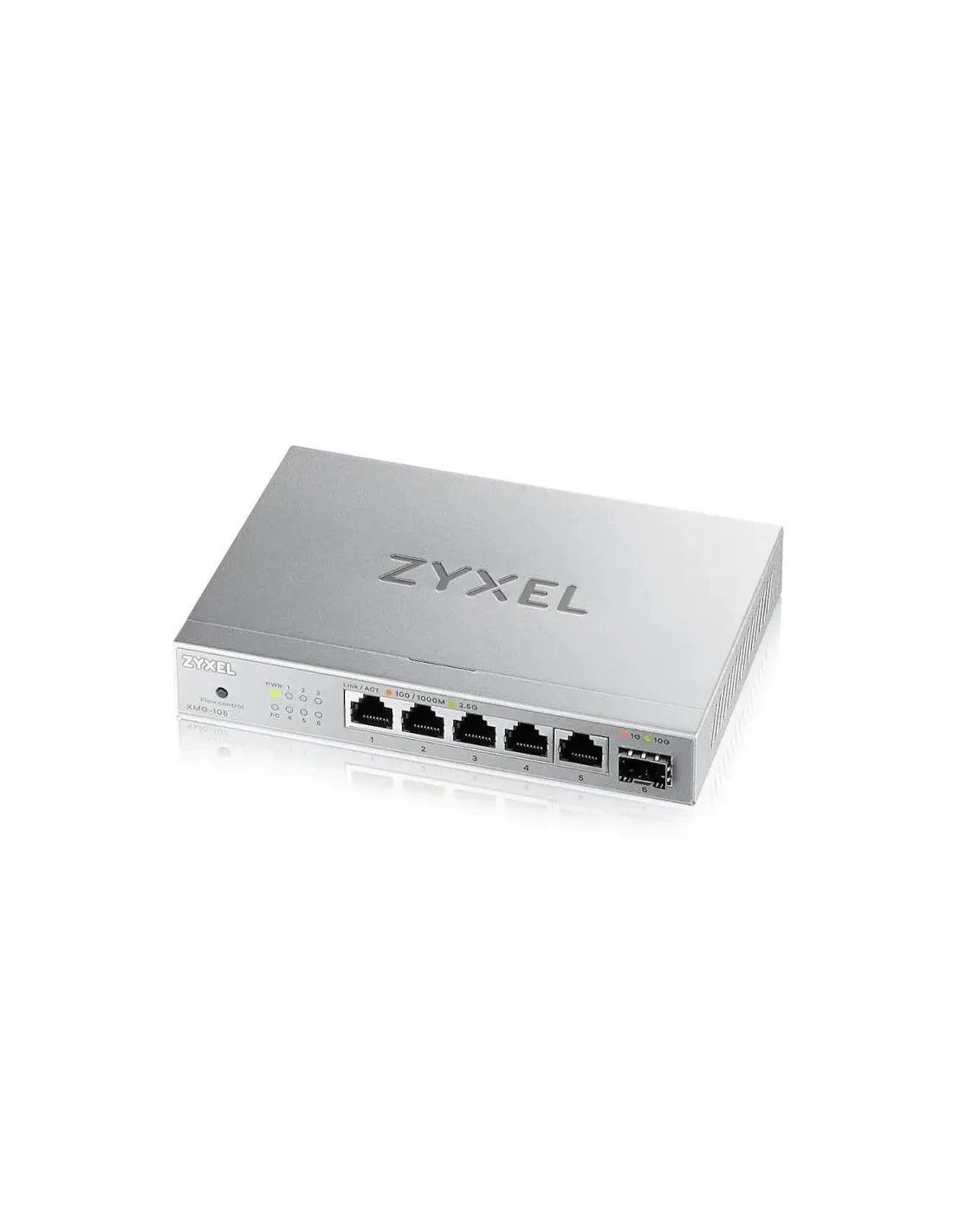 Marca Zyxel Modelo XMG-105 Interfaces Rendimiento - 5 x 2,5GBASE-T - 1 x 1G SFP / 10G SFP+ - Switching capacity 45 Gbps - Forwarding rate 33,5 Mpps Especificaciones Características del sistema - Switch no gestionado de 5 puertos 2,5G con uplink de 10G - Tabla de direcciones MAC 4K - Buffer de paquetes 1 MB - Jumbo frame hasta 12K - Sin ventilador Entorno - Temperatura de funcionamiento -20 °C a 40 °C - Temperatura de almacenamiento -40 °C a 70 °C - Humedad de funcionamiento 10–95 % sin condensación - Humedad de almacenamiento 5–95 % sin condensación - MTBF 1.988.168 horas - Disipación de calor 19,79 BTU/hr Alimentación - Entrada 100–240 V AC, 50/60 Hz - Fuente de alimentación externa - Consumo de energía máximo 9,12 W - Consumo de energía mínimo 1,56 W Dimensiones y peso - 160 x 110 x 26 mm - 0,451 kg Fecha de revisión 09-04-2026 por IS