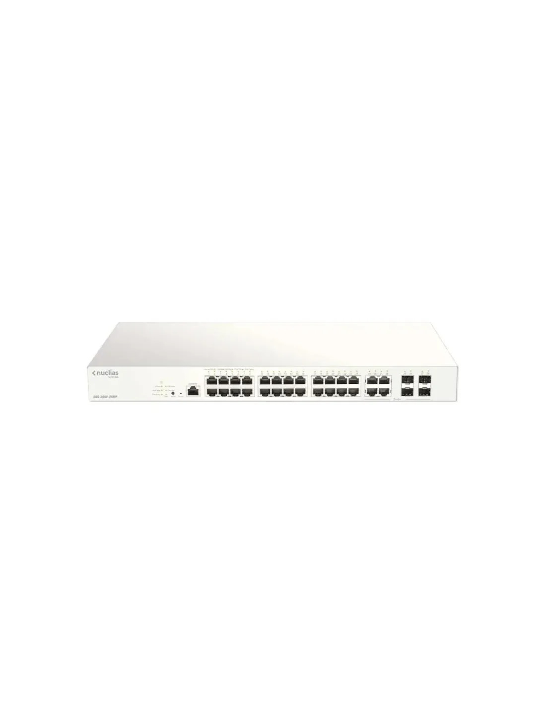 D-Link DBS-2000-28MP/E. Tipo de interruptor: Gestionado, Capa del interruptor: L2. Puertos tipo básico de conmutación RJ-45 Ethernet: Gigabit Ethernet (10/100/1000), Cantidad de puertos básicos de conmutación RJ-45 Ethernet: 24, Puerto de consola: RJ-45. Tabla de direcciones MAC: 8000 entradas, Capacidad de conmutación: 56 Gbit/s. Estándares de red: IEEE 802.3ad, IEEE 802.3at. Energía sobre Ethernet (PoE). Montaje en rack