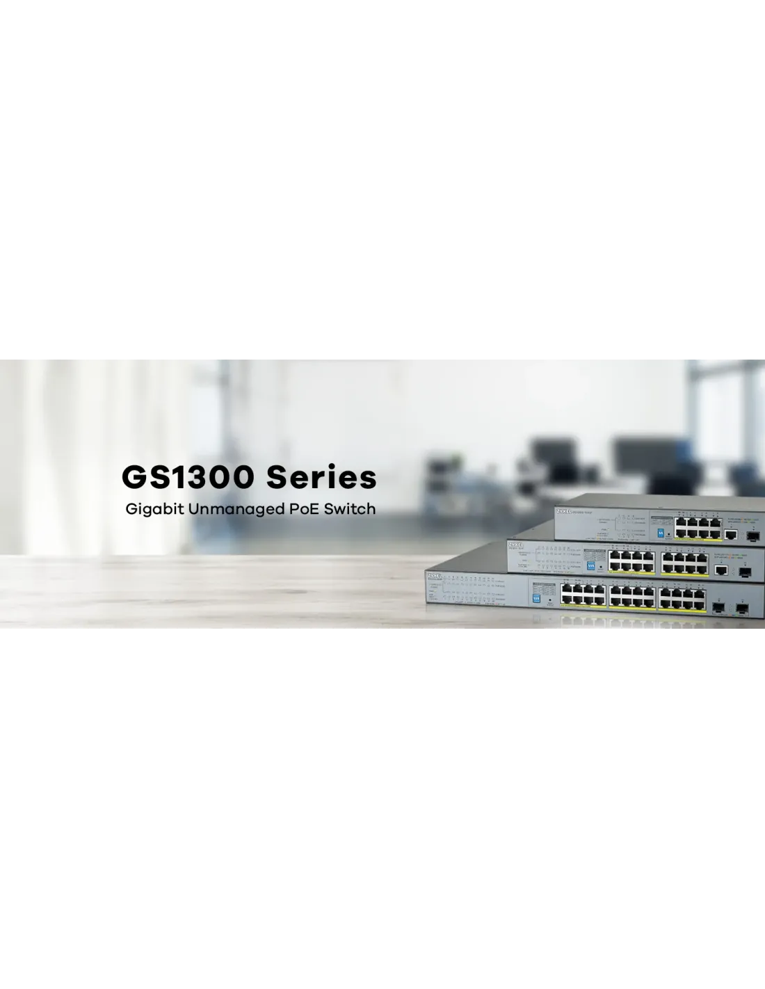 Zyxel GS1300-26HP-EU0101F. Tipo de interruptor: No administrado. Puertos tipo básico de conmutación RJ-45 Ethernet: Gigabit Ethernet (10/100/1000), Cantidad de puertos básicos de conmutación RJ-45 Ethernet: 24. Tabla de direcciones MAC: 8000 entradas, Capacidad de conmutación: 52 Gbit/s. Estándares de red: IEEE 802.1p, IEEE 802.3, IEEE 802.3ab, IEEE 802.3af, IEEE 802.3at, IEEE 802.3az, IEEE 802.3u, IEEE.... Energía sobre Ethernet (PoE). Montaje en rack
