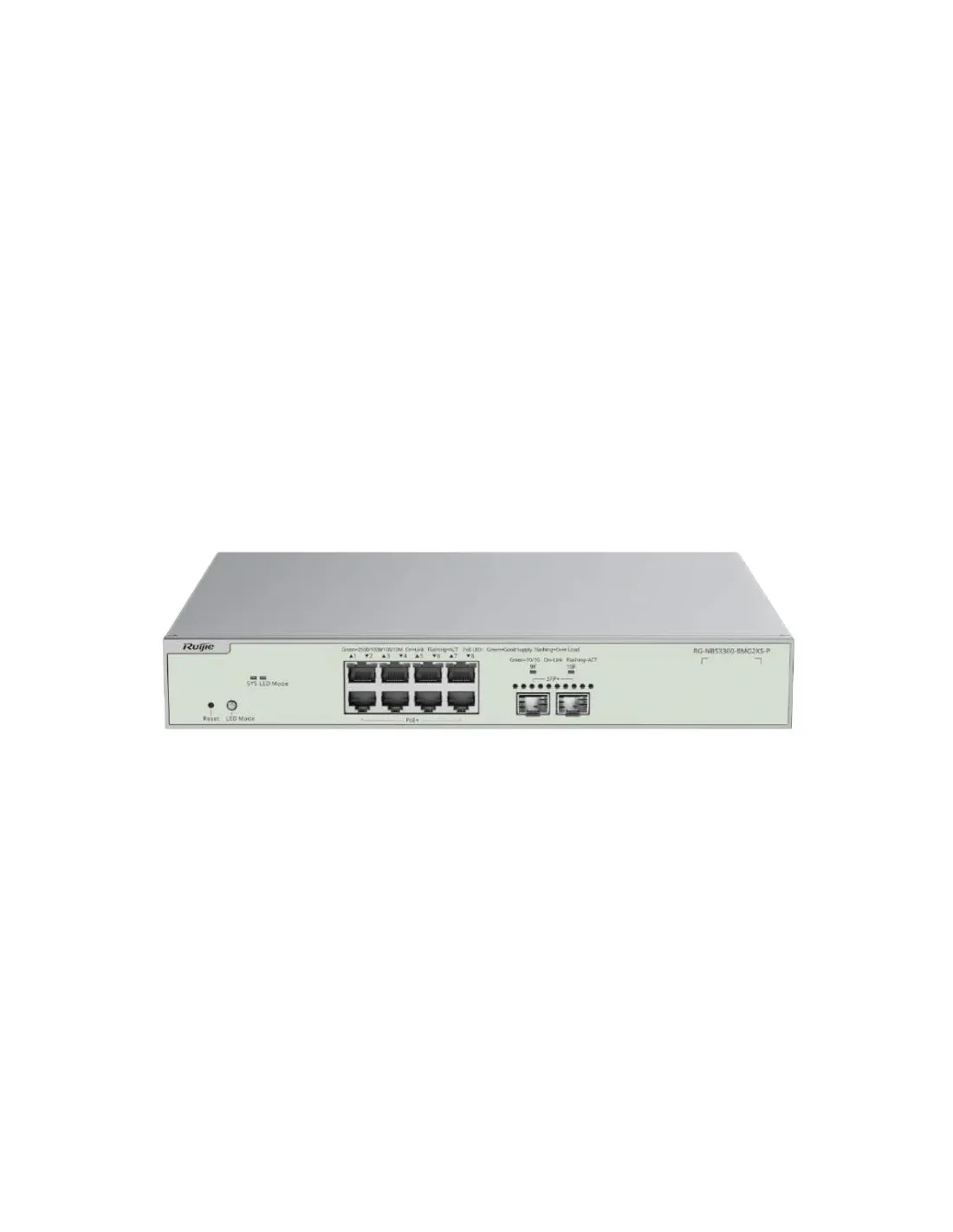 Marca Reyee Modelo RG-NBS3300-8MG2XS-P Interfaces - 8 x puertos RJ45 - 2 x puertos opticos - 2 x puertos 10GE SFP+ - 8 x puertos 10/100/1000/2500BASE-T Rendimiento - Capacidad de conmutacion: 80 Gbps - Tasa de reenvio: 59,52 Mpps - Jumbo frame: 9216 bytes Especificaciones PoE - 8 x puertos PoE - 8 x puertos PoE/PoE+ - Presupuesto PoE: 240 W - Pines PoE: 1–2 (+), 3–6 (-) Software - PoE Watchdog - Aislamiento de puertos - Control de tormentas broadcast Entorno - MTBF: 400000 horas - Temperatura de operacion: 0 °C a 50 °C - Altitud de operacion: -500 m a +5000 m - Proteccion contra sobretensiones: Puertos de servicio: ±6 kV modo comun Conector de alimentacion: ±6 kV modo comun y diferencial Fecha de revision 09-12-2025 por IS