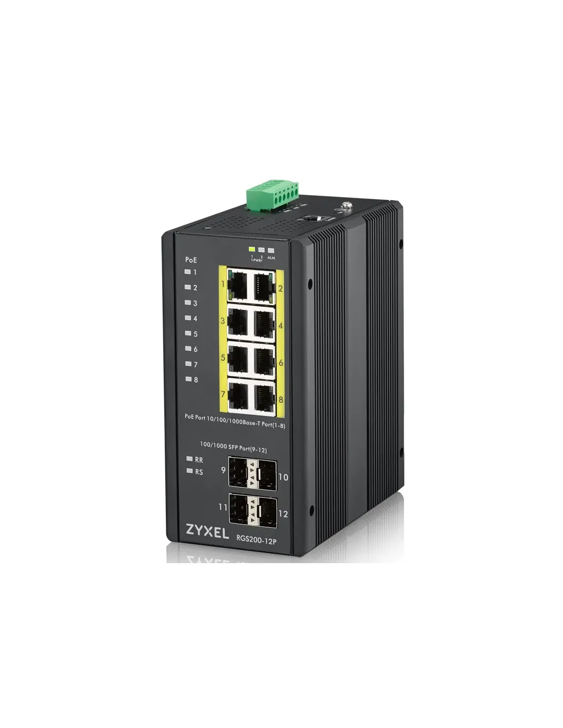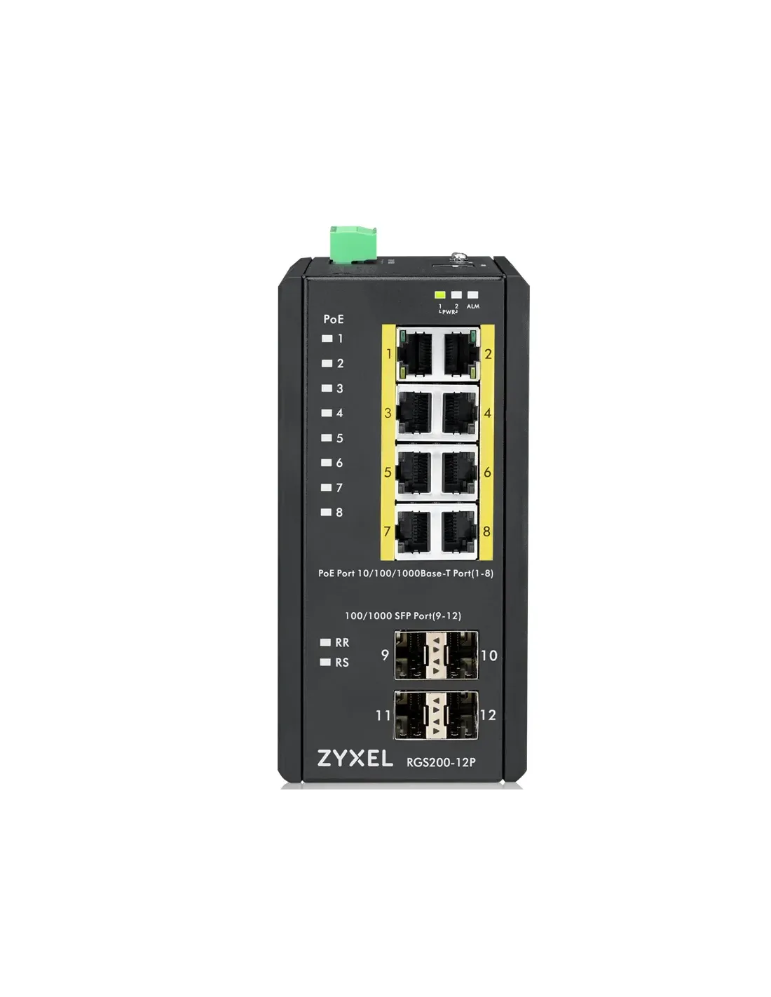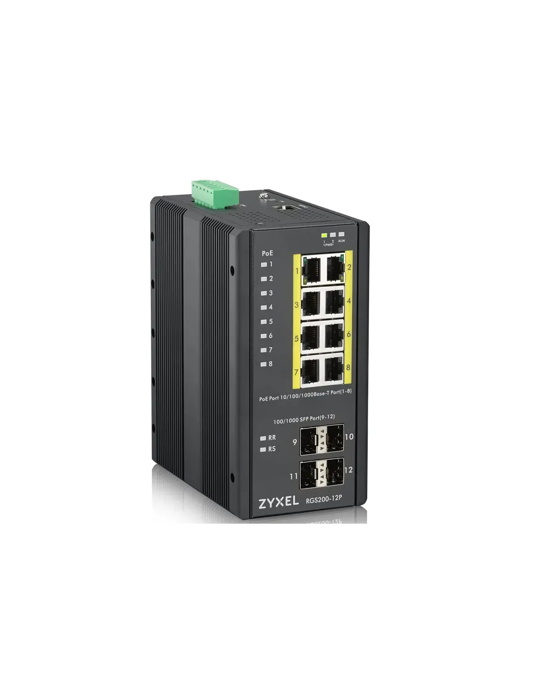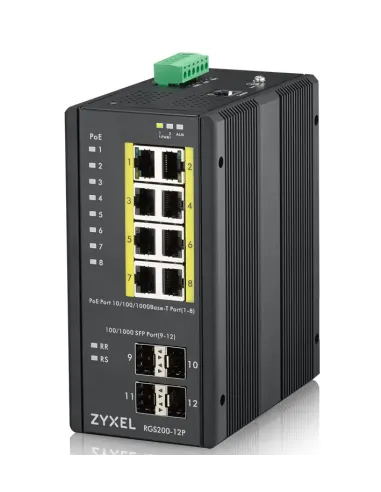 Zyxel RGS200-12P. Tipo de interruptor: Gestionado, Capa del interruptor: L2. Puertos tipo básico de conmutación RJ-45 Ethernet: Gigabit Ethernet (10/100/1000), Cantidad de puertos básicos de conmutación RJ-45 Ethernet: 8. Bidireccional completo (Full duplex). Tabla de direcciones MAC: 8000 entradas, Capacidad de conmutación: 24 Gbit/s. Estándares de red: IEEE 802.1D, IEEE 802.1Q, IEEE 802.1ab, IEEE 802.1p, IEEE 802.1s, IEEE 802.1w, IEEE 802.3, IEEE.... Voltaje de entrada DC: 12 - 58 V. Energía sobre Ethernet (PoE). Montaje de pared, Montaje en rack