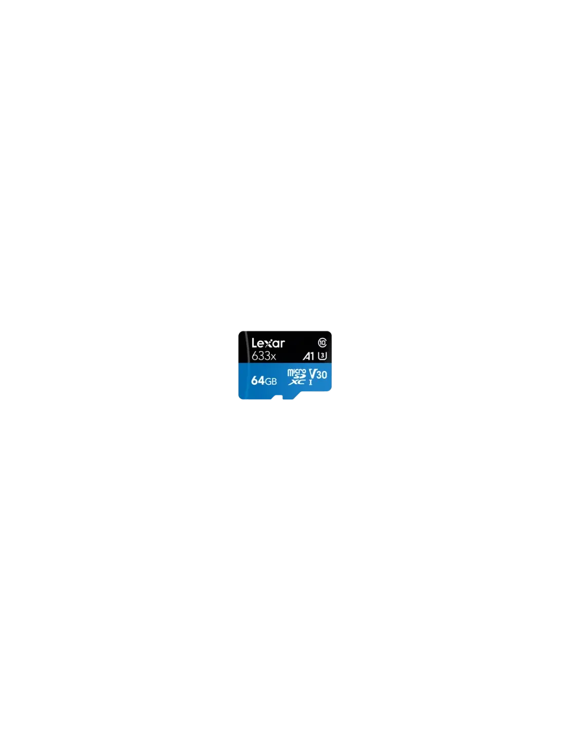 Lexar 633x. Capacidad: 64 GB, Tipo de tarjeta flash: MicroSDXC, Clase de memoria flash: Clase 10, Tipo de memoria interna: UHS-I, Velocidad de lectura: 100 MB/s, Velocidad de escritura: 45 MB/s, Clase de velocidad UHS: Class 3 (U3), Clase de velocidad de vídeo: V30. Color del producto: Negro, Azul