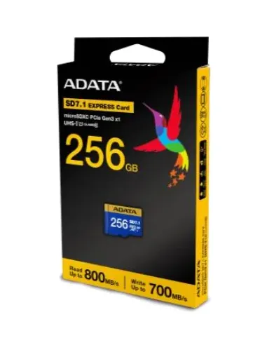 ADATA UD256GEX3L1-C. Capacidad: 256 GB, Tipo de tarjeta flash: MicroSDXC, Tipo de memoria interna: UHS-II, Velocidad de lectura: 800 MB/s, Velocidad de escritura: 700 MB/s, Clase de velocidad UHS: Class 3 (U3), Clase de velocidad de vídeo: V30. Color del producto: Azul, Amarillo
