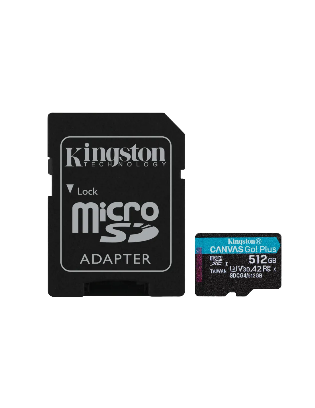 Kingston Technology Tarjeta microSDXC Canvas Go Plus Gen4 de 512 GB, 200 MB/s, A2 U3 V30 y adaptador. Capacidad: 512 GB, Tipo de tarjeta flash: MicroSD, Clase de memoria flash: Clase 10, Tipo de memoria interna: UHS-I, Velocidad de lectura: 200 MB/s, Velocidad de escritura: 160 MB/s, Clase de velocidad UHS: Class 3 (U3), Clase de velocidad de vídeo: V30. Color del producto: Negro, Turquesa