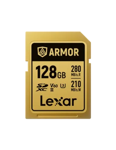 Lexar Armor Gold. Capacidad: 128 GB, Tipo de tarjeta flash: SDXC, Tipo de memoria interna: UHS-II, Velocidad de lectura: 280 MB/s, Velocidad de escritura: 210 MB/s, Clase de velocidad UHS: Class 3 (U3), Clase de velocidad de vídeo: V60. Funciones de protección: Protección contra caídas, Resistente al polvo, Resistente a la presión, Resistente al agua, Color del producto: Oro