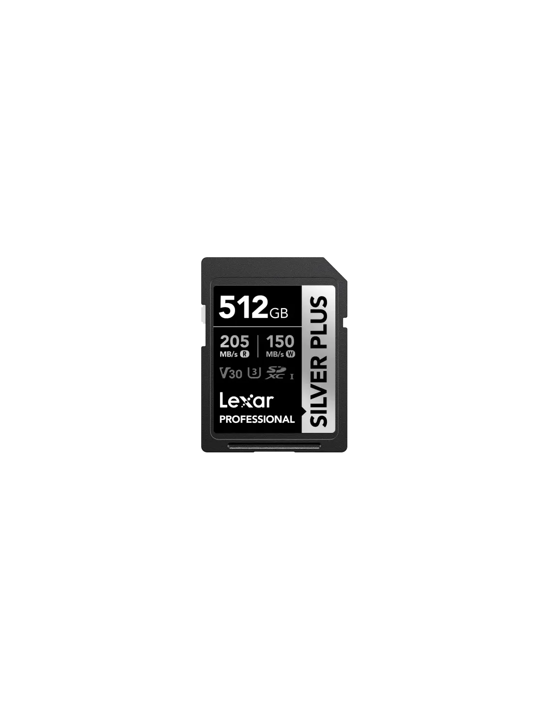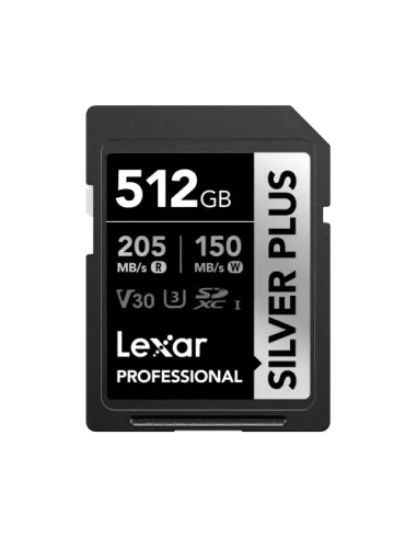 Lexar Professional SILVER PLUS. Capacidad: 512 GB, Tipo de tarjeta flash: SDXC, Tipo de memoria interna: UHS-I, Velocidad de lectura: 205 MB/s, Velocidad de escritura: 150 MB/s, Clase de velocidad UHS: Class 3 (U3), Clase de velocidad de vídeo: V30. Funciones de protección: Protección contra caídas, Protección contra campos magnéticos, Resistente a golpes, Resistente..., Color del producto: Negro