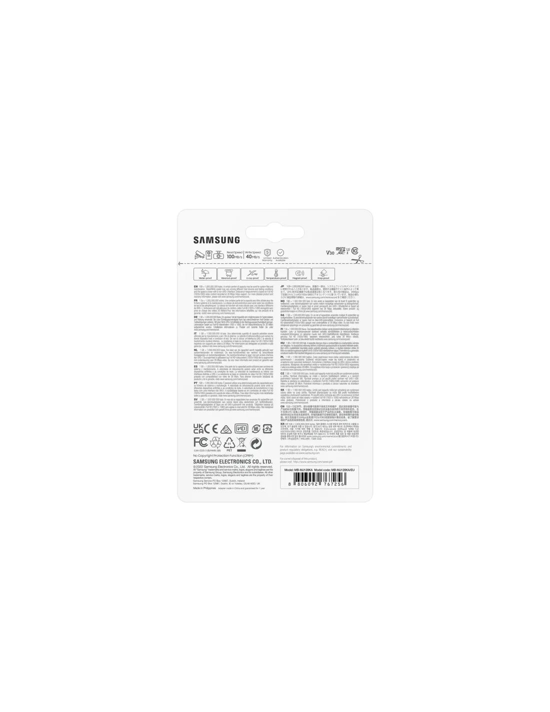 Samsung MB-MJ128K. Capacidad: 128 GB, Tipo de tarjeta flash: MicroSDXC, Clase de memoria flash: Clase 10, Tipo de memoria interna: UHS-I, Velocidad de lectura: 100 MB/s, Velocidad de escritura: 40 MB/s, Clase de velocidad UHS: Class 1 (U1), Clase de velocidad de vídeo: V30. Color del producto: Blanco