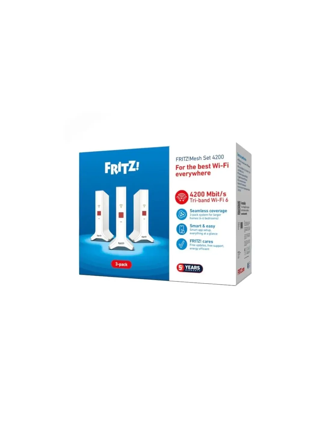Marca FRITZ! Modelo 20003109 Frecuencias - 2,4 GHz - 5 GHz Velocidades inalámbricas - Wi-Fi 6 hasta 4.200 Mbps - 5 GHz hasta 2.400 Mbps (4 x 4) - 5 GHz hasta 1.200 Mbps (2 x 2) - 2,4 GHz hasta 600 Mbps (2 x 2) Puertos - 2 x Gigabit Ethernet por repetidor Estándares inalámbricos - IEEE 802.11a/g/n/ac/ax (Wi?Fi 6) Seguridad - WPA2 - WPA3 - Red de invitados - Control parental con límites de tiempo y filtros Características - Repetidor inalámbrico de alto rendimiento - Tres radios para suministro óptimo de múltiples dispositivos simultáneos - Compatible con FRITZ!Box, otros routers o conexión directa a módem de fibra / ONT - Sistema Mesh Wi?Fi - Programación Wi?Fi - Conexión sencilla mediante WPS - Pantalla con estado y calidad de conexión - Interfaz de gestión vía navegador y app - Consumo medio 9 W por repetidor Dimensiones y peso - 90 × 190 × 145 mm Contenido - 3 x FRITZ!Repeater 3000 AX Fecha de revisión 10-02-2026 por IS