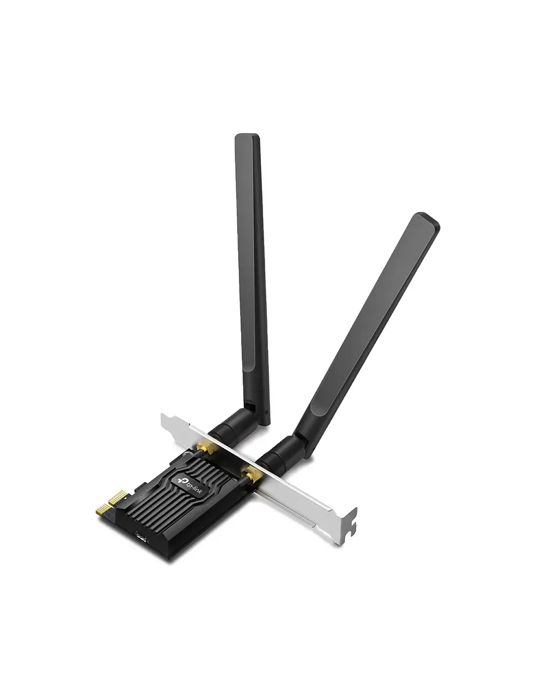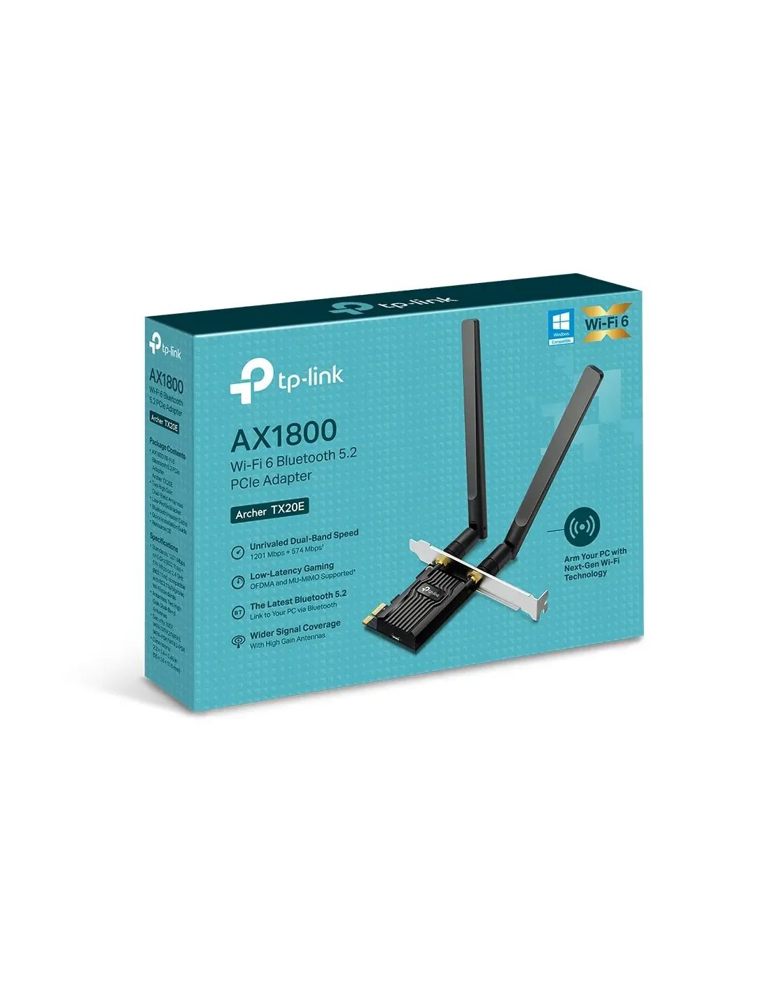 TP-LINK AX1800 DUAL BAND WI-FI 6 BLUETOOTH 5.2 PCI EXPRESS ADAPTER SPEED: 1201 MBPS AT 5 GHZ + 574 MBPS AT 2.4 GHZ SPEC: 2× HIGH GAIN EXTERNAL ANTENNAS FEATURE: MU-MIMO, OFDMA, WPA3, BLUETOOTH 5.2 ARCHER TX20E