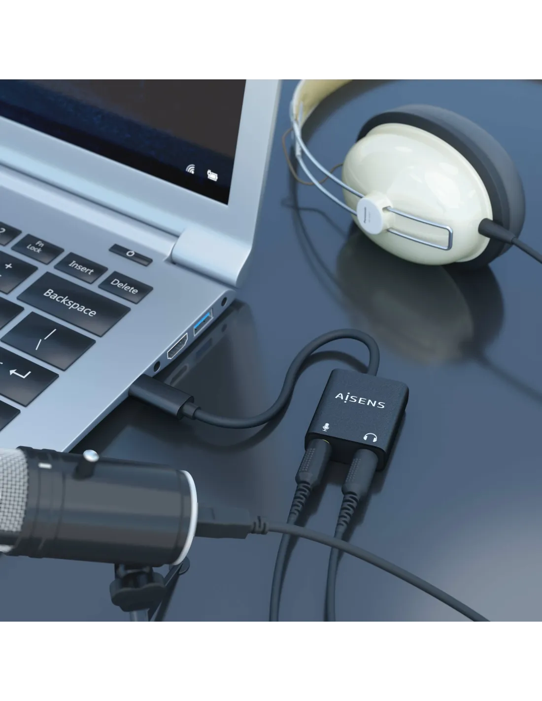 Conversor USB-C a AUDIO, con conector USB-C en un extremo y 2xJACK 3.5 3 pines hembra en el otro.Permite transmitir señales de USB a audio (auriculares y micrófono).No requiere software ni controladores, una solución totalmente plug and playTasa de muestreo: 16/24 bits 44.1K/48KRelación Señal/Ruido: >100dBRuido de fondo: La grabación y reproducción pueden soportar tasas de muestreo de 44.1KHz y 48KHz individualmente.