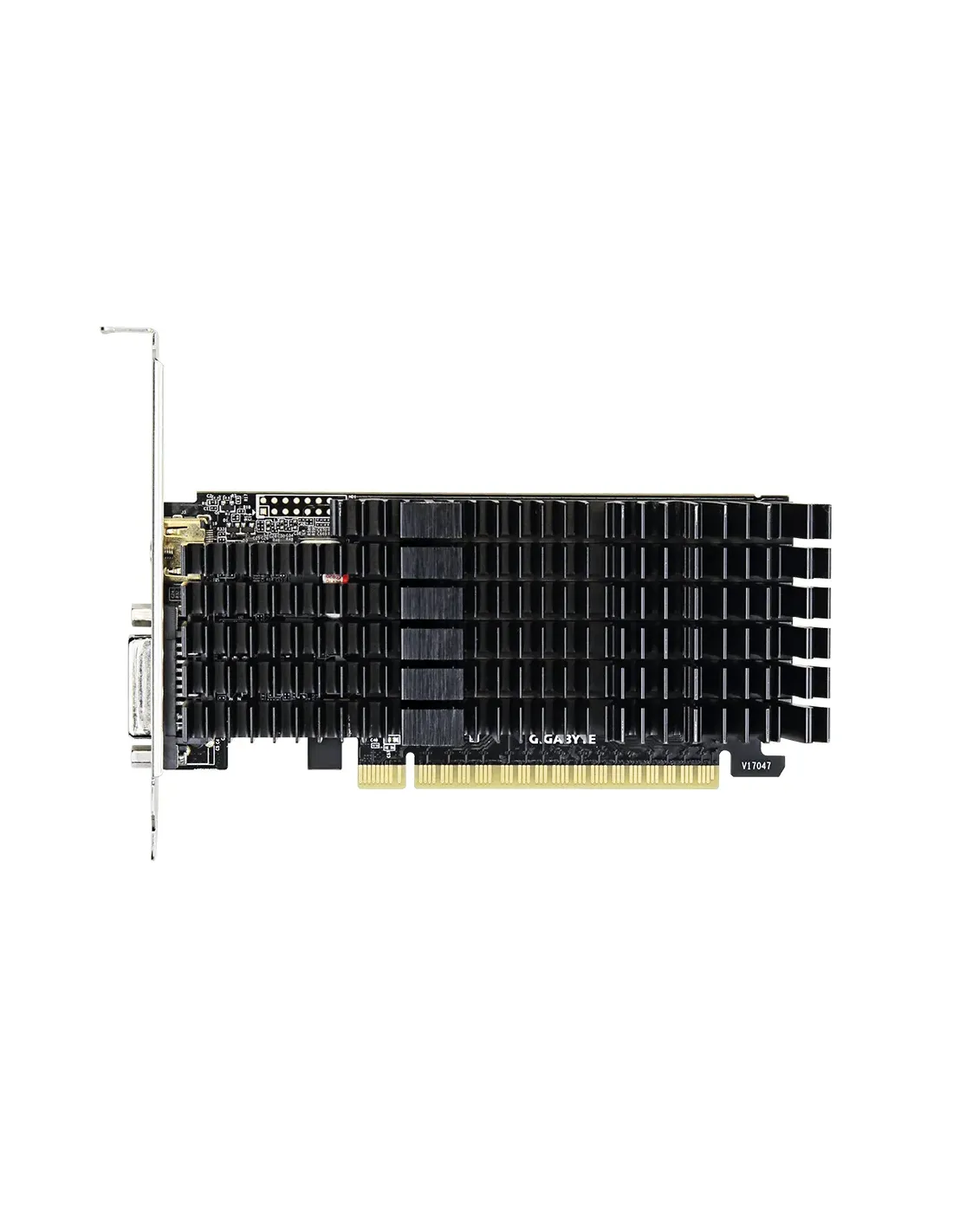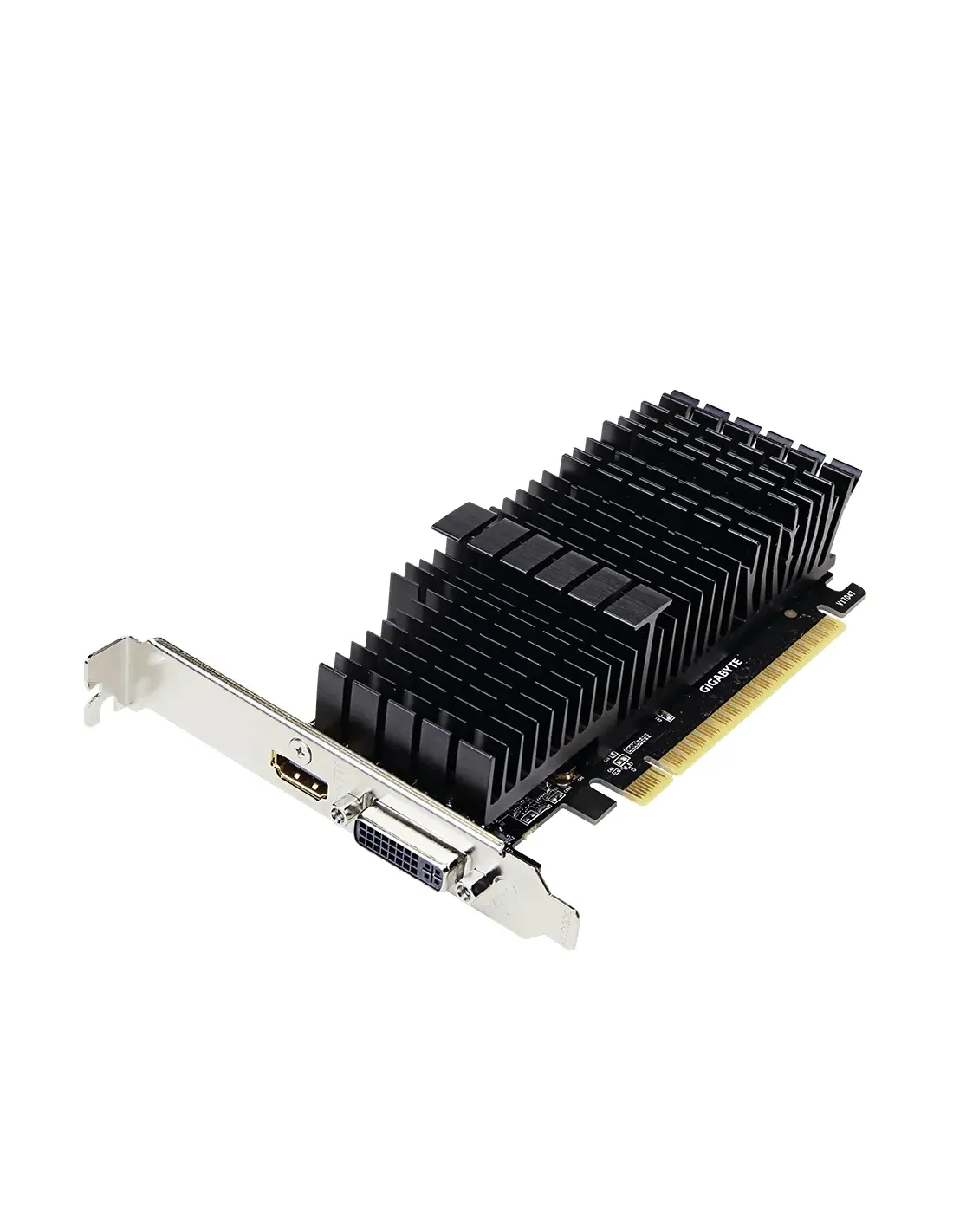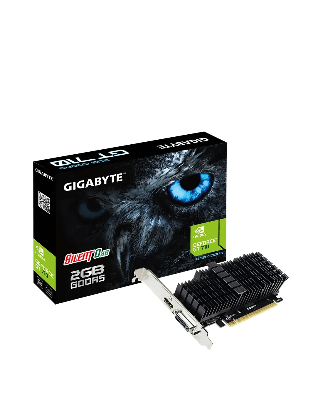 GIGABYTE GeForce GT 710 2GB. Familia de procesadores de gráficos: NVIDIA, Procesador gráfico: GeForce GT 710, Frecuencia del procesador: 954 MHz. Capacidad memoria de adaptador gráfico: 2 GB, Tipo de memoria de adaptador gráfico: GDDR5, Ancho de datos: 64 bit, Velocidad de memoria del reloj: 5010 MHz. Máxima resolución: 4096 x 2160 Pixeles. Versión DirectX: 12.0, Versión OpenGL: 4.5, Dual Link DVI. Tipo de interfaz: PCI Express 2.0. Tipo de enfriamiento: Pasivo