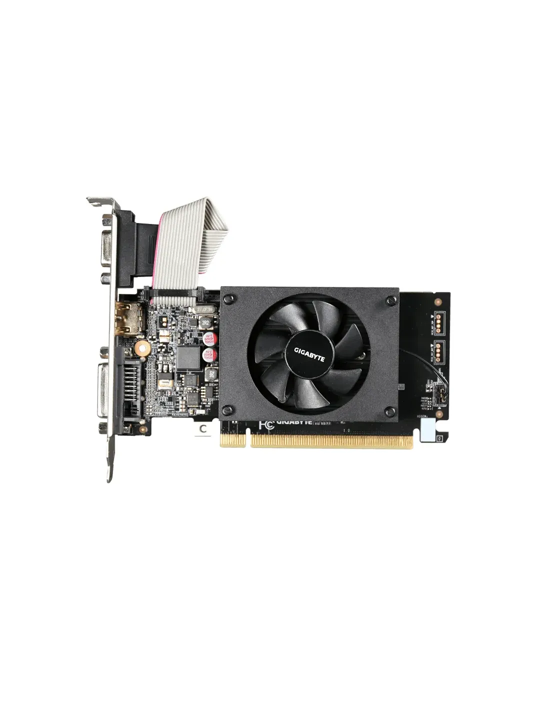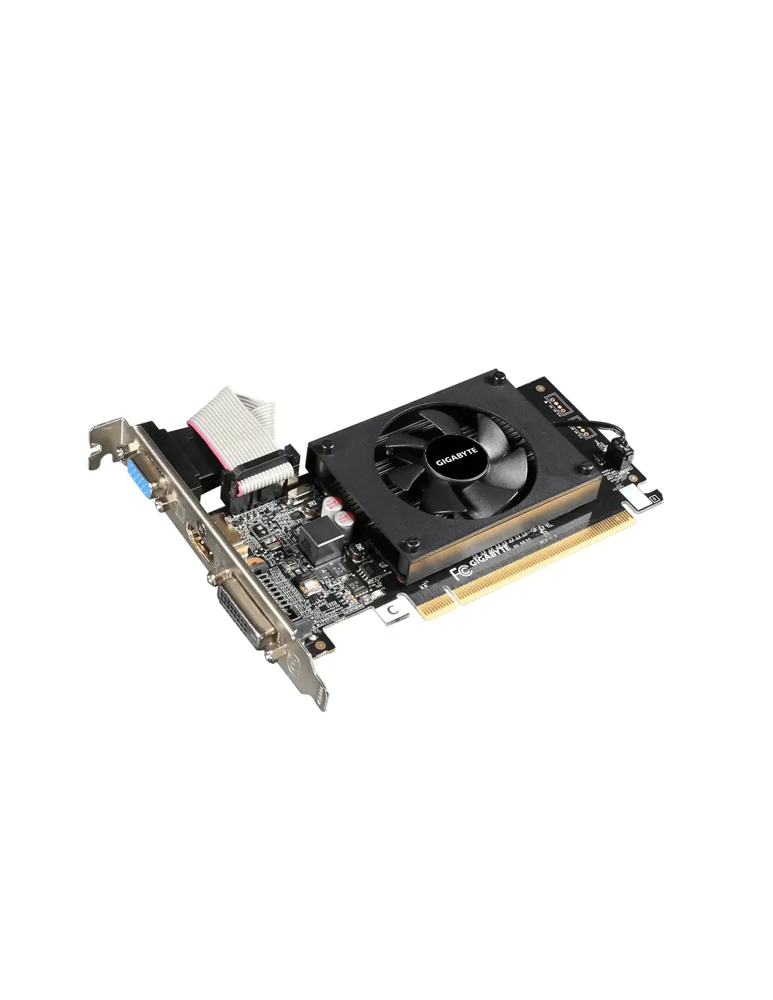 DESCRIPCIÓNGigabyte GeForce GT 710 2GB. Familia de procesadores de gráficos:NVIDIA, Procesador gráfico: GeForce GT 710, Frecuencia delprocesador: 954 MHz.Capacidad memoria de adaptador gráfico: 2 GB, Tipo de memoria deadaptador gráfico: GDDR3, Ancho de datos: 64 bit, Velocidad dememoria del reloj: 1600 MHz. Máxima resolución: 4096 x 2160 Pixeles.Versión DirectX: 12.0, Versión OpenGL: 4.5, Dual Link DVI. Tipo deinterfaz: PCI Express 2.0.Tipo de enfriamiento: Activo ESPECIFICACIONES TÉCNICASPeso y dimensionesAltura21 mmAncho68 mmProfundidad144 mmProcesadorCUDASiNúcleos CUDA192Familia de procesadores de gráficosNVIDIAFrecuencia del procesador954 MHzMáxima resolución4096 x 2160 PixelesMáximas pantallas por tarjeta de video3Procesador gráficoGeForce GT 710Resolución (máxima analógica)2048 x 1536 PixelesResolución (máxima digital)4096 x 2160 PixelesMemoriaAncho de datos64 bitAncho de banda de memoria (max)14,4 GB/sCapacidad memoria de adaptador gráfico2 GBTipo de memoria de adaptador gráficoGDDR3Velocidad de memoria del reloj1600 MHzVelocidad de transferencia de datos1,8 Gbit/sPuertos e InterfacesCantidad de puertos DVI-D1Cantidad de puertos VGA (D-Sub)1Número de puertos HDMI1Tipo de interfazPCI Express 2.0Control de energíaSuministro de energía al sistema mínimo300 WDesempeñoDual Link DVISiVersión DirectX12.0HDCPSiVersión OpenGL4.5PhysXSiDiseñoColor del productoNegroNúmero de ranuras2Tipo de enfriamientoActivo
